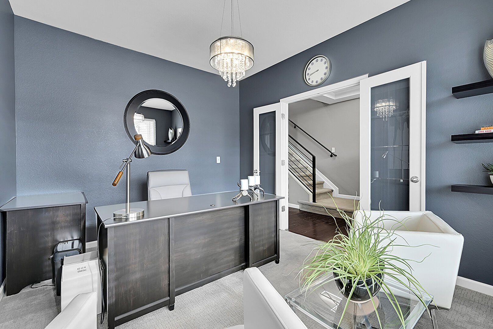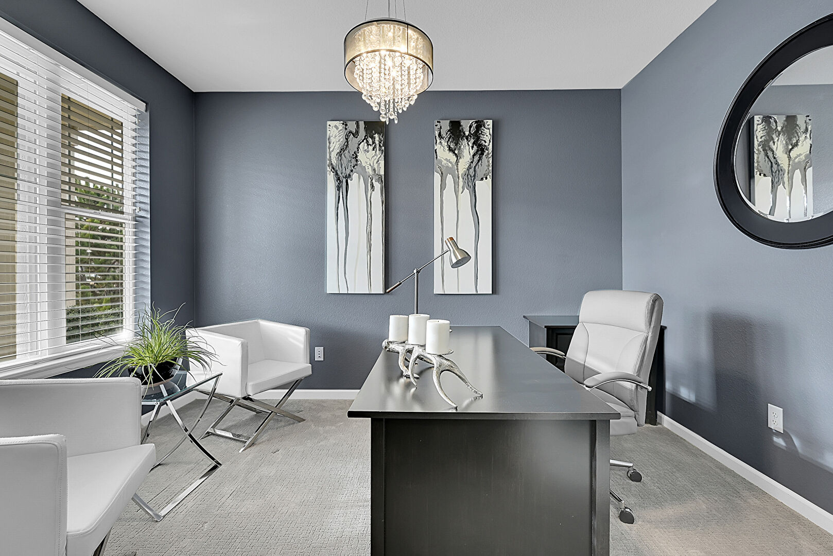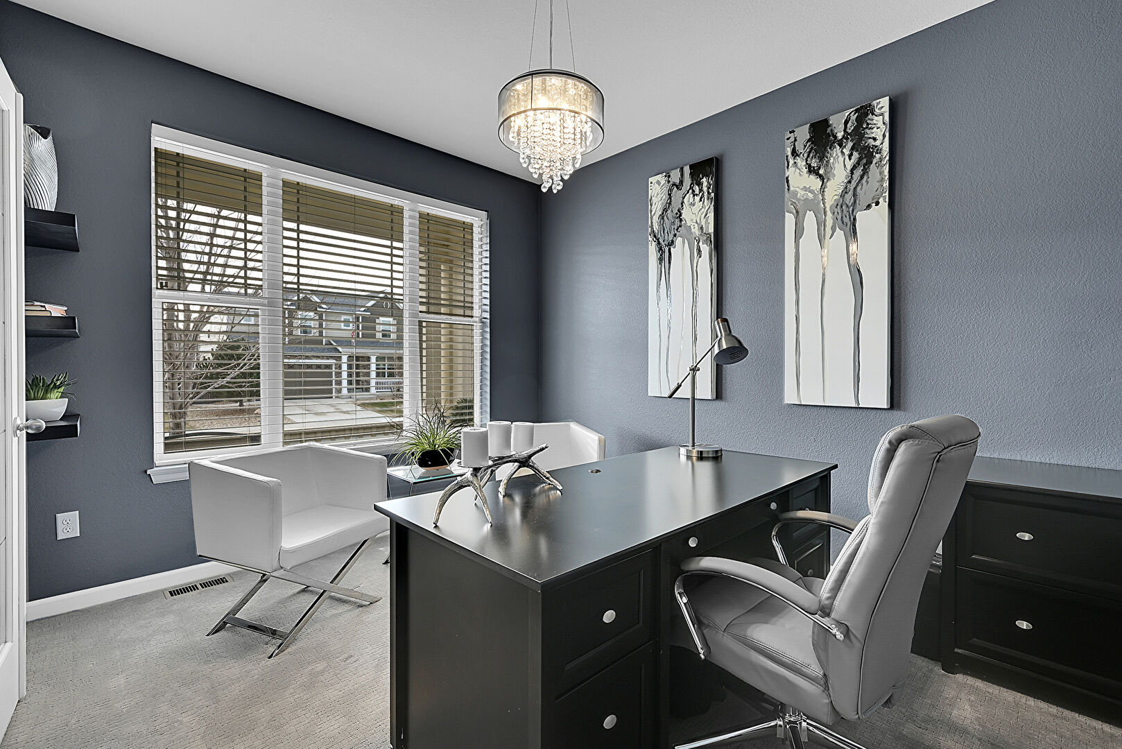 Baseboards Wall, Carpet, Drywall, Natural Light, Office Area, Textured Wall, Vent, Notable Chandelier