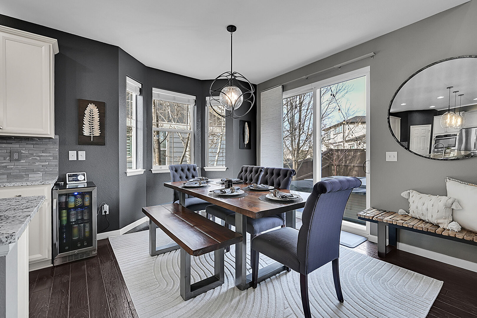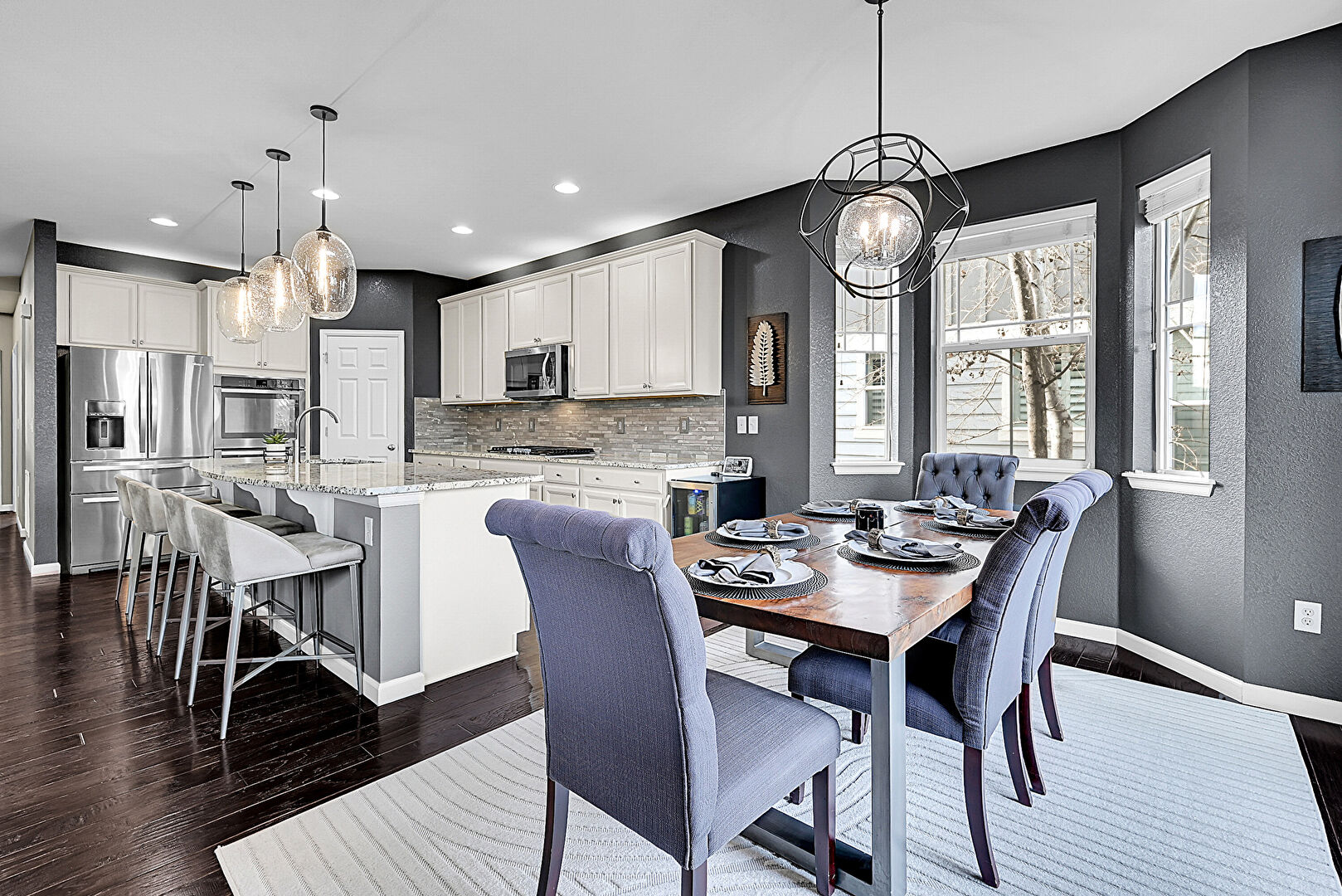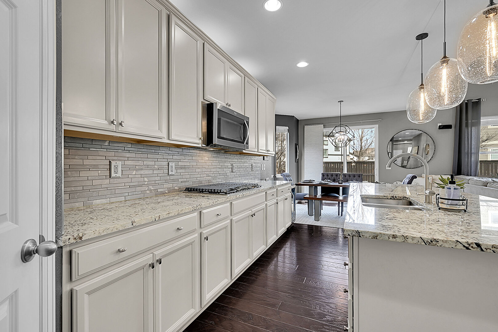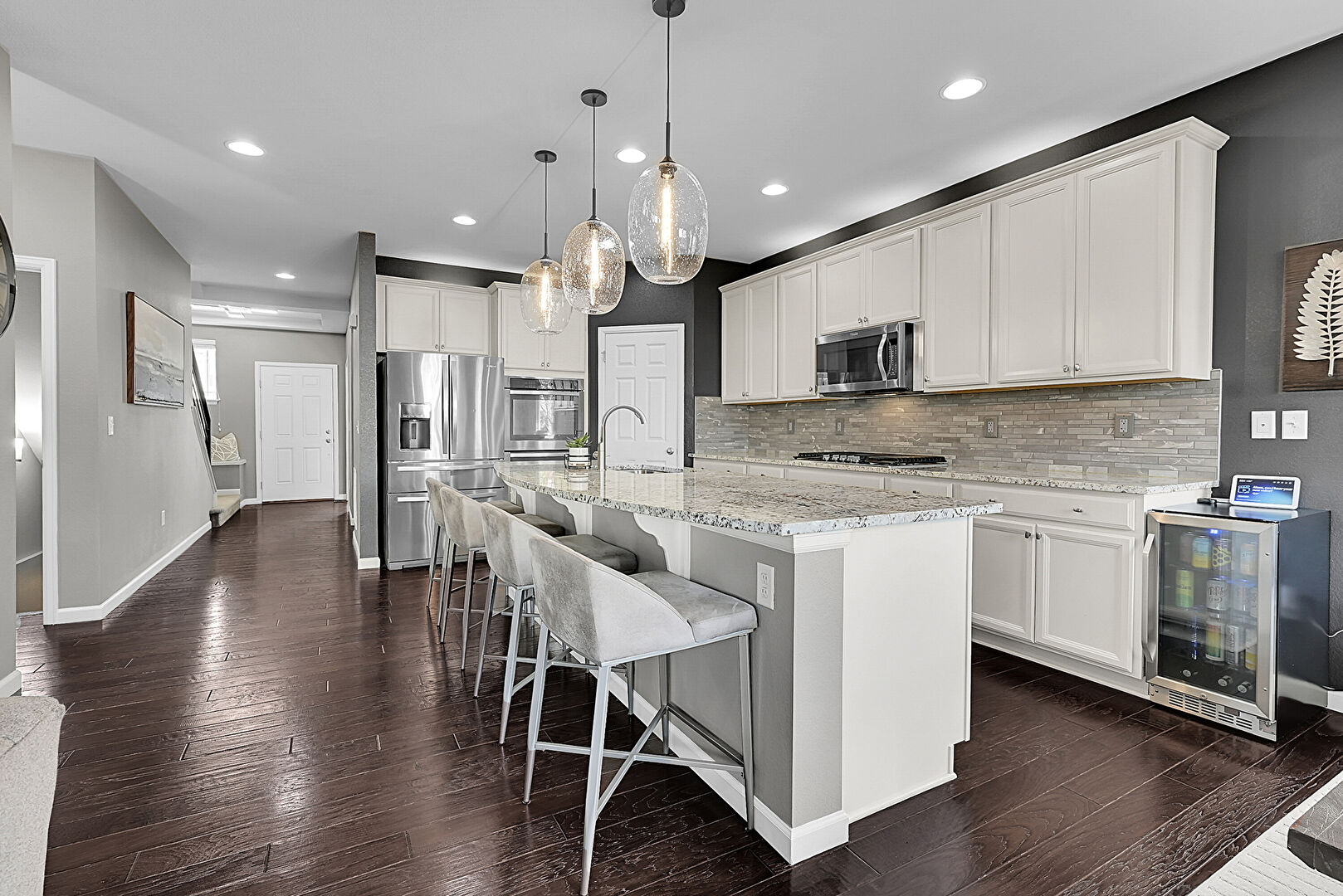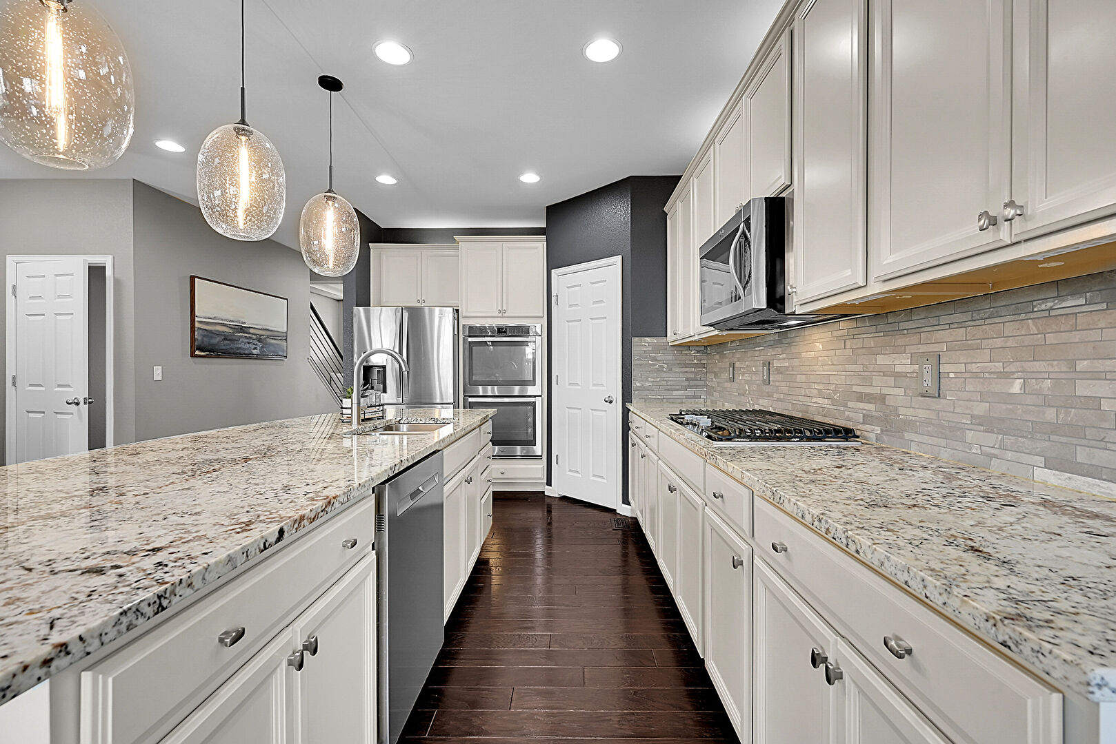 Baseboards Wall, Crown Molding Cabinets, Double Oven, Drywall, Kitchen Bar, Kitchen Island, L Shaped Kitchen, Natural Light, Notable Chandelier, Pendant Lighting, Recessed Lighting, Shaker Cabinets, Stone Countertops, Wine Cooler, Wood Finish Floor, Double Oven, Drywall, Natural Light, Pendant Lighting