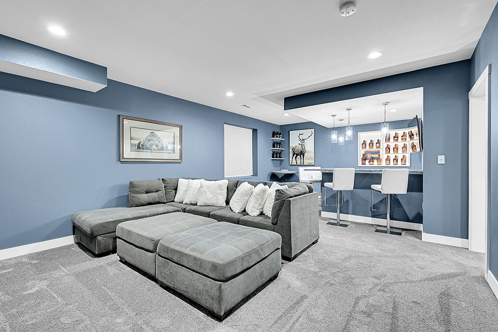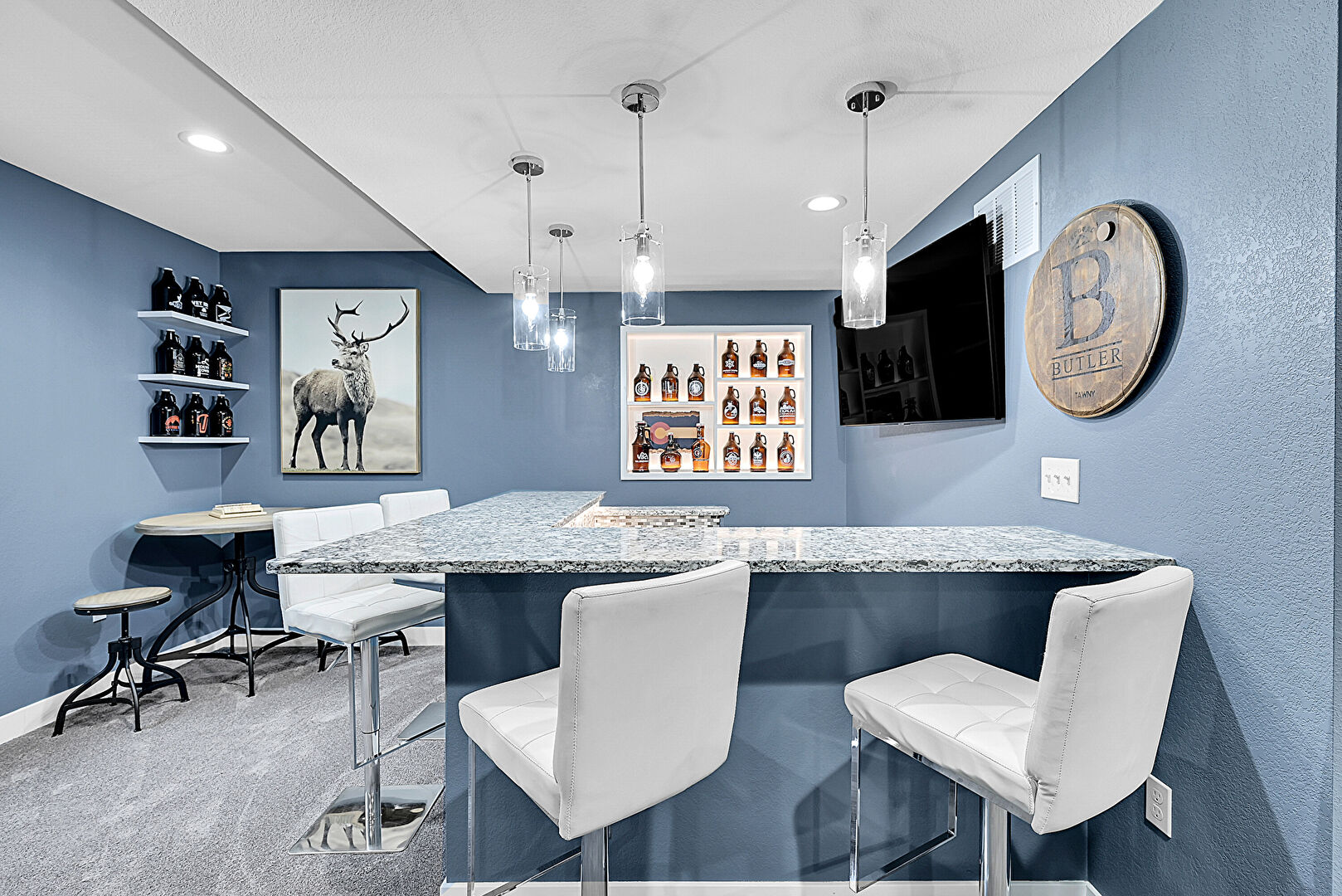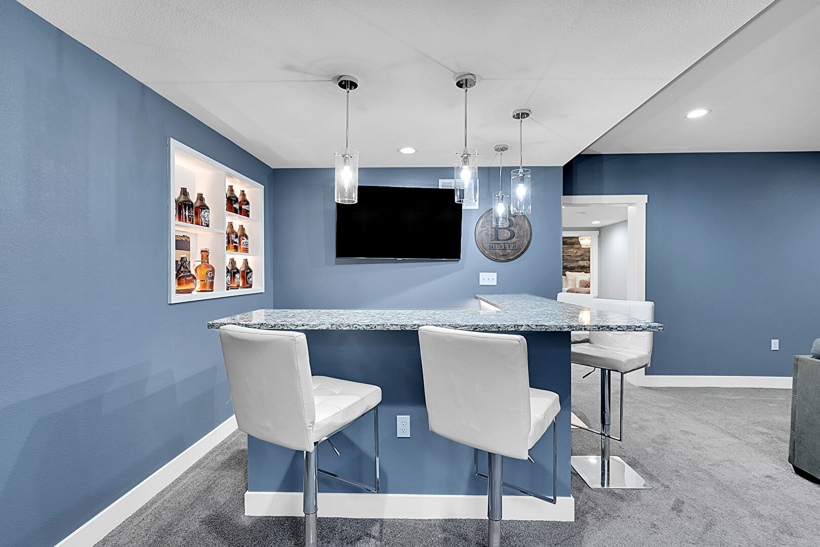 Baseboards Wall, Blue Cabinets, Carpet, Drywall, Indoor Bar, Pendant Lighting, Recessed Lighting, Stone Countertops, Textured Wall, Baseboards Wall, Pendant Lighting