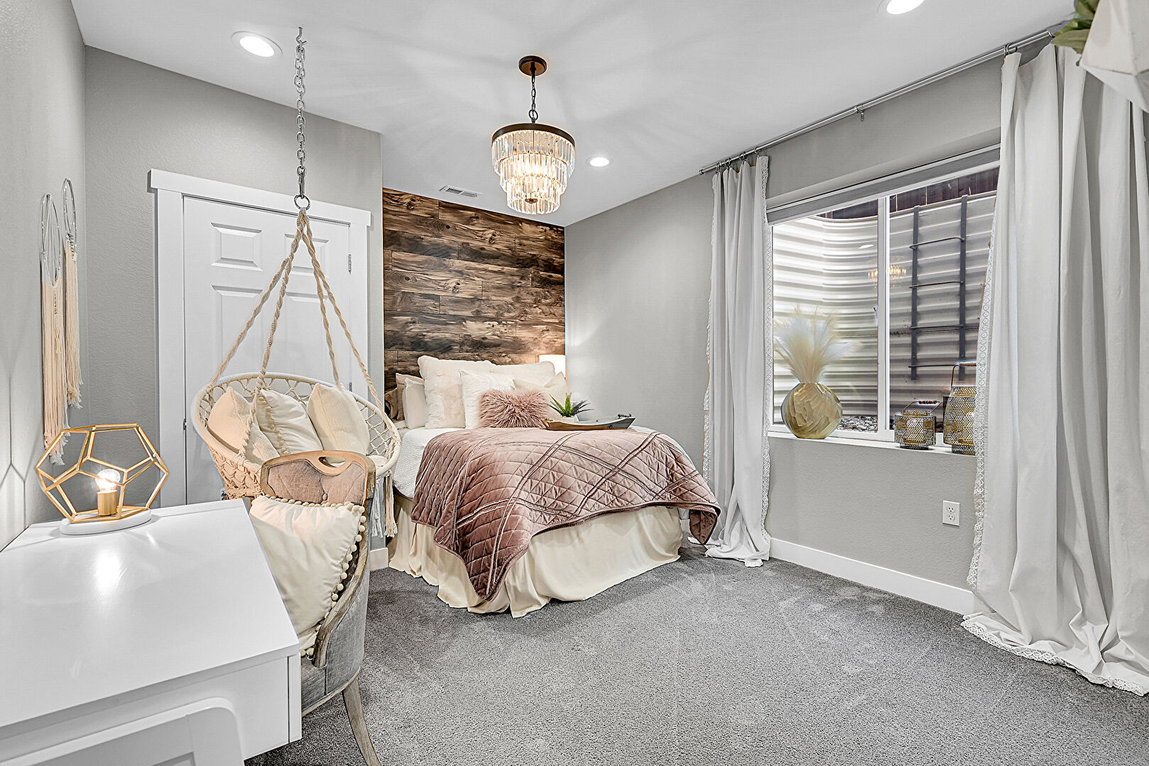 Accent Wall, Baseboards Wall, Carpet, Natural Light, Notable Chandelier, Recessed Lighting, Vent, Wood Wall, Drywall