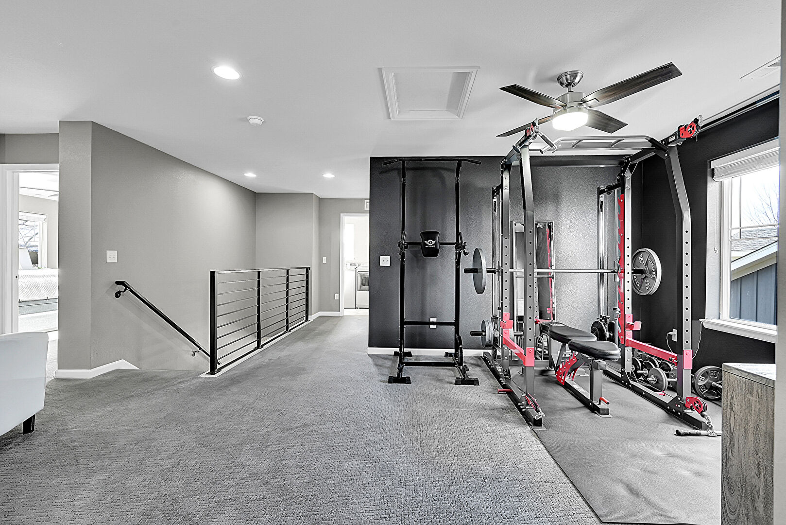 Baseboards Wall, Carpet, Ceiling Fan, Drywall, Natural Light, Recessed Lighting, Scuttle, Textured Wall, Vent, Ceiling Fan, Drywall, Recessed Lighting