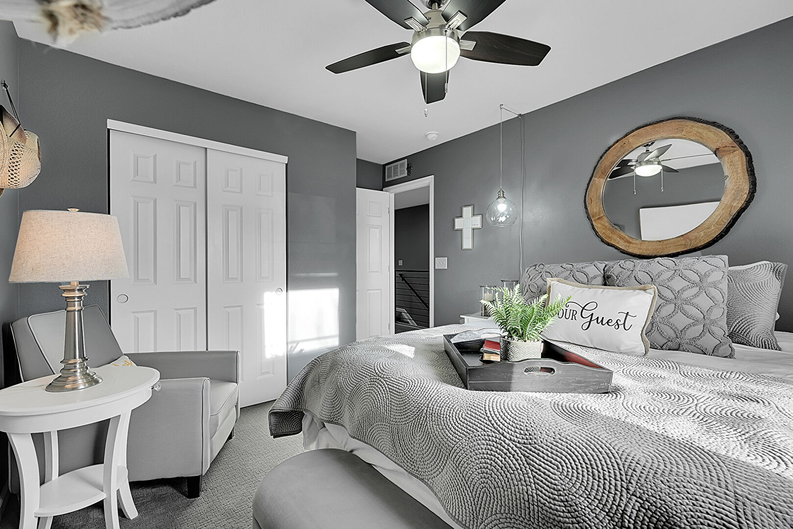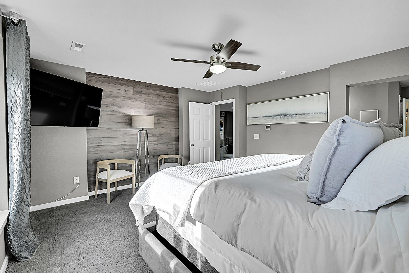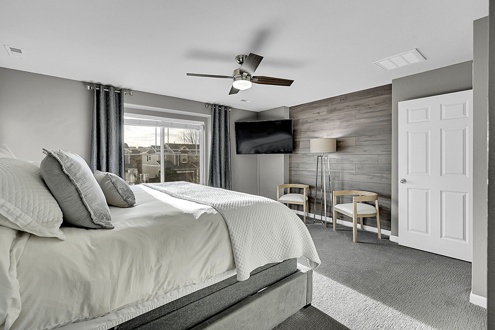 Accent Wall, Baseboards Wall, Carpet, Ceiling Fan, Drywall, Natural Light, Vent, Wood Wall, Baseboards Wall, Ceiling Fan