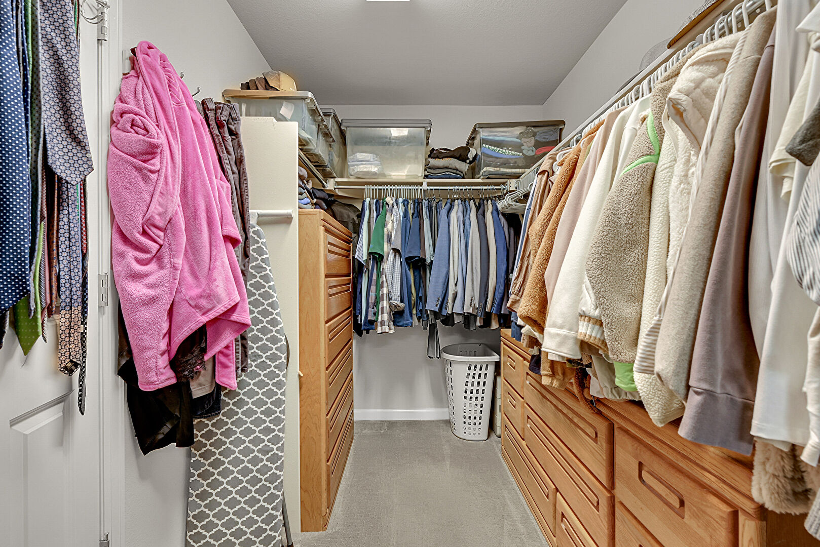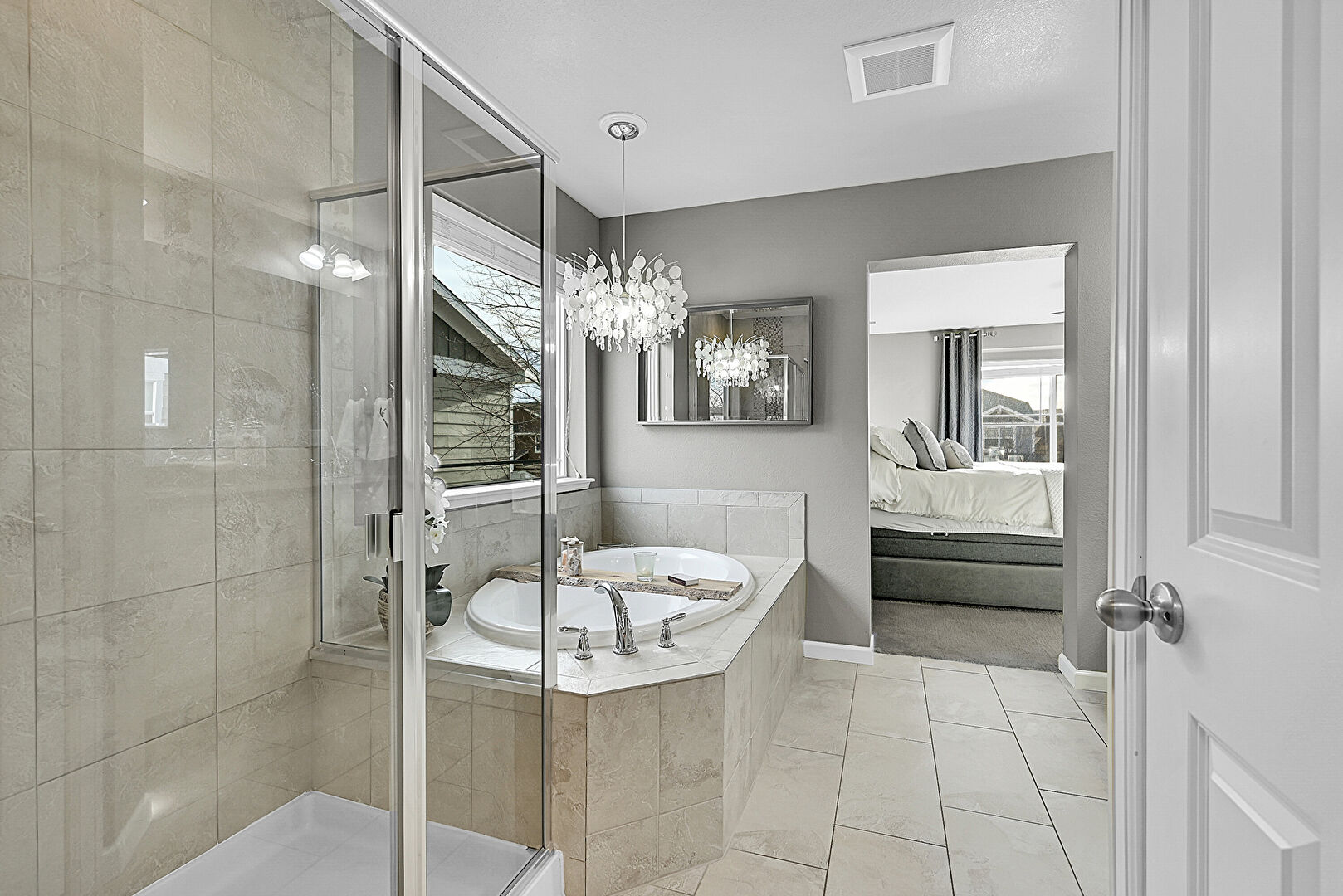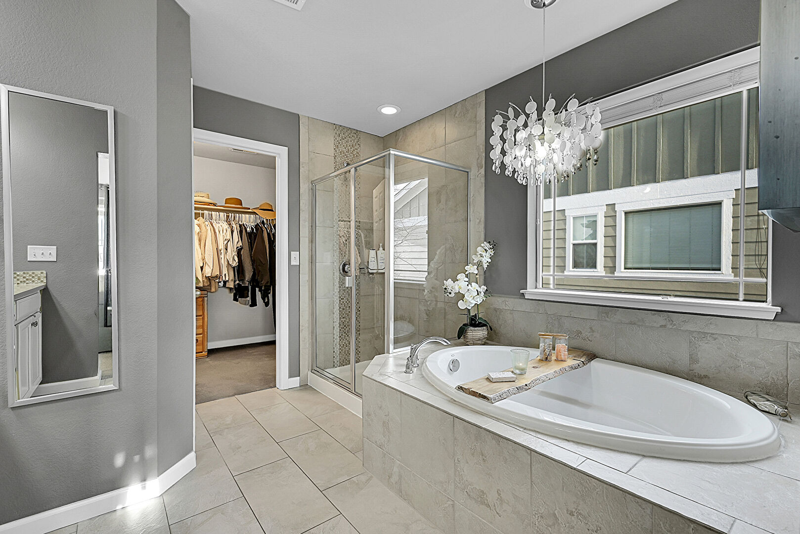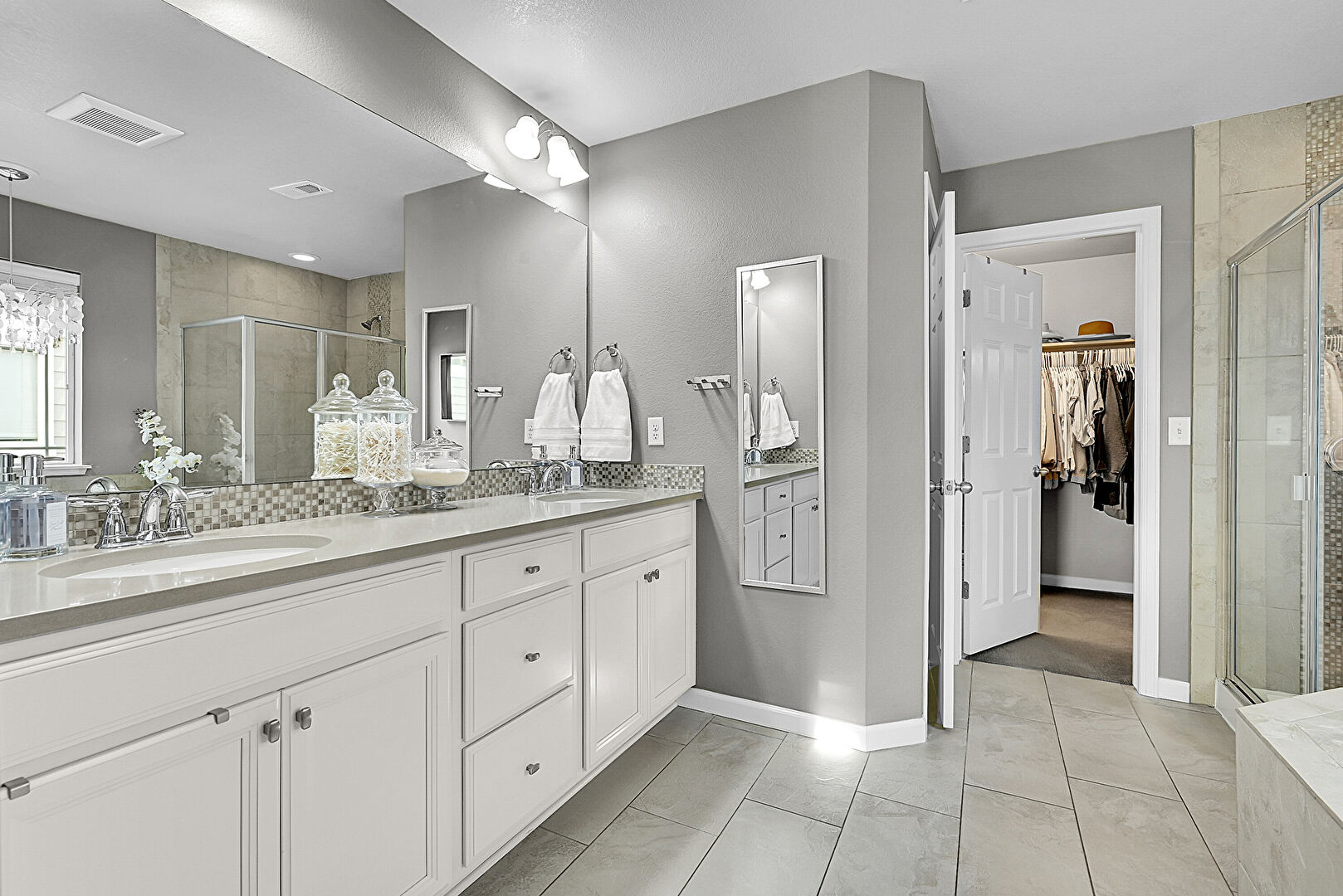 Baseboards Wall, Double Vanity, Drywall, Ensuite Bathroom, Full Bathroom, Natural Light, Notable Chandelier, Recessed Lighting, Tile Floor, Vanity, Vent, Walk In Closet, Baseboards Wall, Vent, Walk In Closet