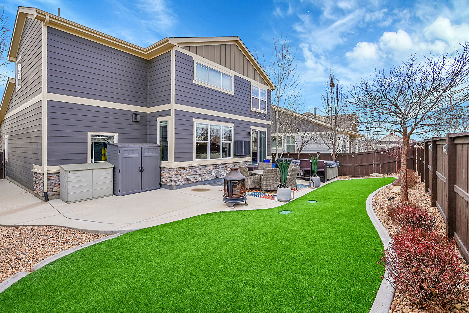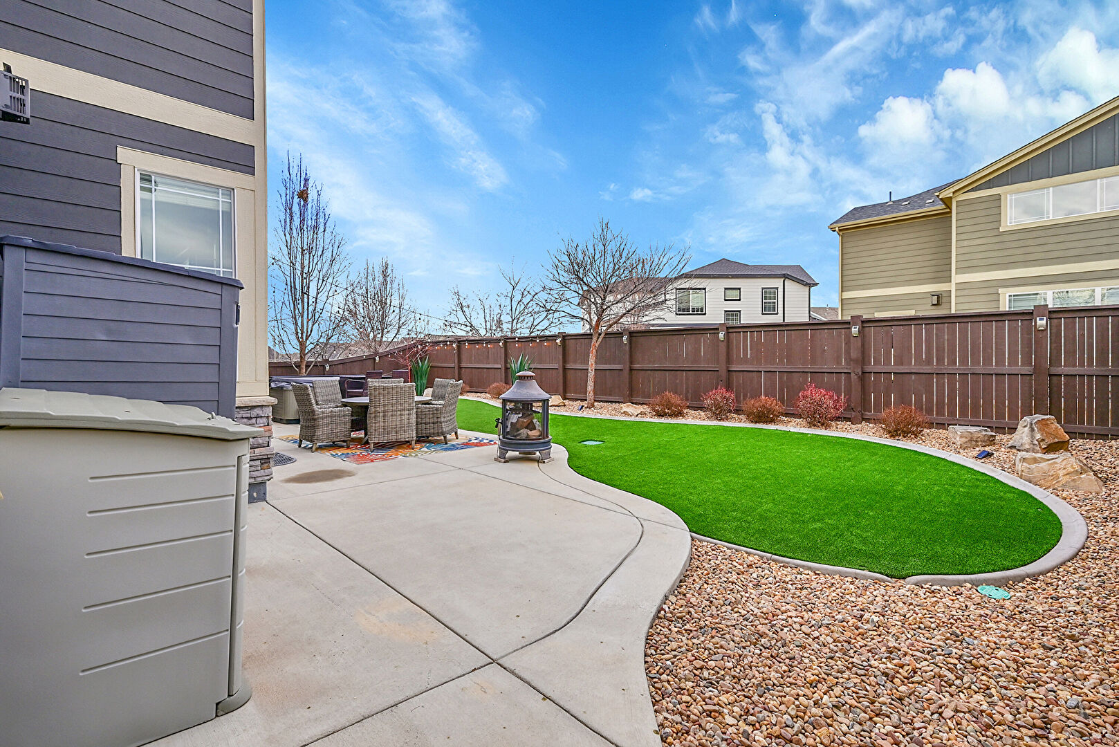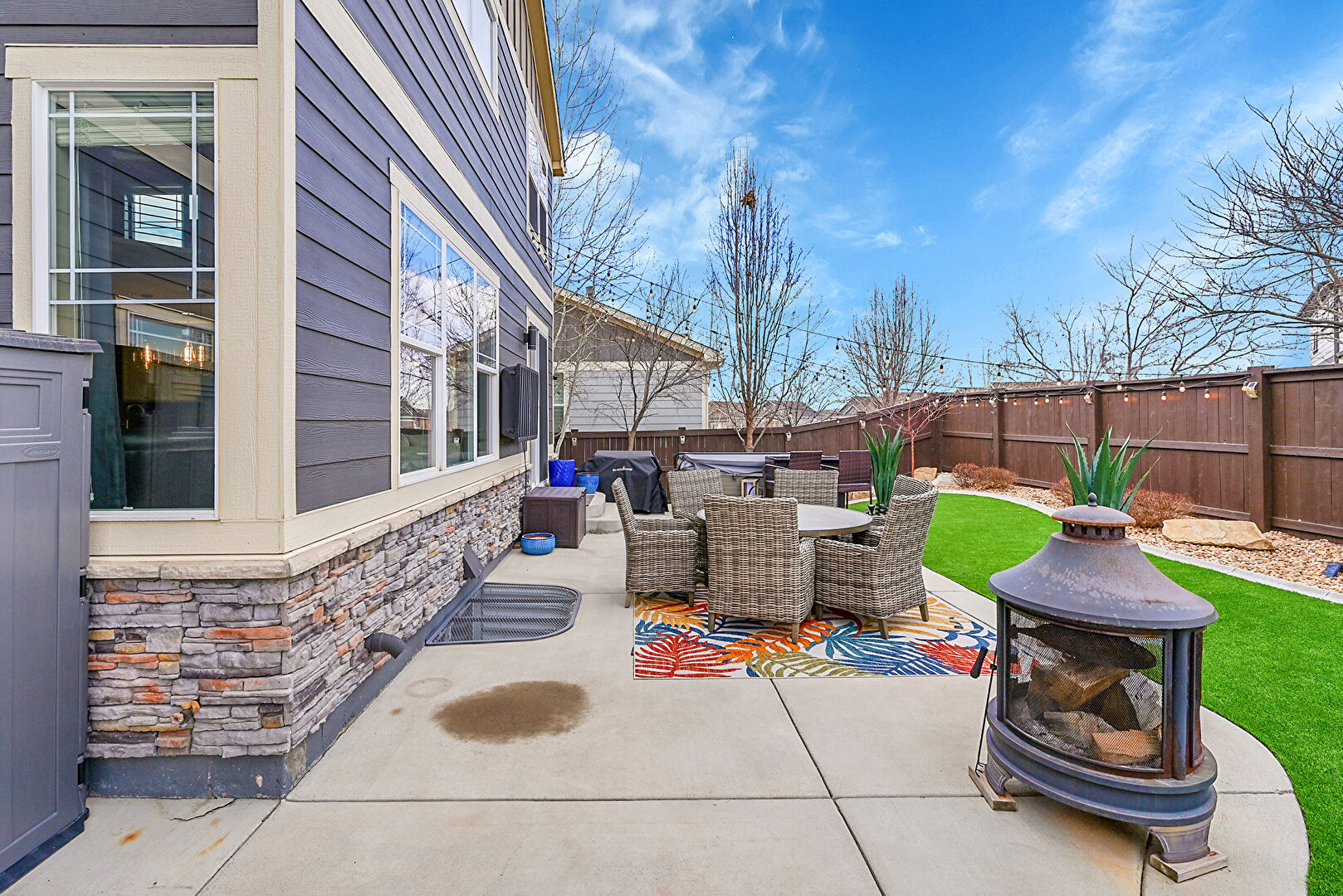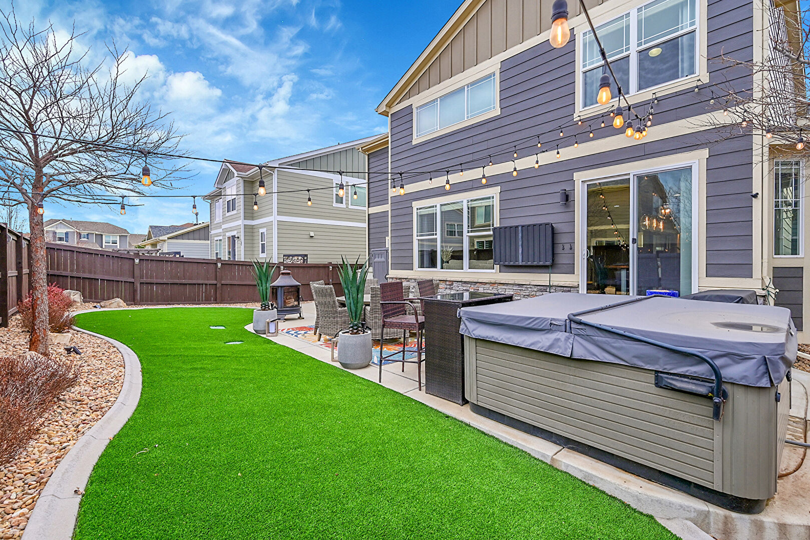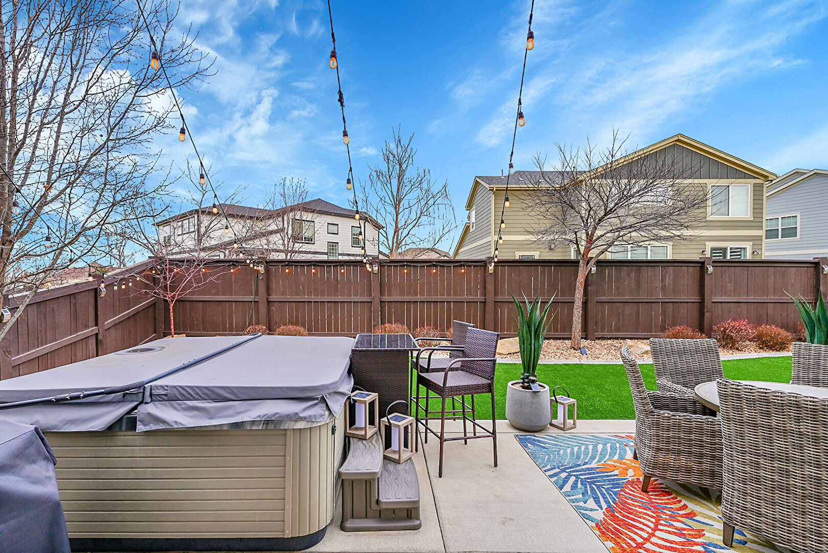 Fence, Fire Pit, Hot Tub, Lawn, Outdoor Dining Area, Outdoor Living Space, Patio, Residential View, Lawn, Outdoor Dining Area, Porch