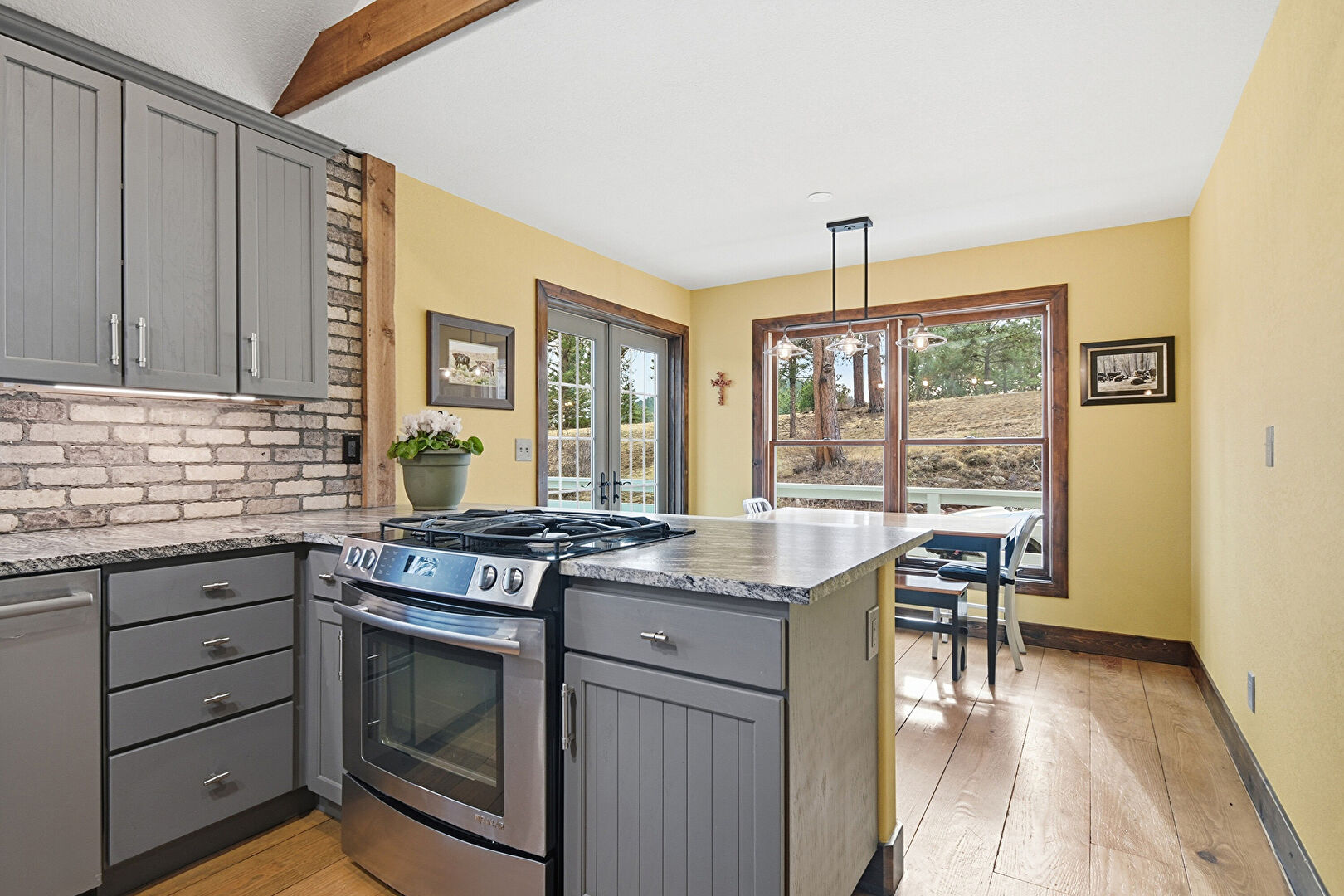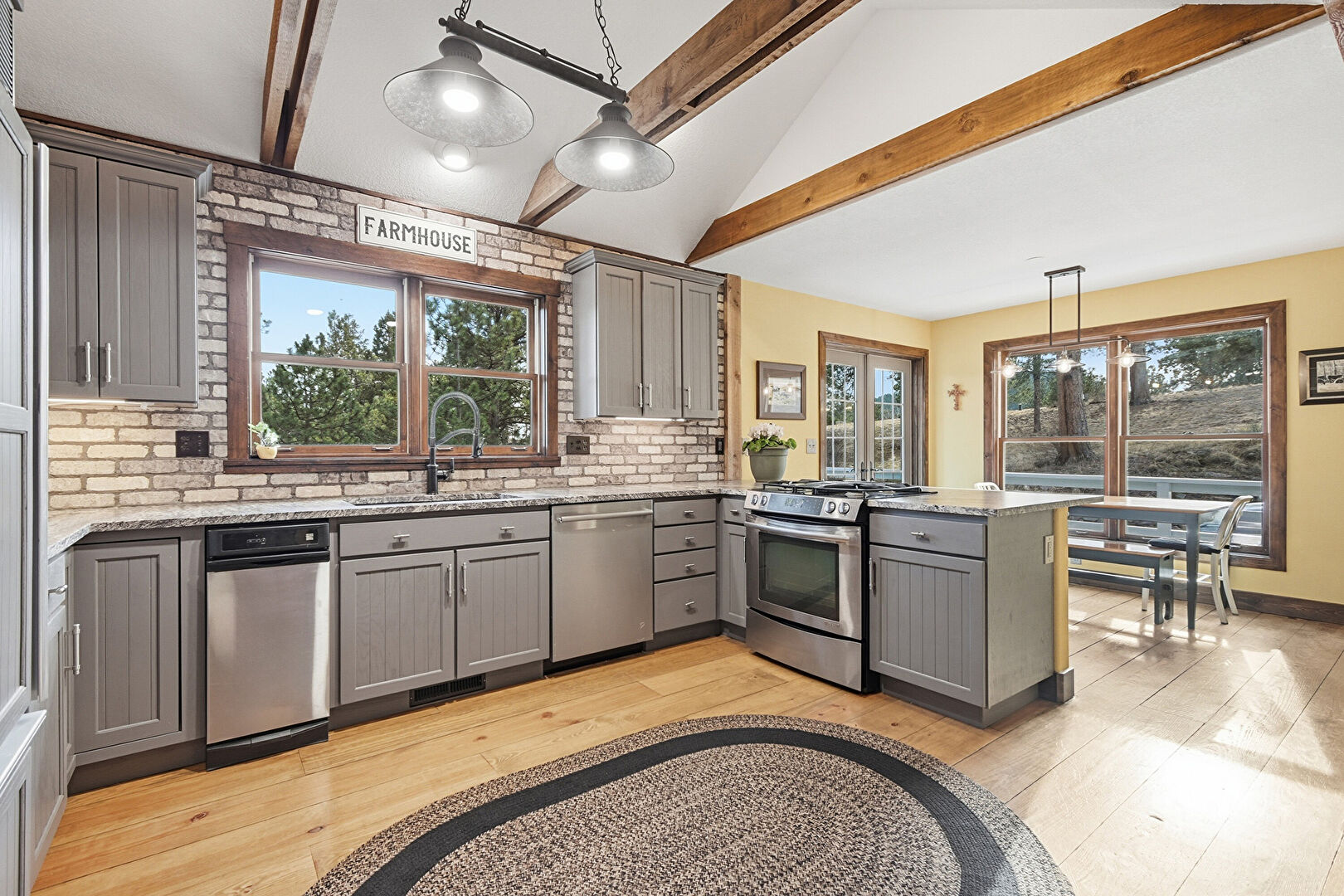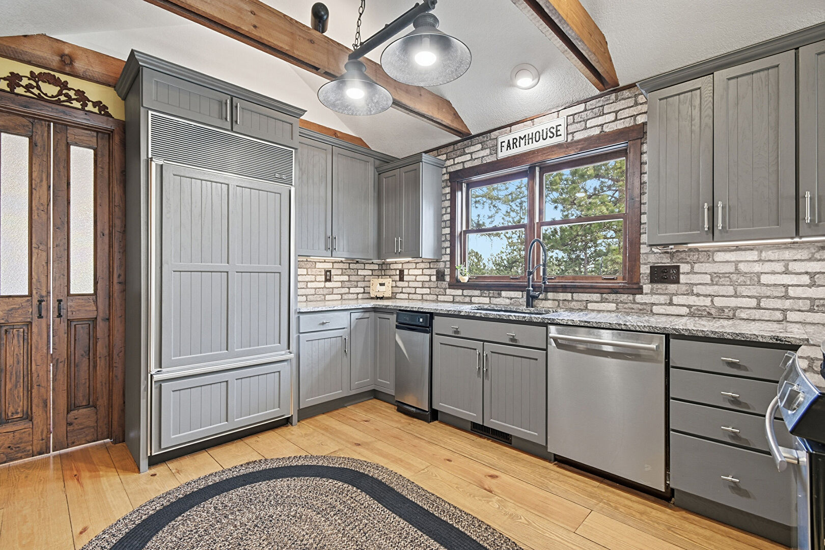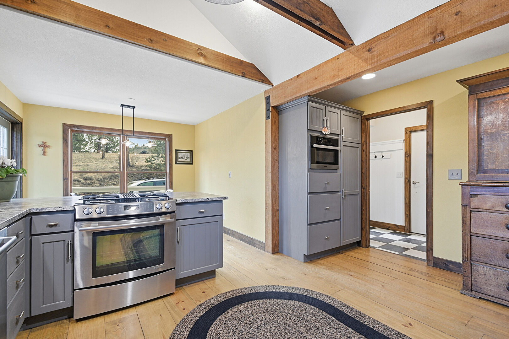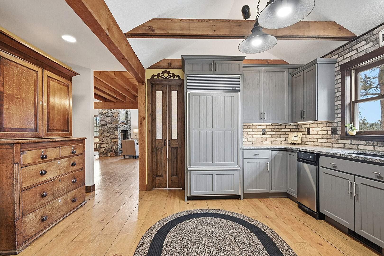 Baseboards Wall, Beamed Ceiling, Crown Molding Cabinets, Drywall, French Doors, Gray Cabinets, High Ceiling, Kitchen Peninsula, Natural Light, Notable Chandelier, Pendant Lighting, Recessed Lighting, Shaker Cabinets, Stone Countertops, Trash Compactor, Vaulted Ceiling, Vent, Wood Finish Floor, Drywall, Kitchen Peninsula, Stone Countertops, Trash Compactor, Wood Finish Floor