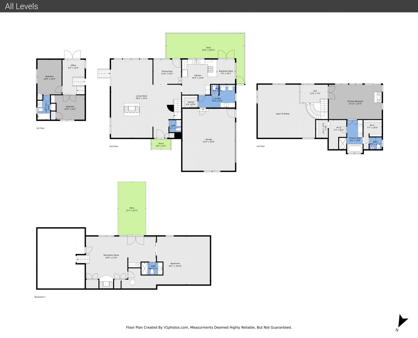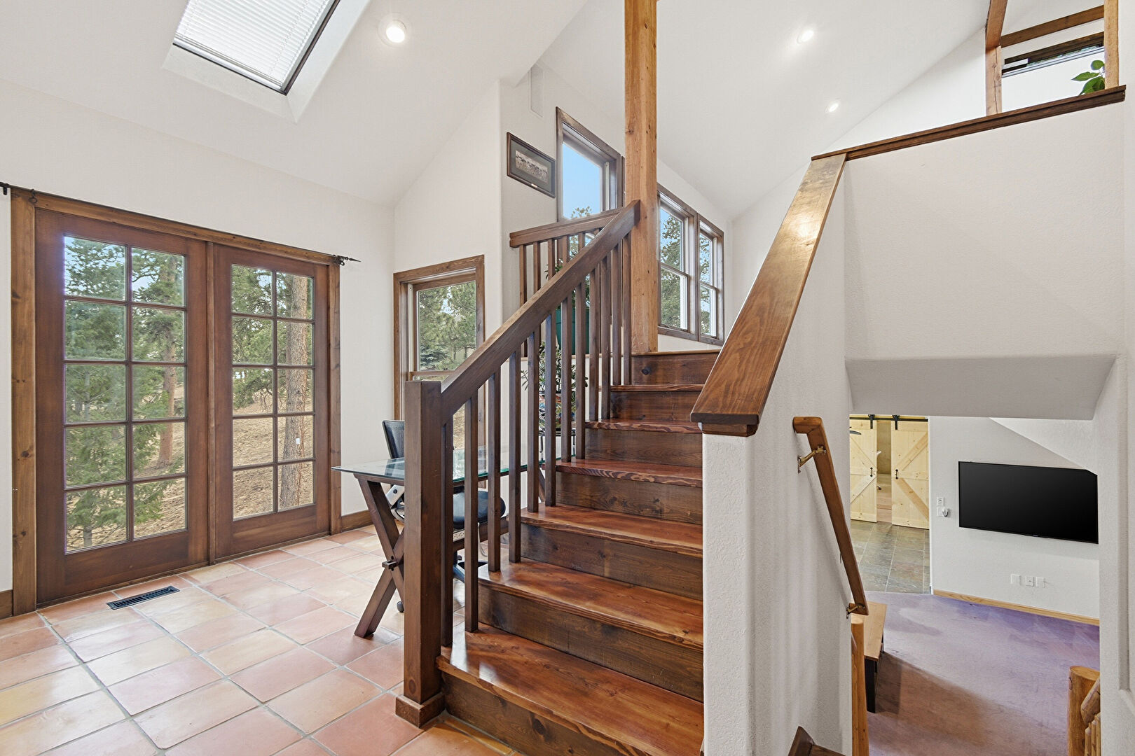 Baseboards Wall, Beamed Ceiling, Drywall, French Doors, High Ceiling, Natural Light, Recessed Lighting, Skylight, Stairs, Tile Floor, Vent, Drywall, Natural Light, Stairs