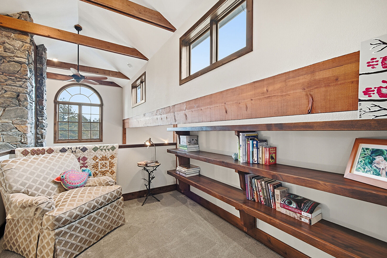 Beamed Ceiling, Carpet, Cathedral Ceiling, Ceiling Fan, Drywall, High Ceiling, Natural Light, Vaulted Ceiling, Baseboards Wall