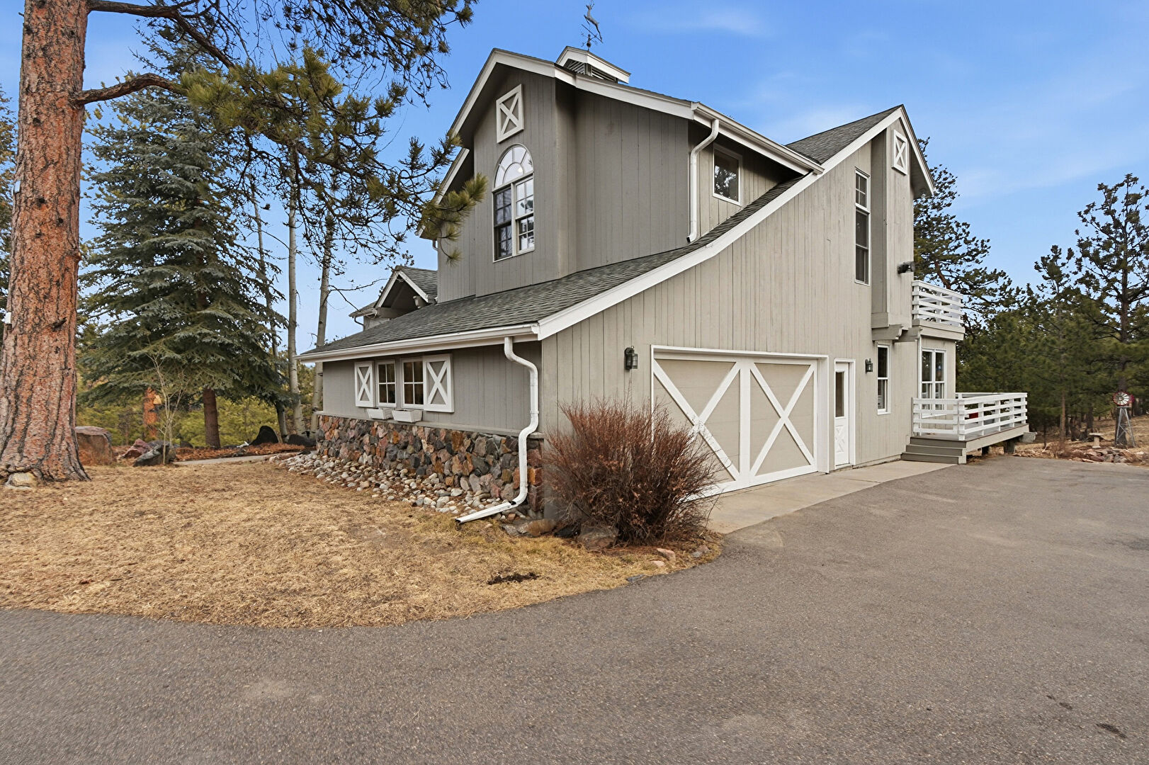 Built In Garage, Downspout, Driveway, Gutters, Shingle Roof, Stone Siding, Vertical Siding
