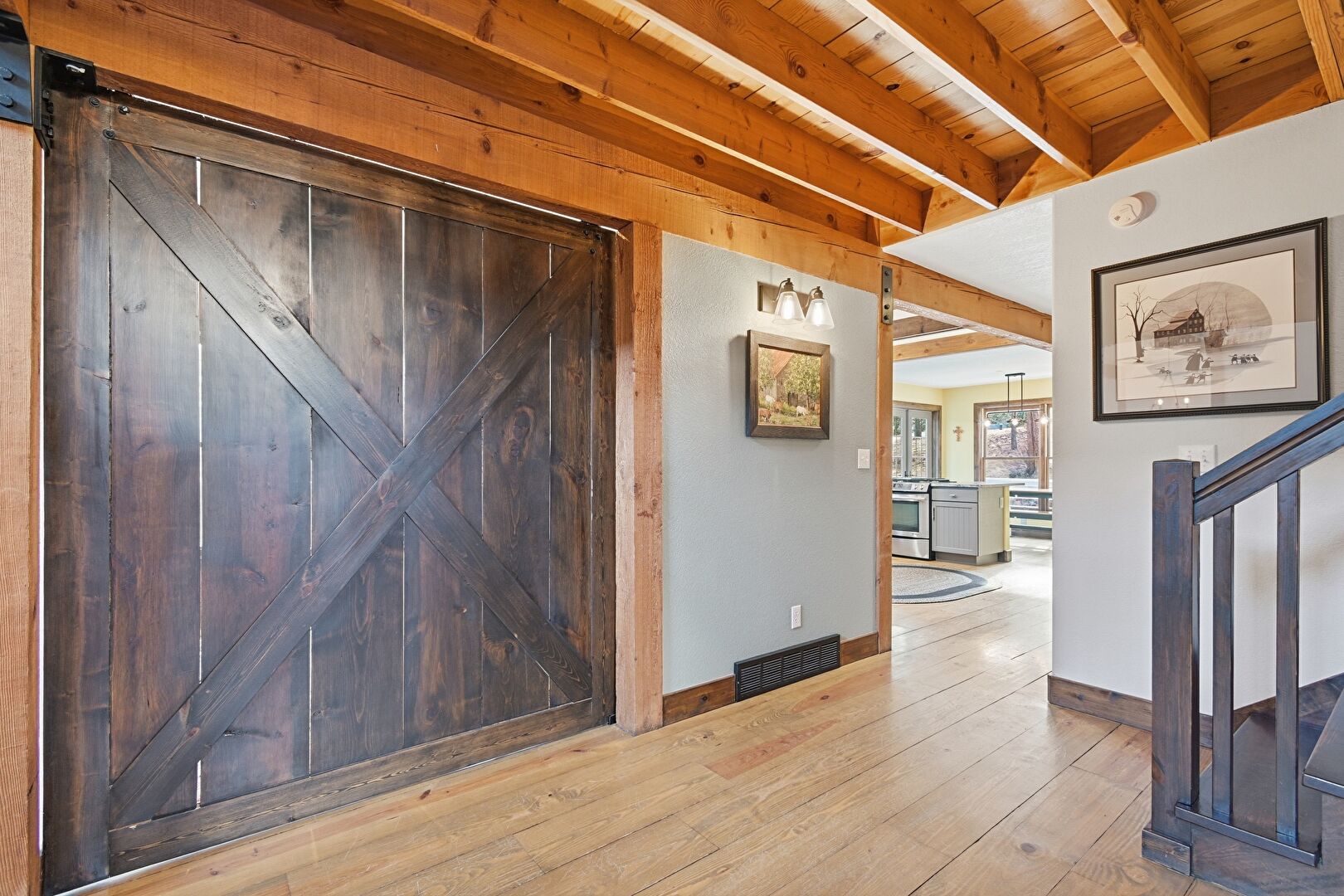 Barn Door, Baseboards Wall, Drywall, French Doors, High Ceiling, Natural Light, Notable Chandelier, Vaulted Ceiling, Vent, Wood Finish Floor, Wood Wall, Drywall, High Ceiling, Wood Finish Floor