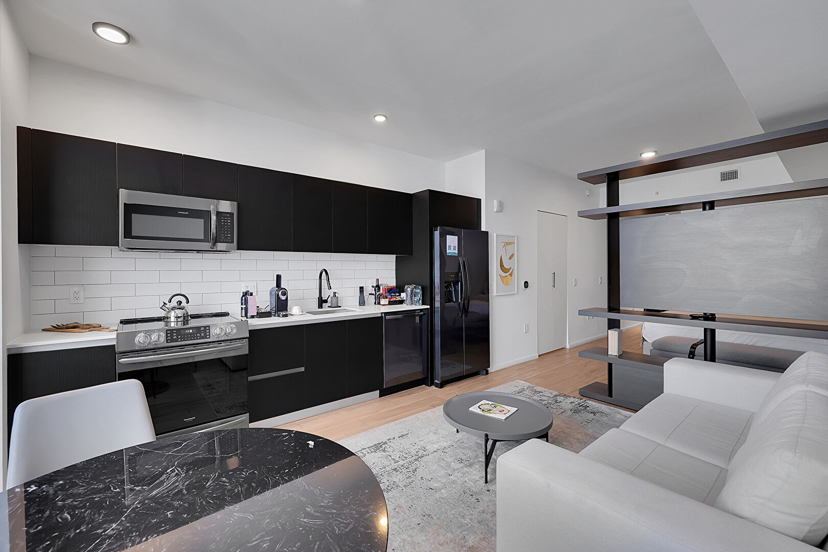 Black Cabinets, City View, Drywall, Flat Panel Cabinets, Floor Ceiling Windows, Natural Light, One Wall Kitchen, Open Shelves, Opens To Living Area, Recessed Lighting, Stone Countertops, Vent, Wood Finish Floor, Natural Light, Recessed Lighting, Vent, Water View
