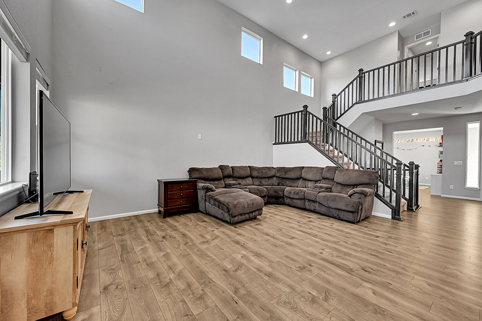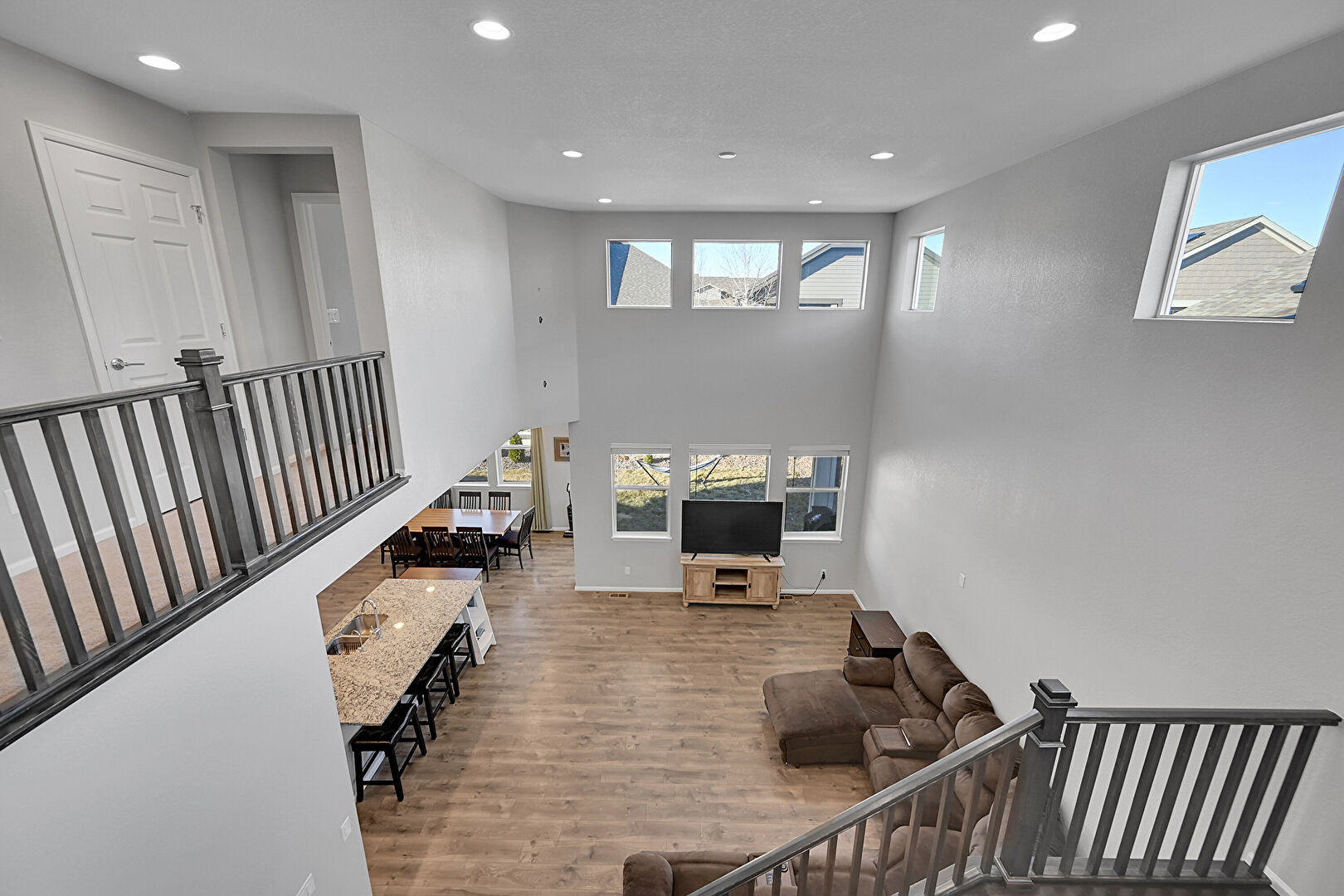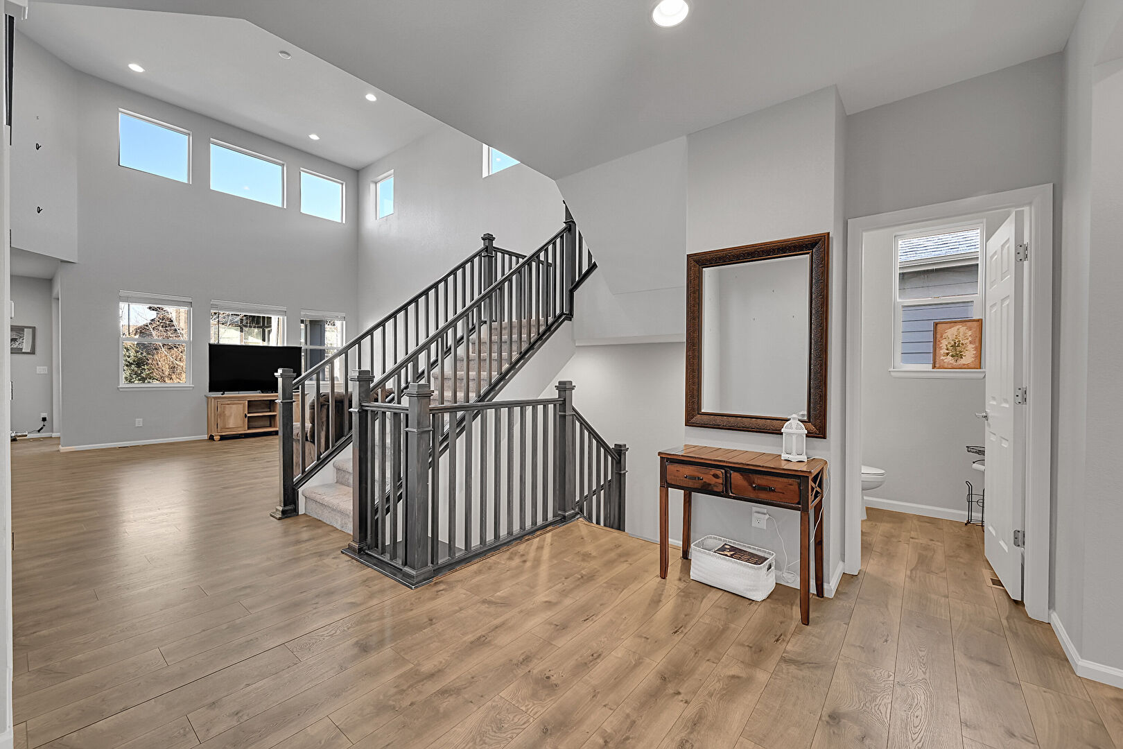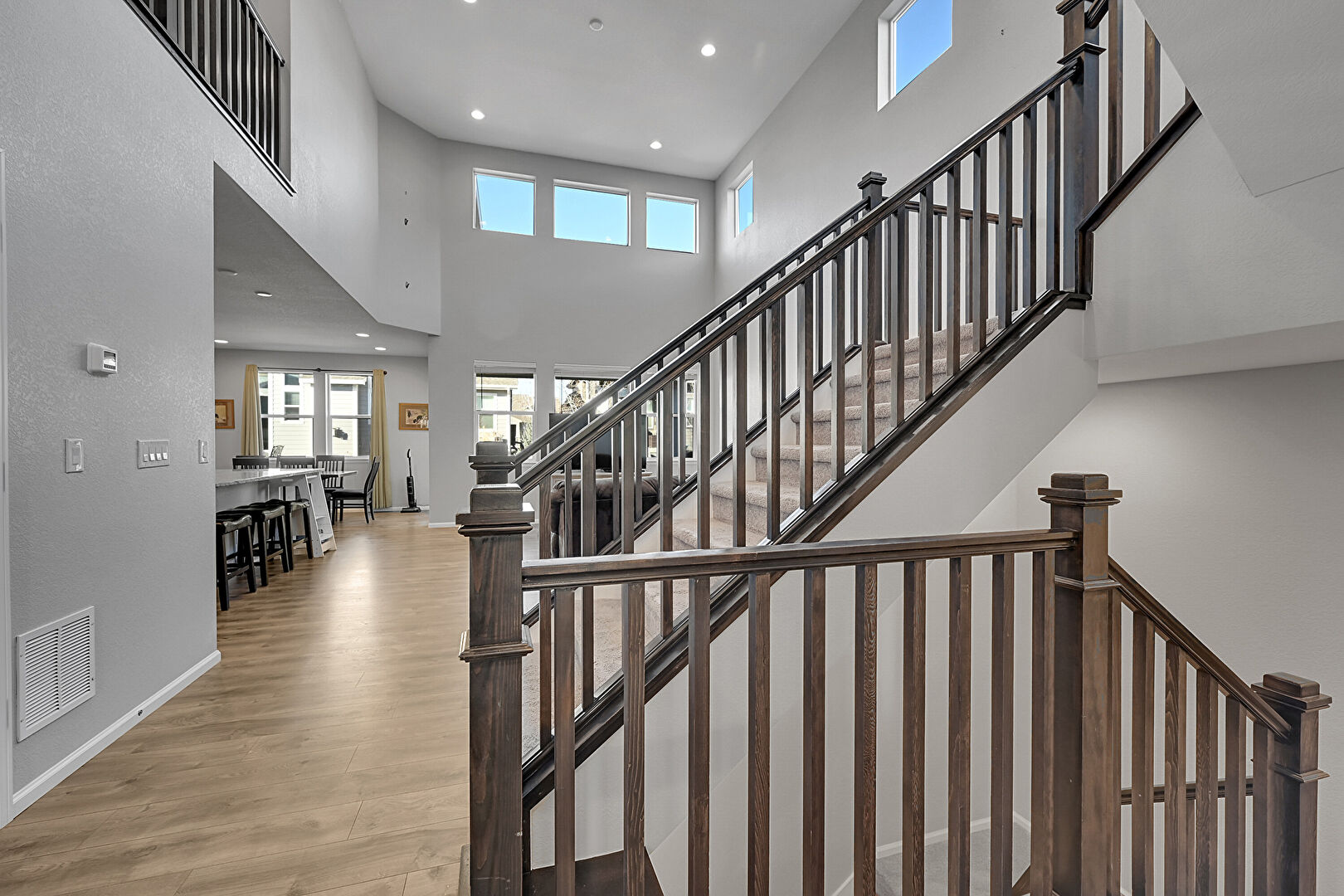 Baseboards Wall, Drywall, High Ceiling, Natural Light, Recessed Lighting, Stairs, Vent, Wood Finish Floor, Natural Light, Wood Finish Floor