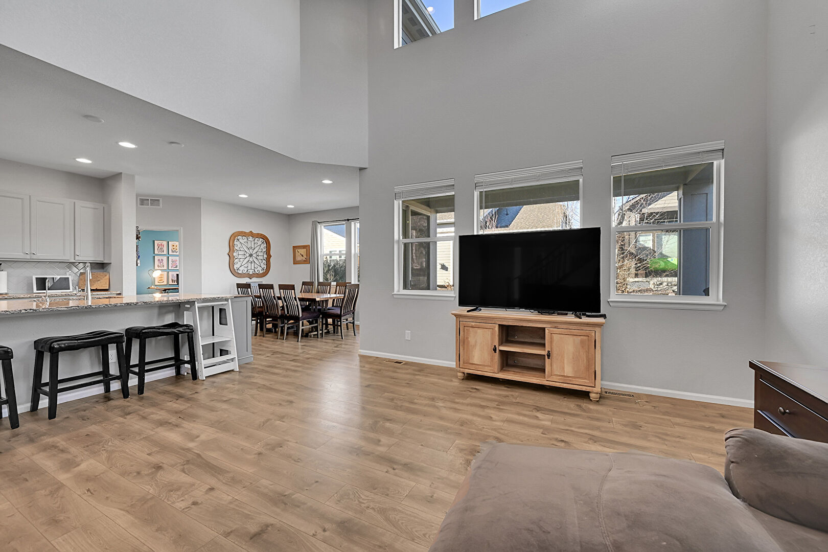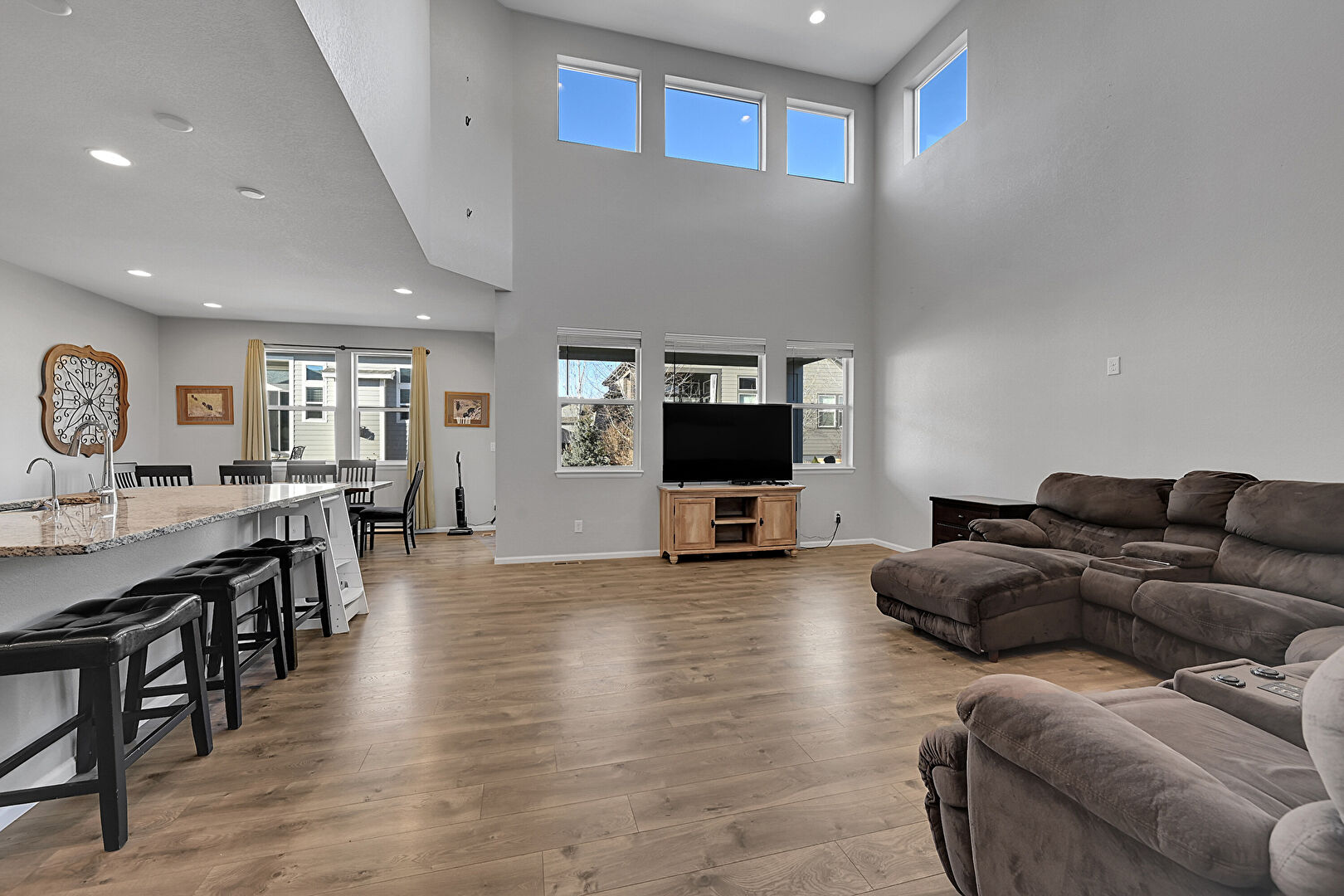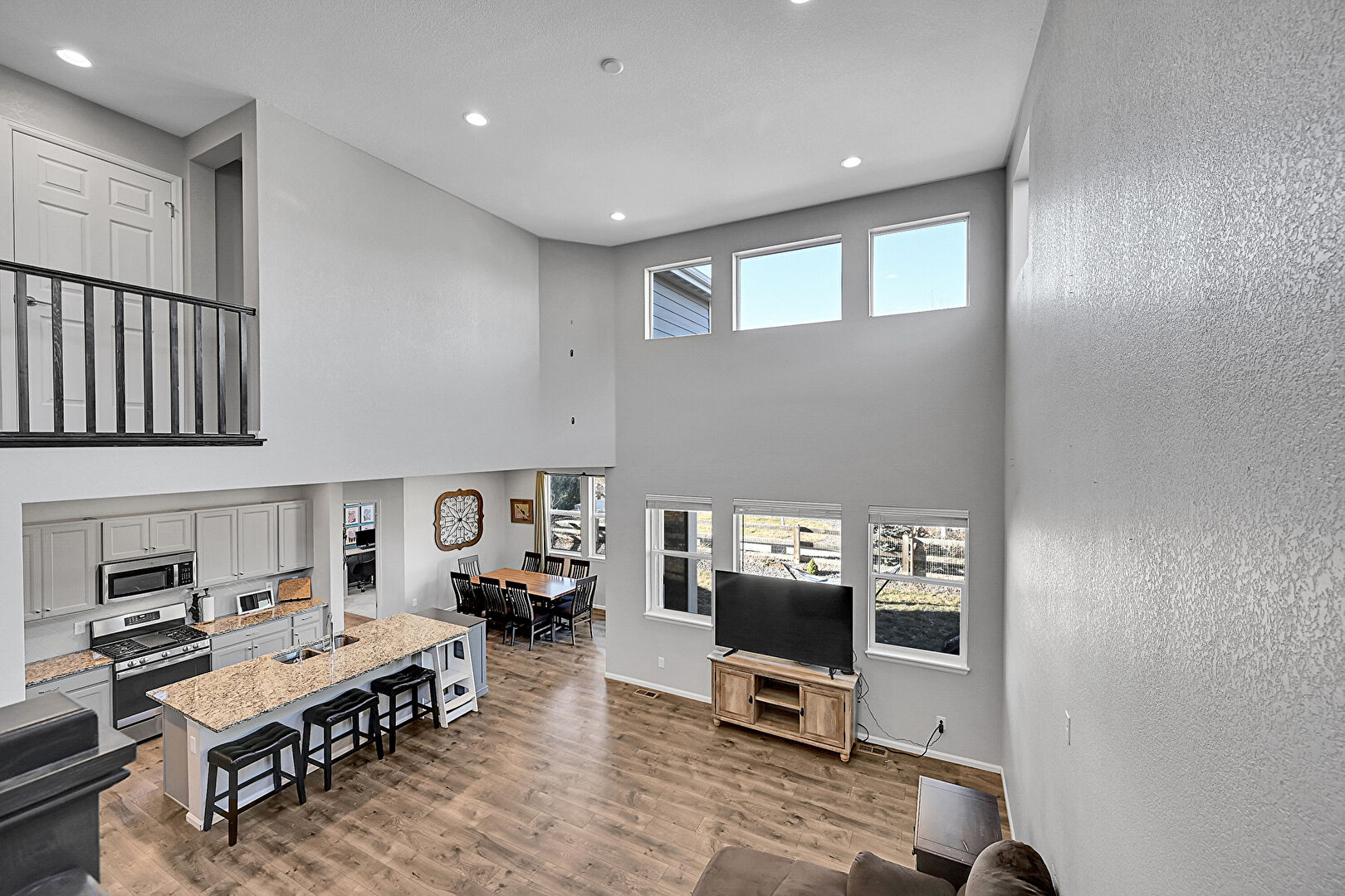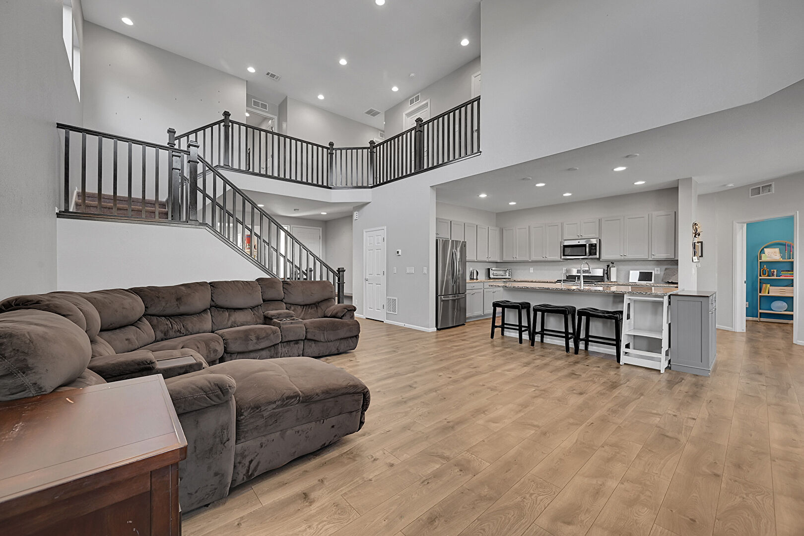 Baseboards Wall, Drywall, High Ceiling, L Shaped Kitchen, Natural Light, Recessed Lighting, Stairs, Textured Wall, Vent, Wood Finish Floor, High Ceiling, Natural Light, Recessed Lighting, Wood Finish Floor