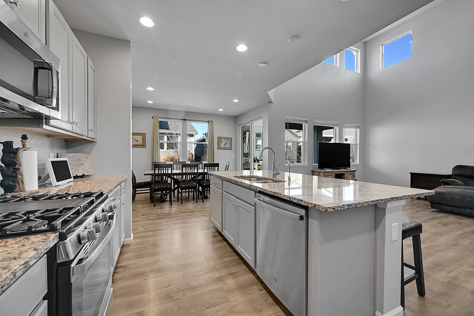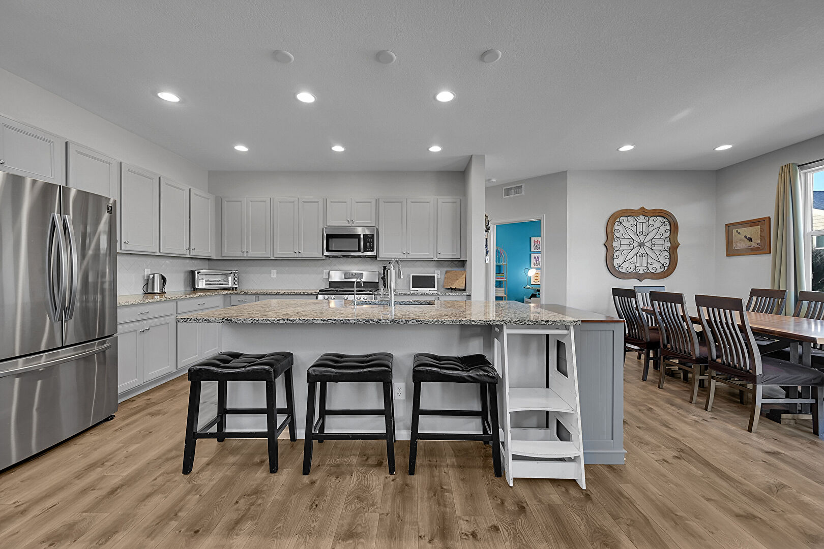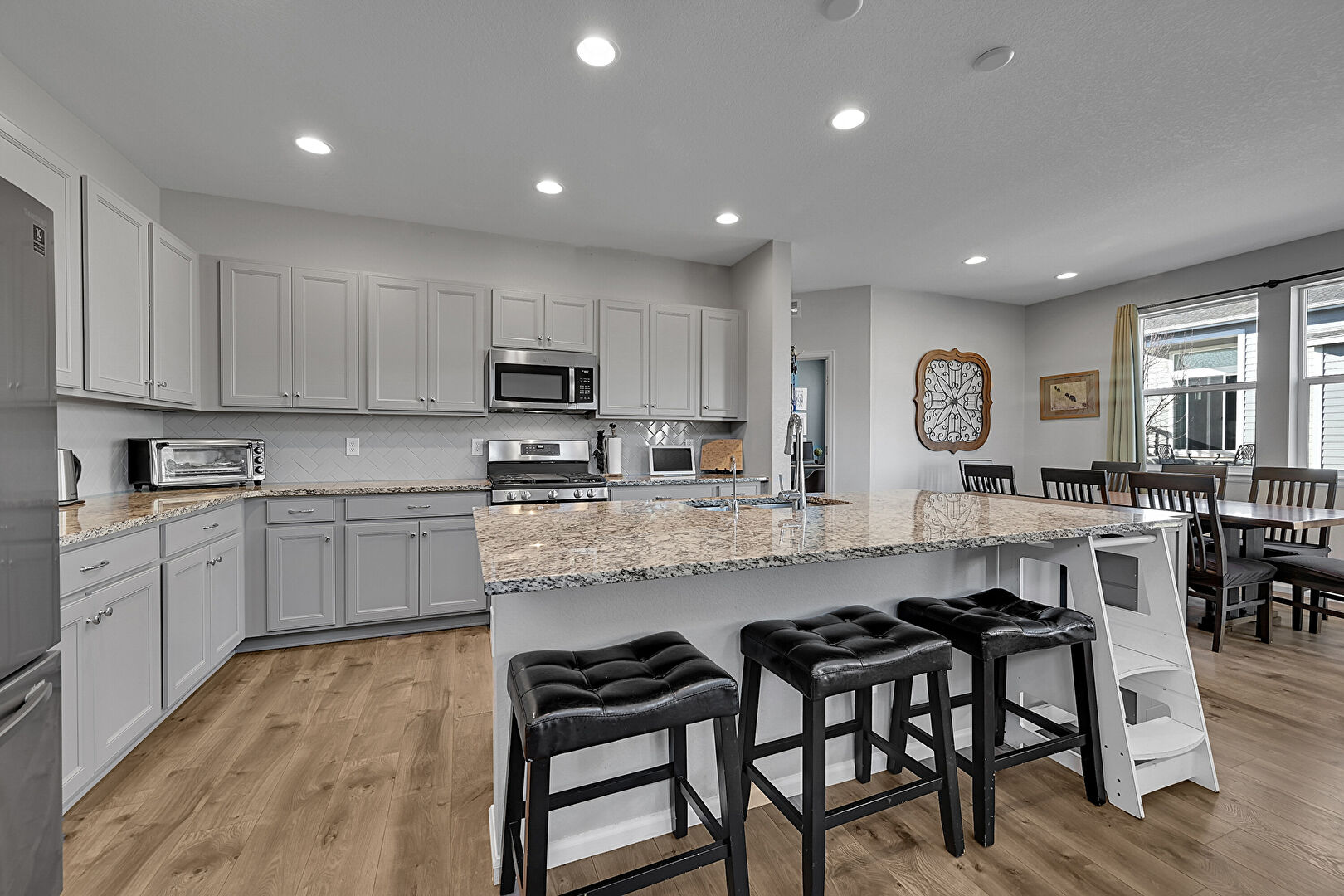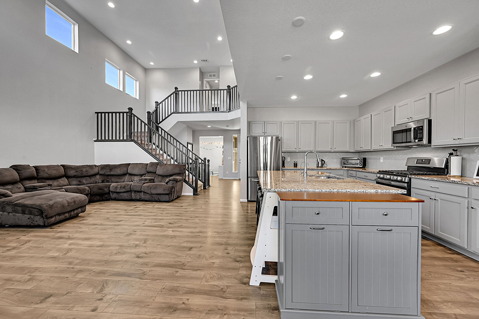 Baseboards Wall, Butcher Block Countertops, Drywall, Gray Cabinets, High Ceiling, Kitchen Bar, Kitchen Island, L Shaped Kitchen, Natural Light, Opens To Living Area, Recessed Lighting, Shaker Cabinets, Stone Countertops, Toaster, Wood Finish Floor, Drywall, Gray Cabinets, Shaker Cabinets, Toaster, Vent, Wood Finish Floor