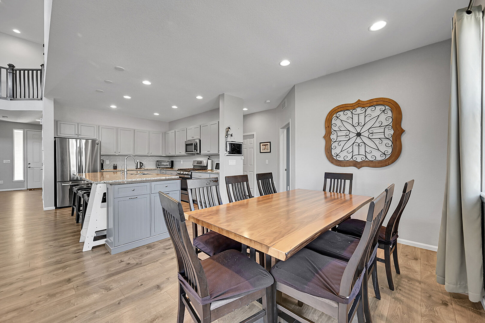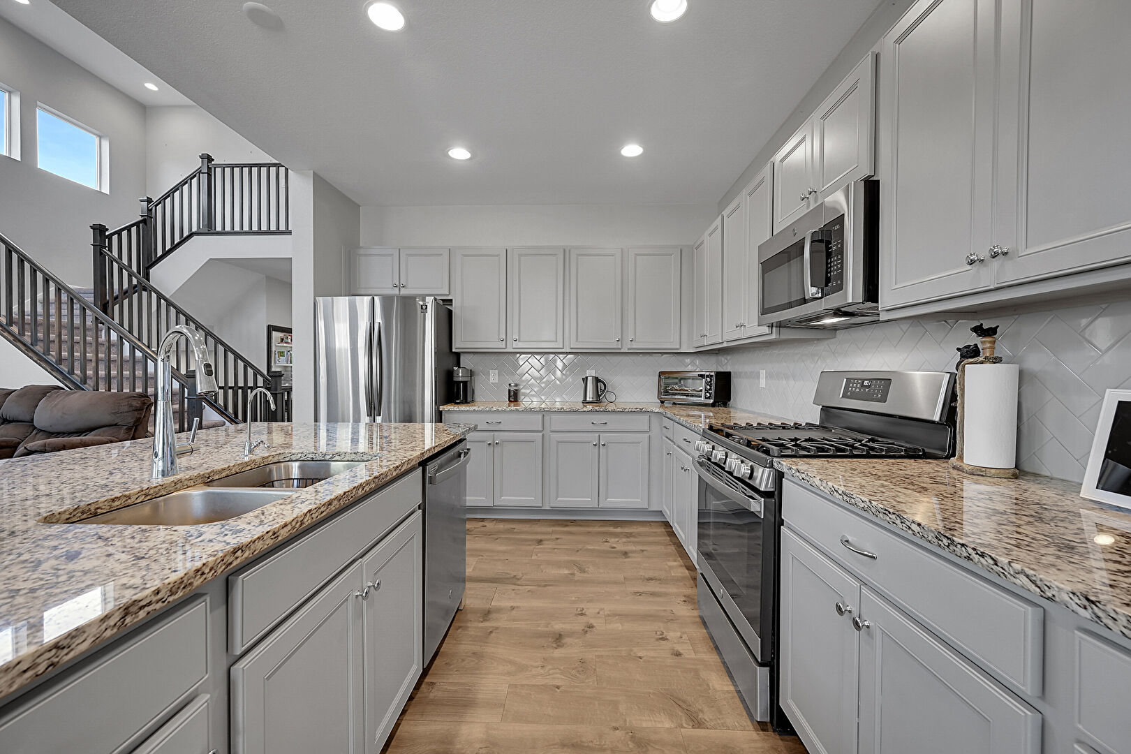Baseboards Wall, Drywall, L Shaped Kitchen, Natural Light, Recessed Lighting, Stairs, Vent, Wood Finish Floor, Recessed Lighting, Wood Finish Floor