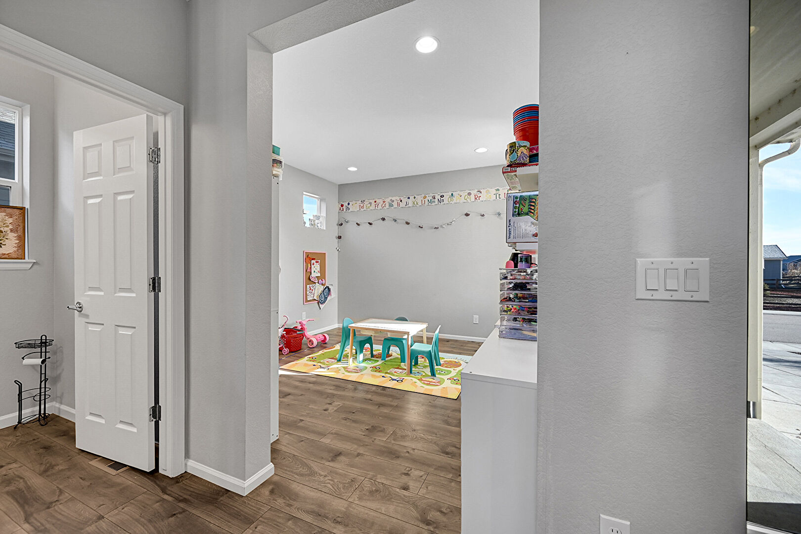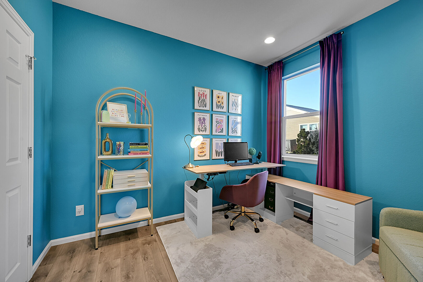 Accent Wall, Baseboards Wall, Drywall, Natural Light, Office Area, Recessed Lighting, Wood Finish Floor, Baseboards Wall, Natural Light