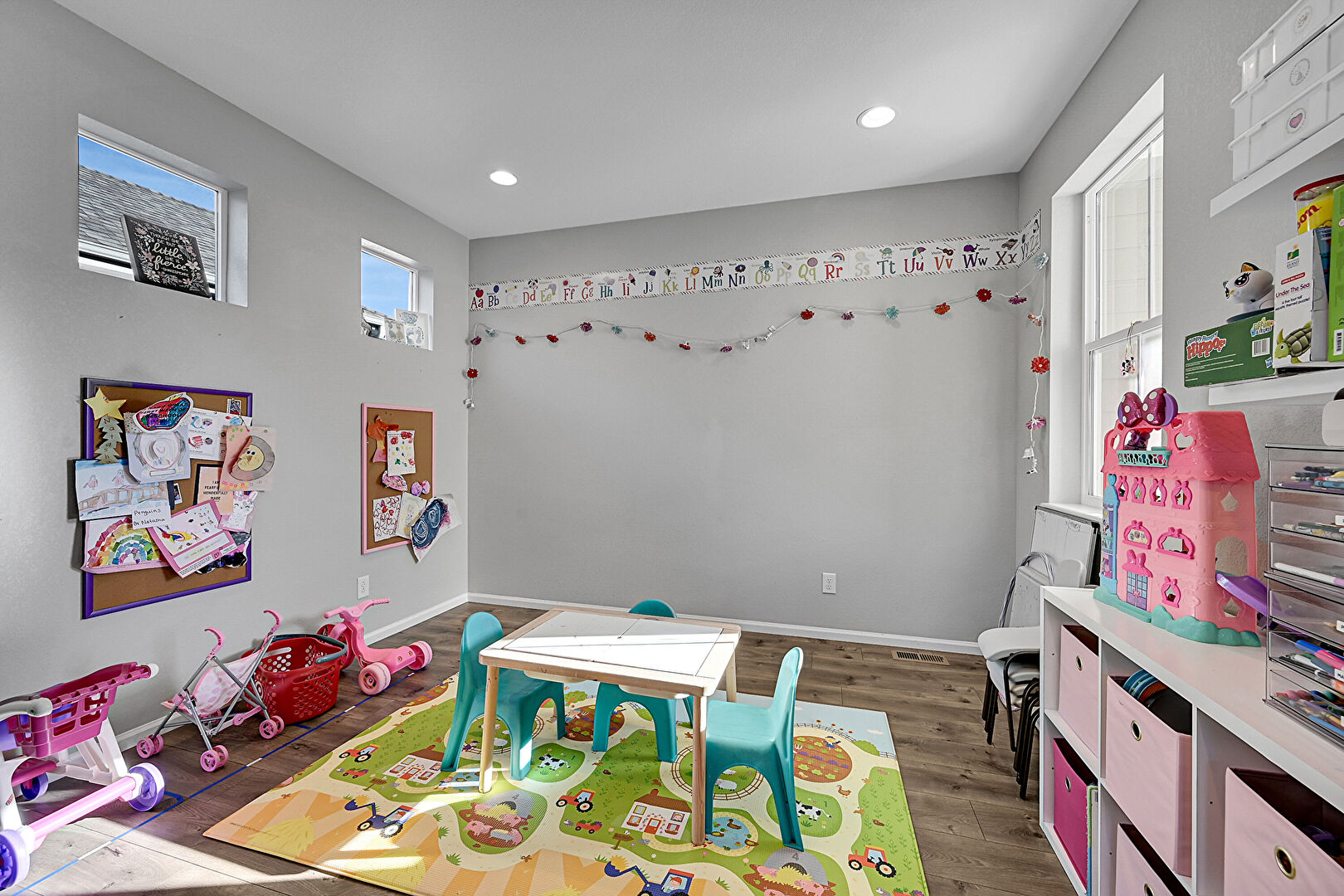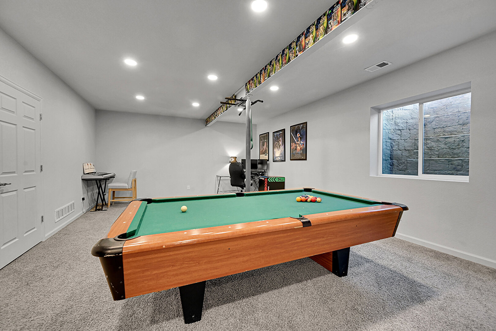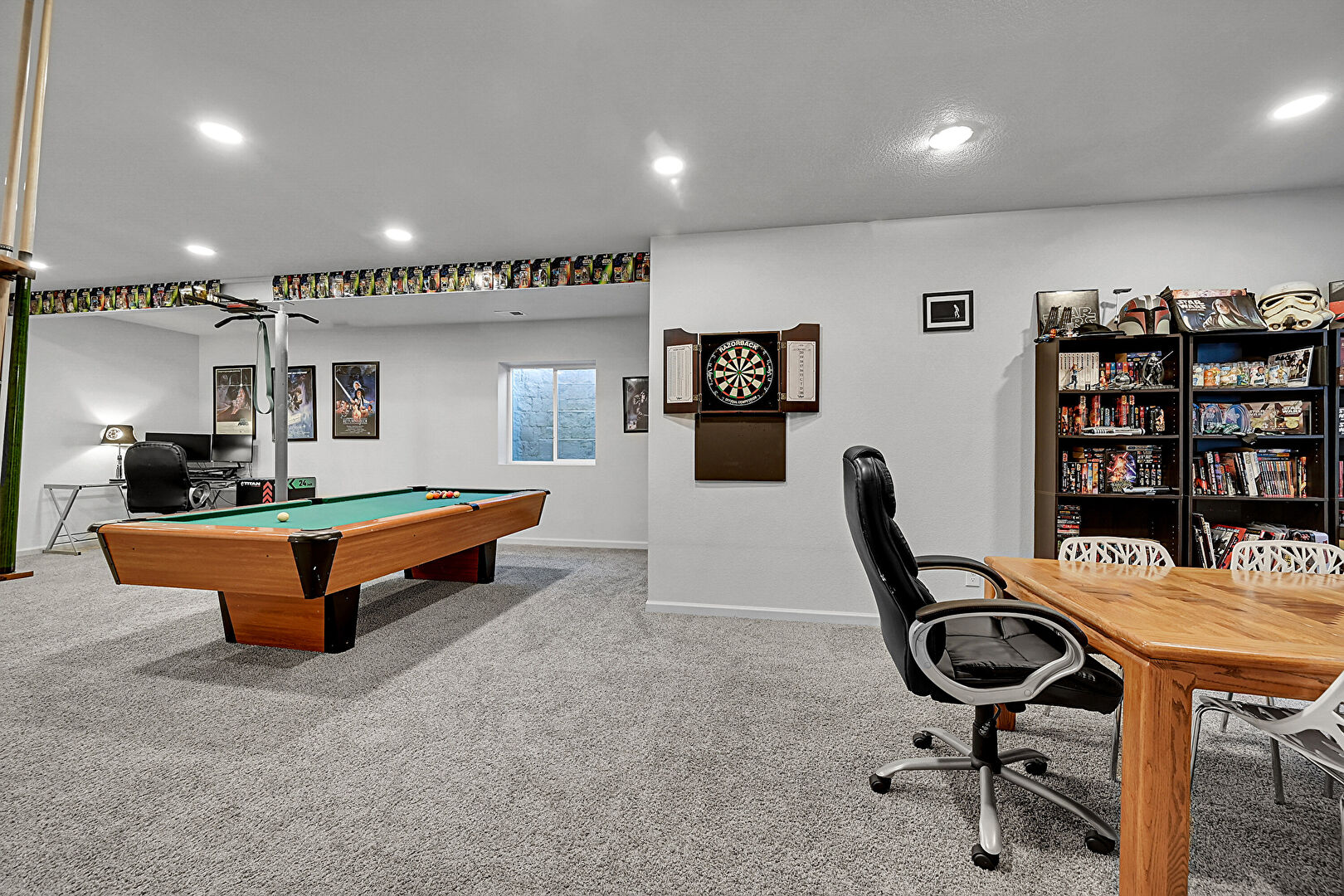 Baseboards Wall, Billiards, Carpet, Drywall, Natural Light, Office Area, Recessed Lighting, Vent, Wood Finish Floor, Baseboards Wall, Natural Light, Recessed Lighting