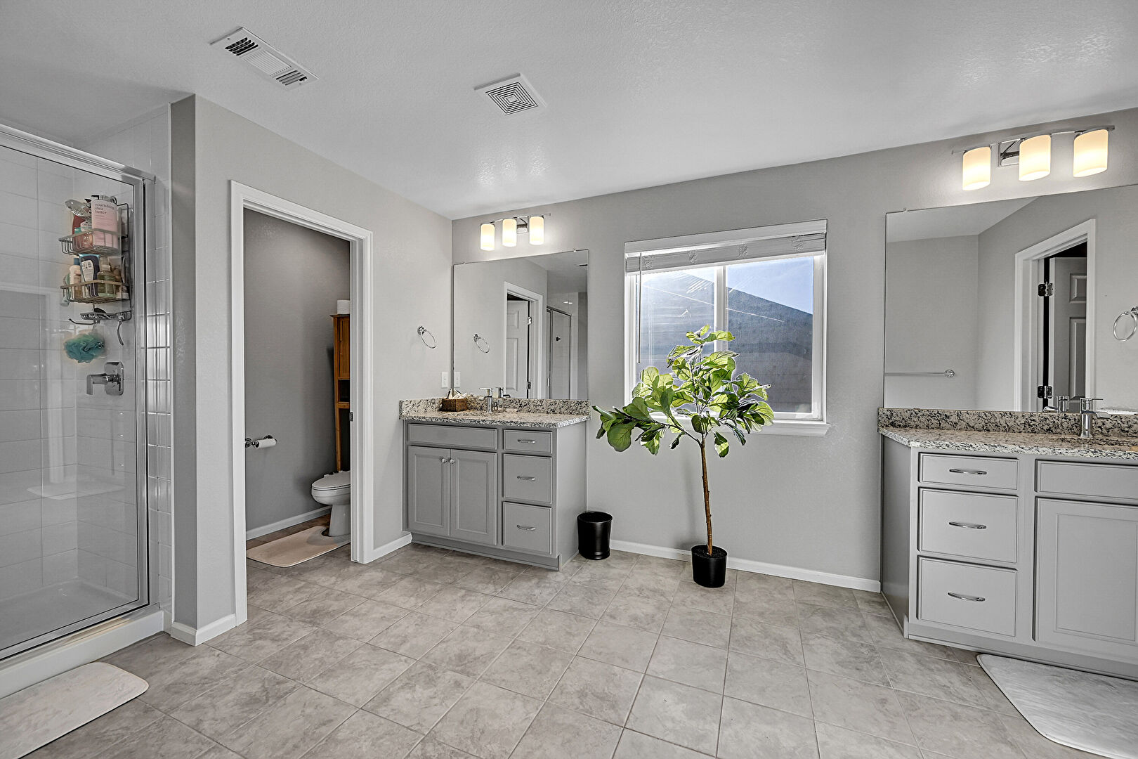 Baseboards Wall, Drywall, Ensuite Bathroom, Full Bathroom, Natural Light, Recessed Lighting, Tile Floor, Two Single Vanities, Vent, Walk In Closet, Water Closet, Baseboards Wall, Natural Light, Two Single Vanities, Vent