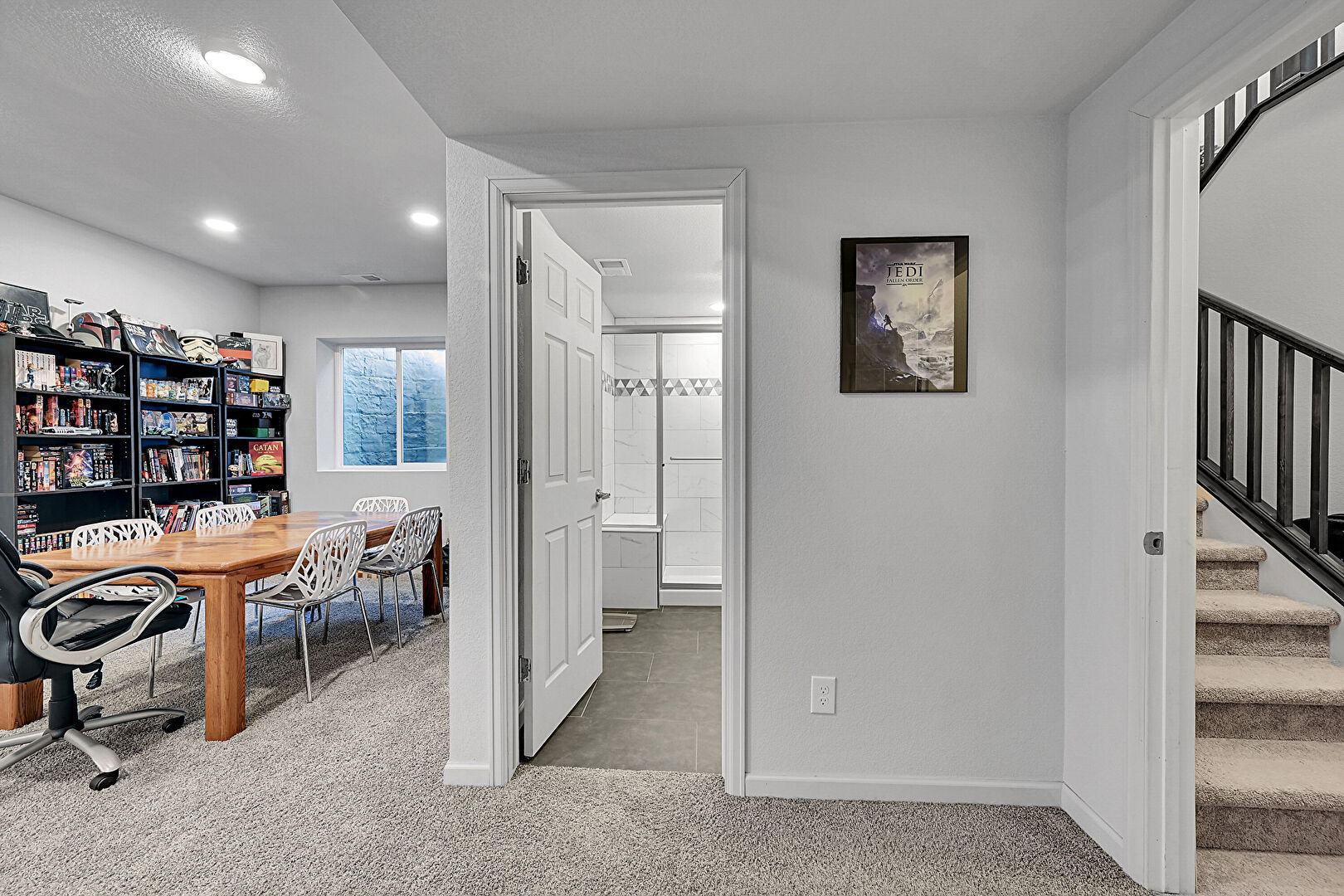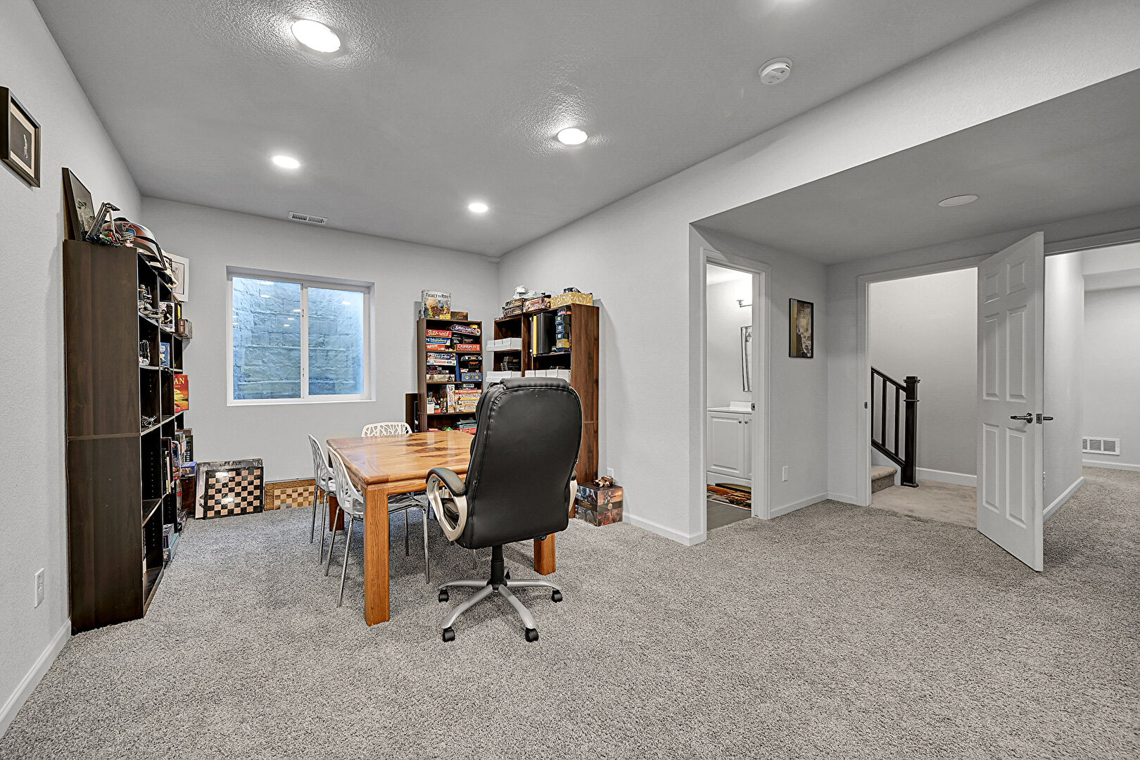 Baseboards Wall, Basement, Drywall, Natural Light, Office Area, Recessed Lighting, Vent, Carpet