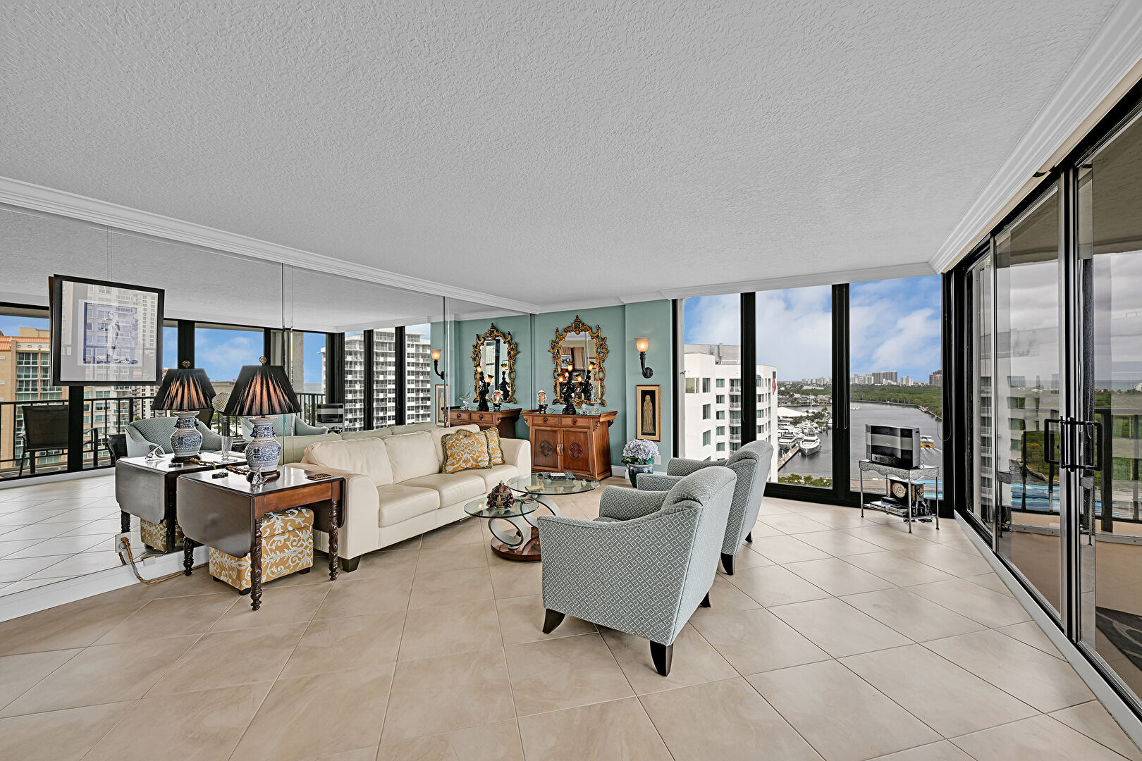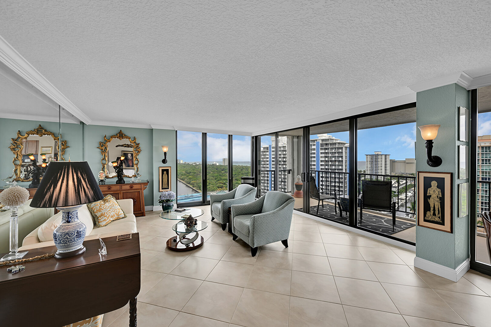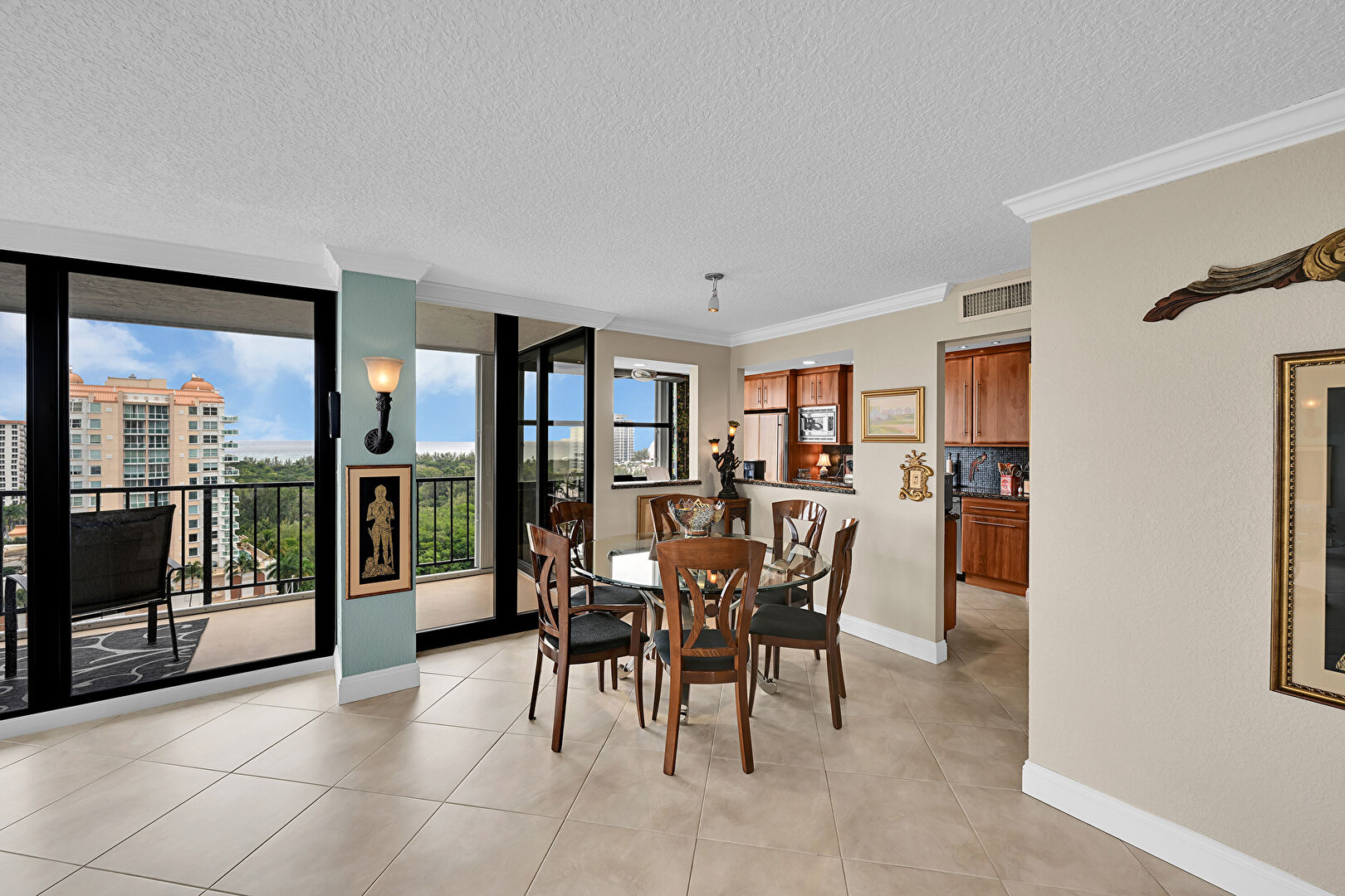 Baseboards Wall, City View, Crown Molding, Drywall, Floor Ceiling Windows, Natural Light, Sunroom, Textured Ceiling, Tile Floor, Vent, Baseboards Wall, Crown Molding, Sunroom, Textured Ceiling