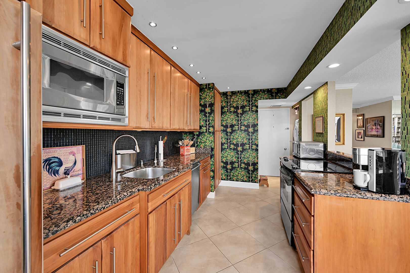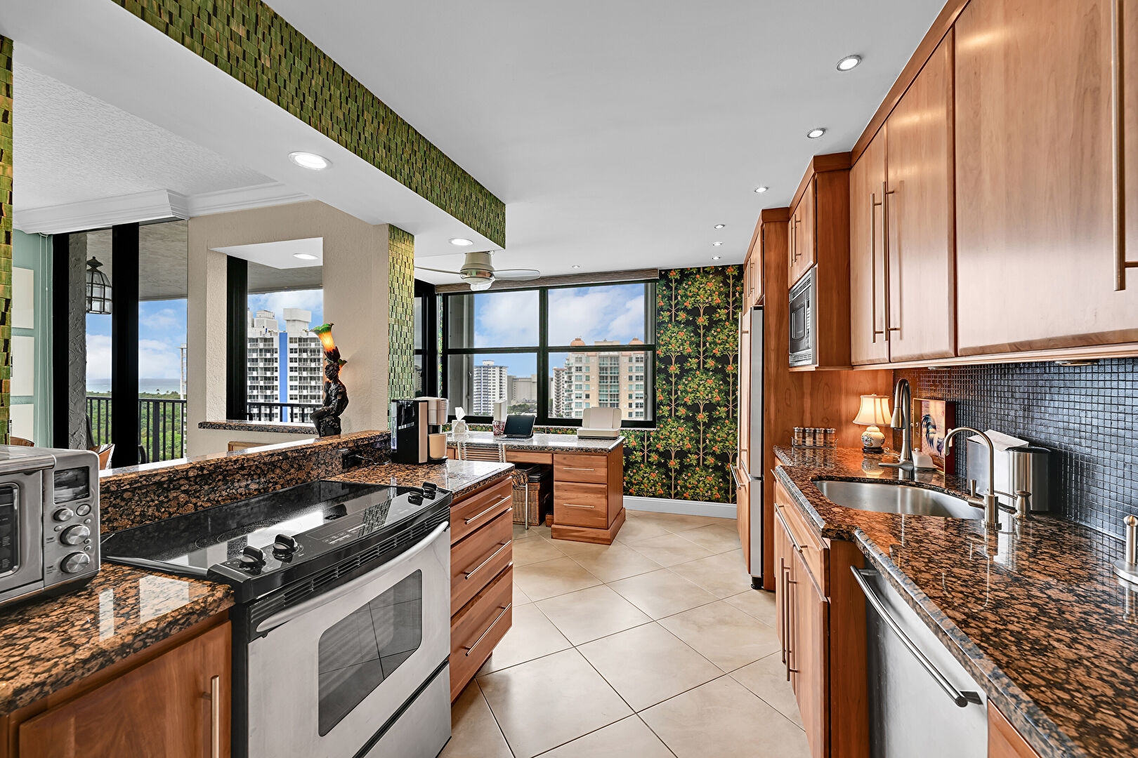Accent Wall, Baseboards Wall, Ceiling Fan, City View, Crown Molding, Crown Molding Cabinets, Kitchen Bar, Medium Brown Cabinets, Natural Light, Raised Cabinets, Recessed Lighting, Shaker Cabinets, Stone Countertops, Tile Floor, Toaster, Wallpaper Wall, Baseboards Wall, Recessed Lighting, Vent, Wallpaper Wall