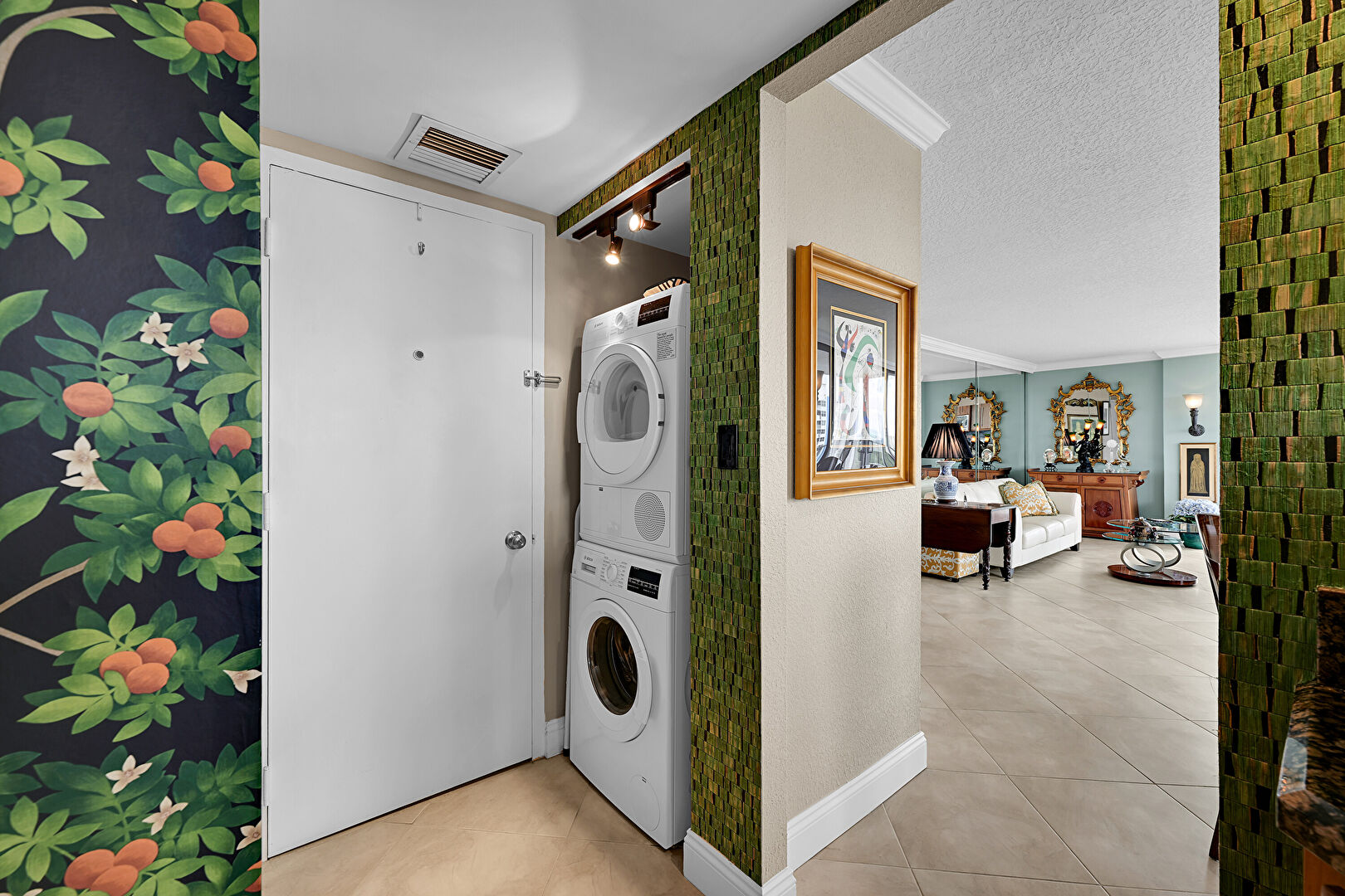 Accent Wall, Baseboards Wall, Crown Molding, Drywall, Laundry, Textured Ceiling, Tile Floor, Track Lighting, Vent