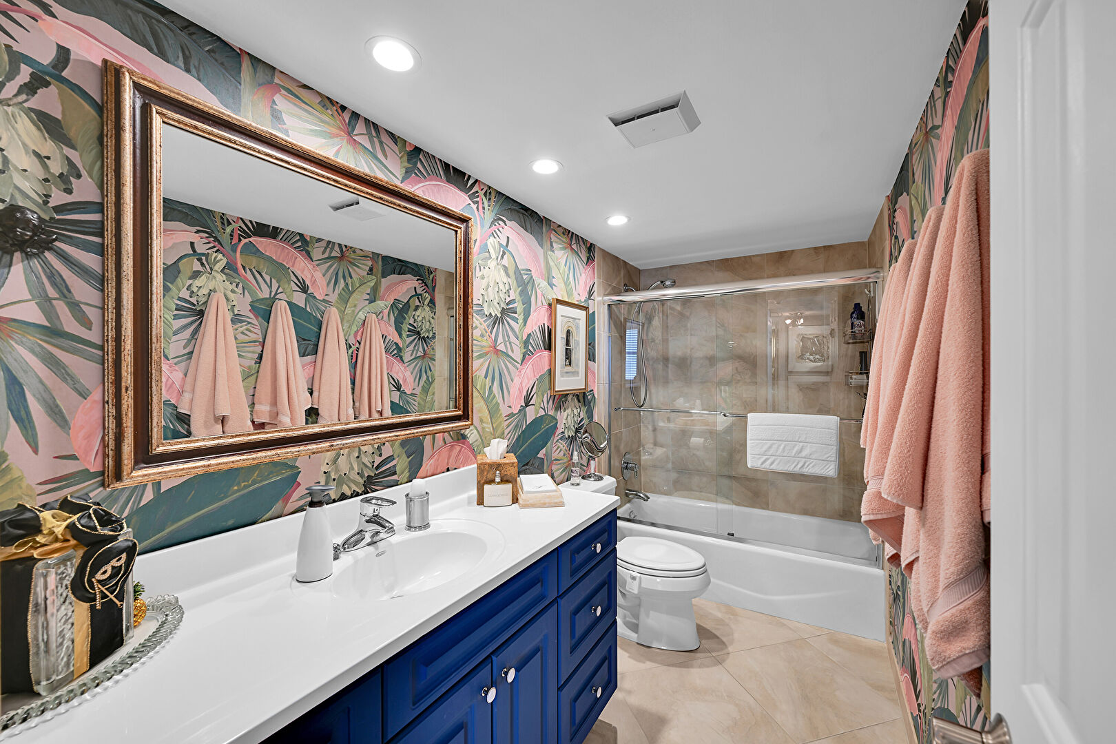 Baseboards Wall, Combined Bath Shower, Double Vanity, Full Bathroom, Recessed Lighting, Tile Floor, Vanity, Vent, Walk In Closet, Wallpaper Wall, Baseboards Wall, Tile Floor