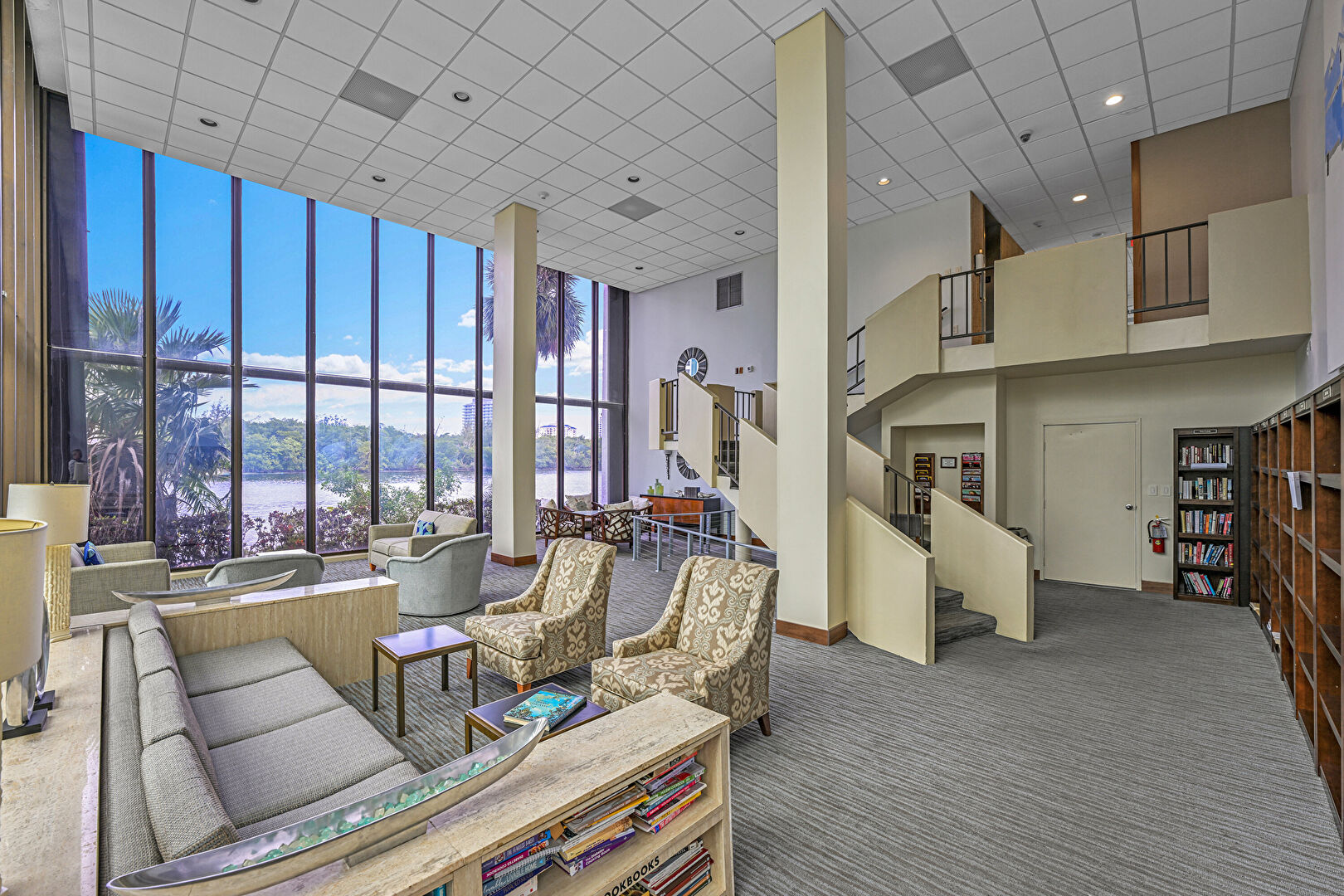 Baseboards Wall, Ceiling Fan, City View, Floor Ceiling Windows, Natural Light, Recessed Lighting, Tile Floor, Wallpaper Wall, Office Area