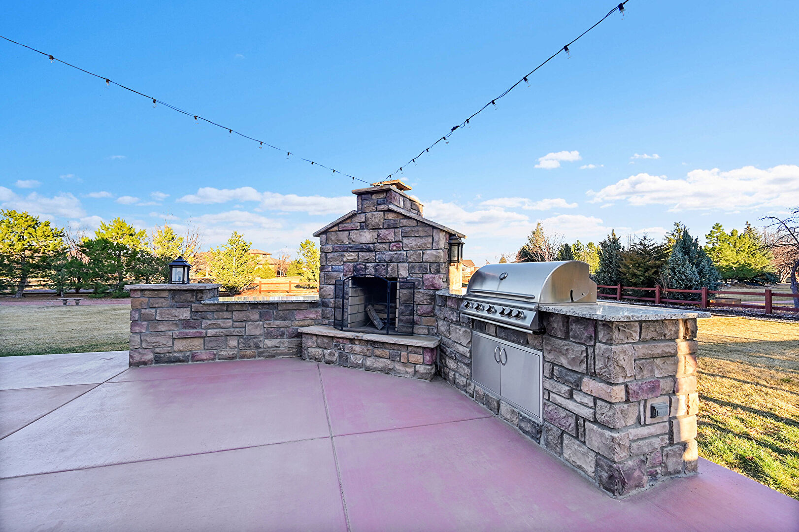 Balcony, Fence, Fireplace, Grill, Lawn, Outdoor Kitchen, Patio, Balcony, Fireplace, Grill, Lawn