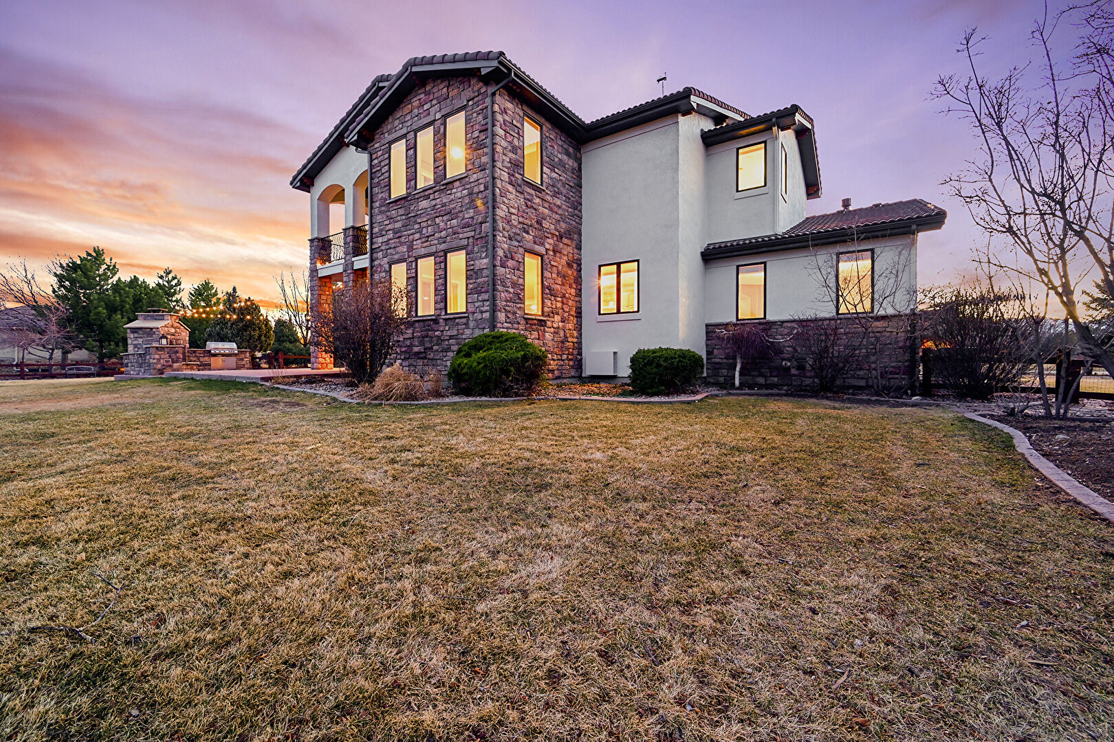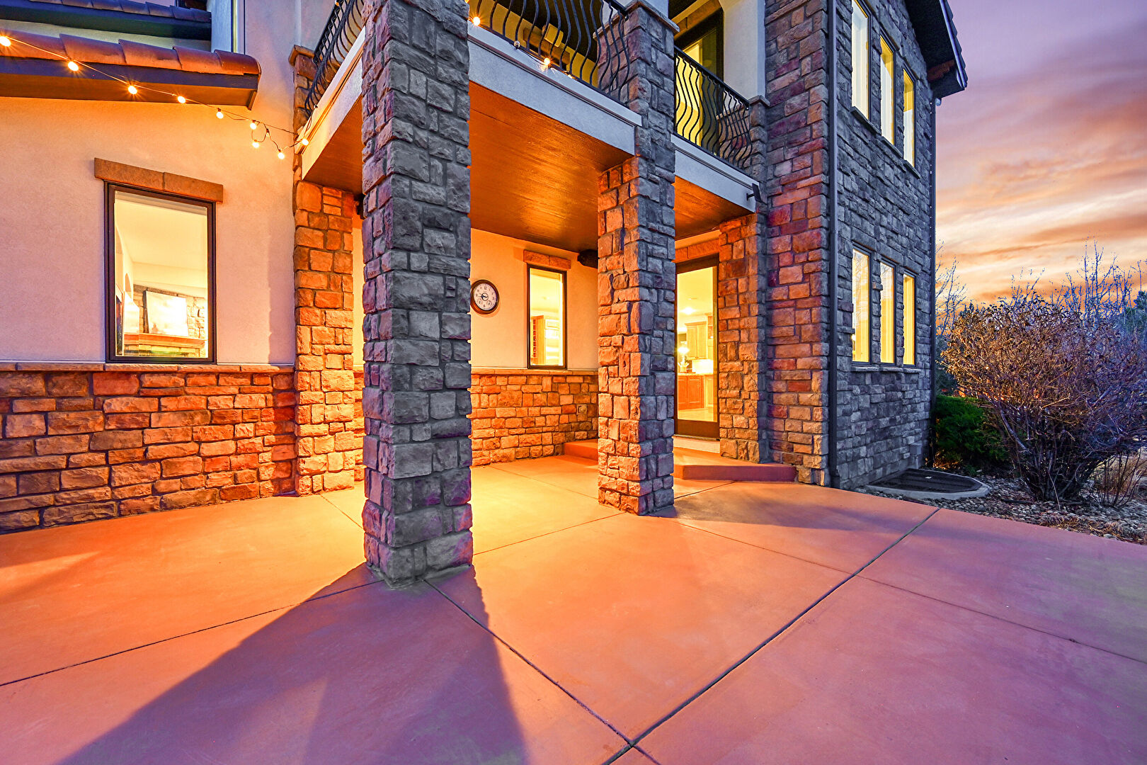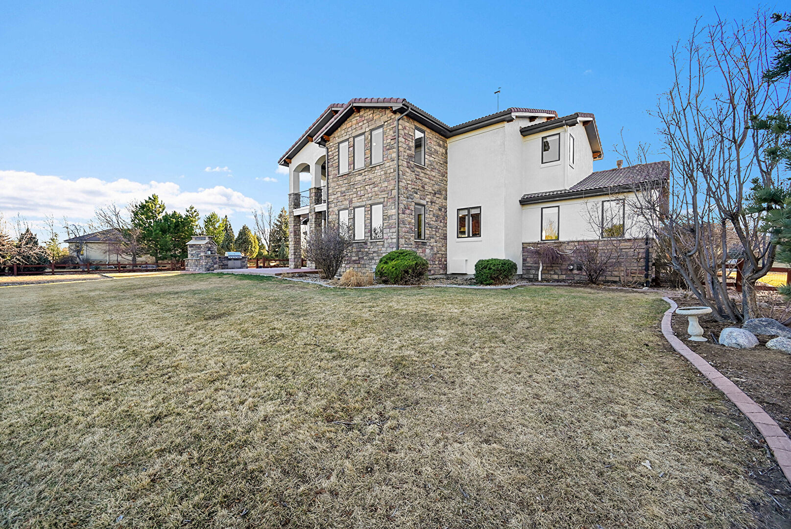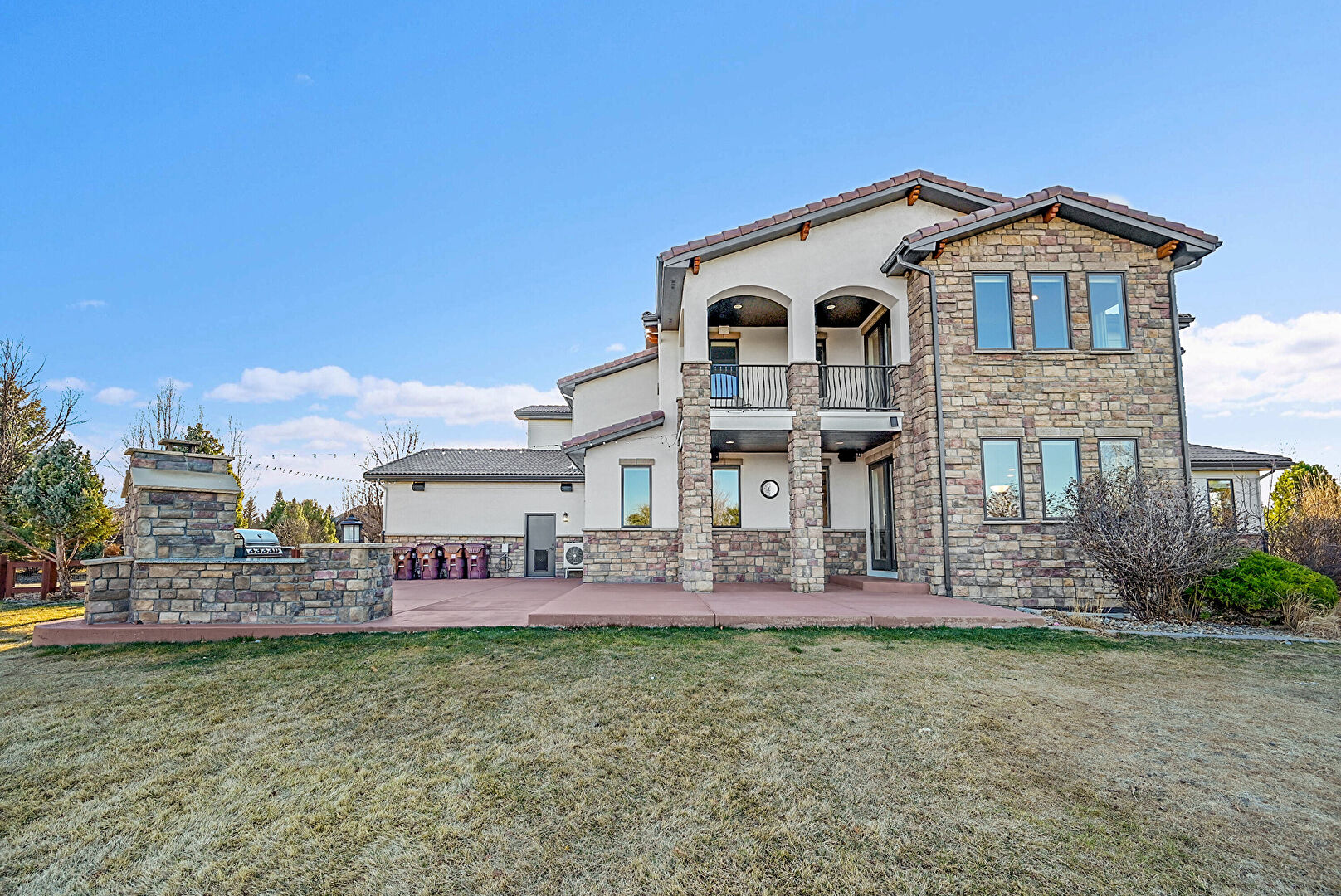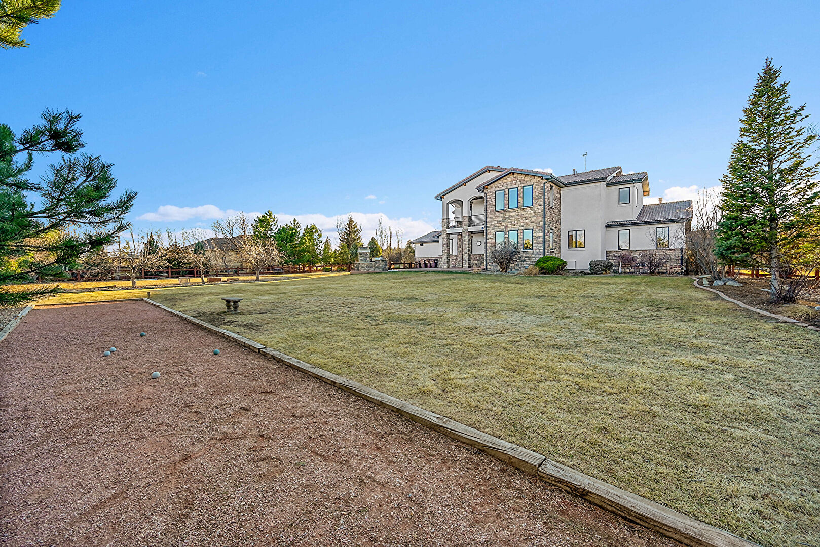Balcony, Downspout, Fence, Gutters, Lawn, Patio, Porch, Stone Siding, Stucco Siding, Tile Roof, Bocce Ball, Fence, Gutters, Lawn, Outdoor Kitchen, Stone Siding, Stucco Siding