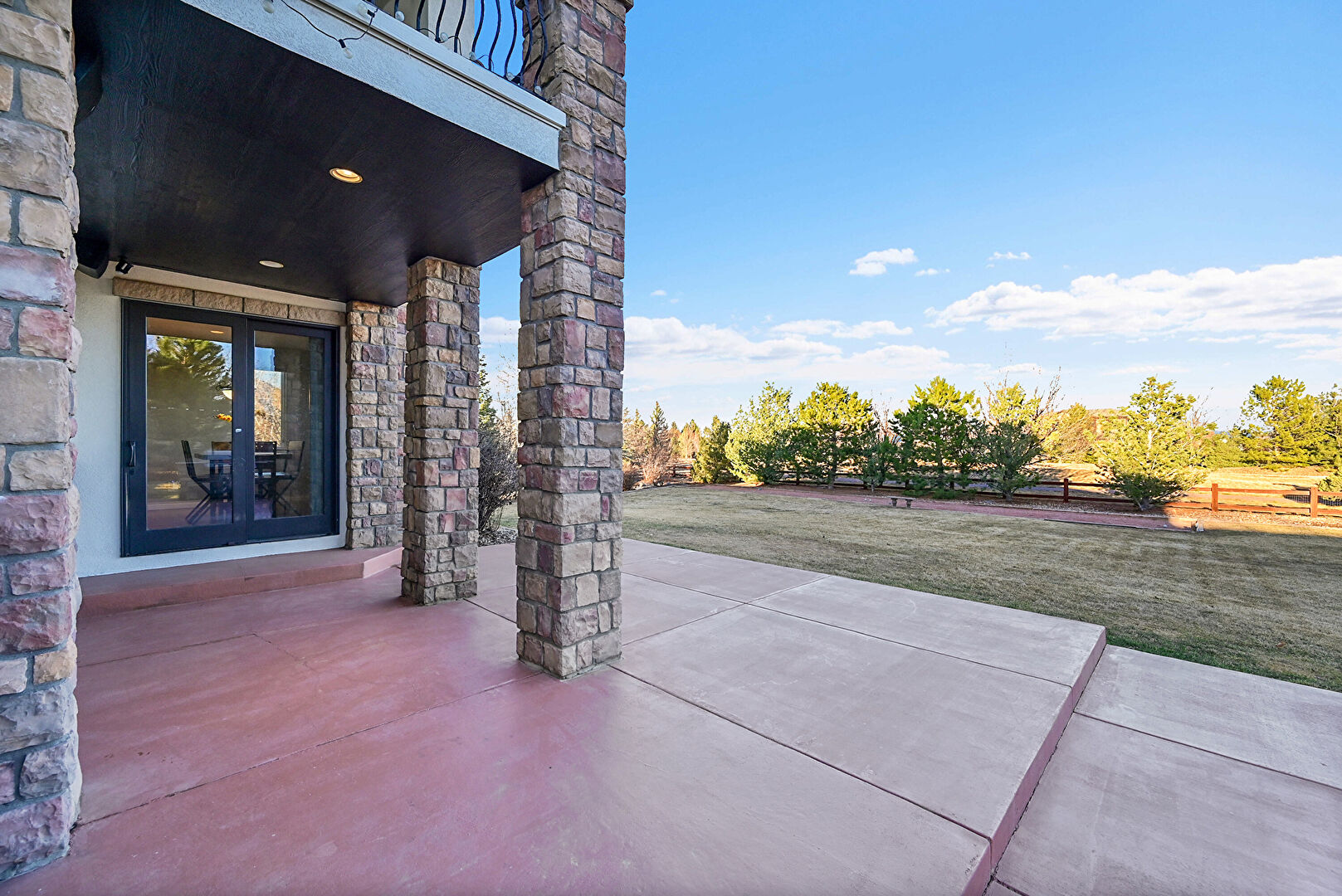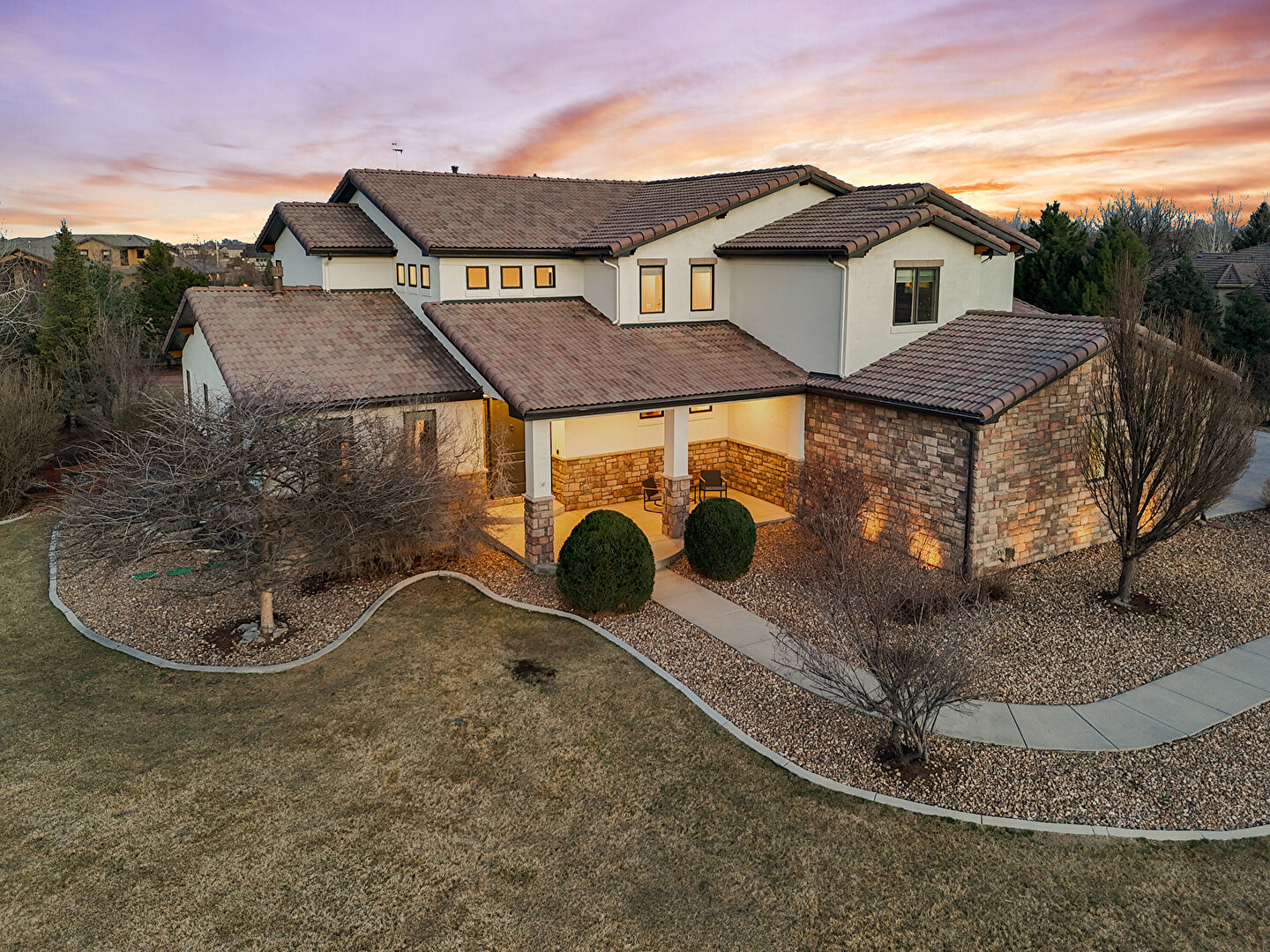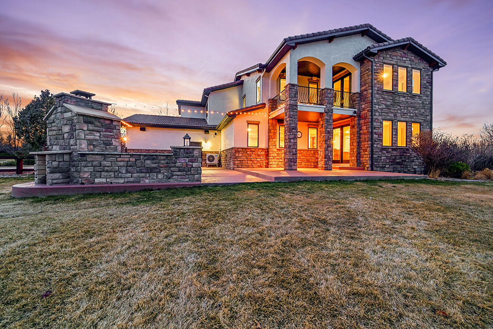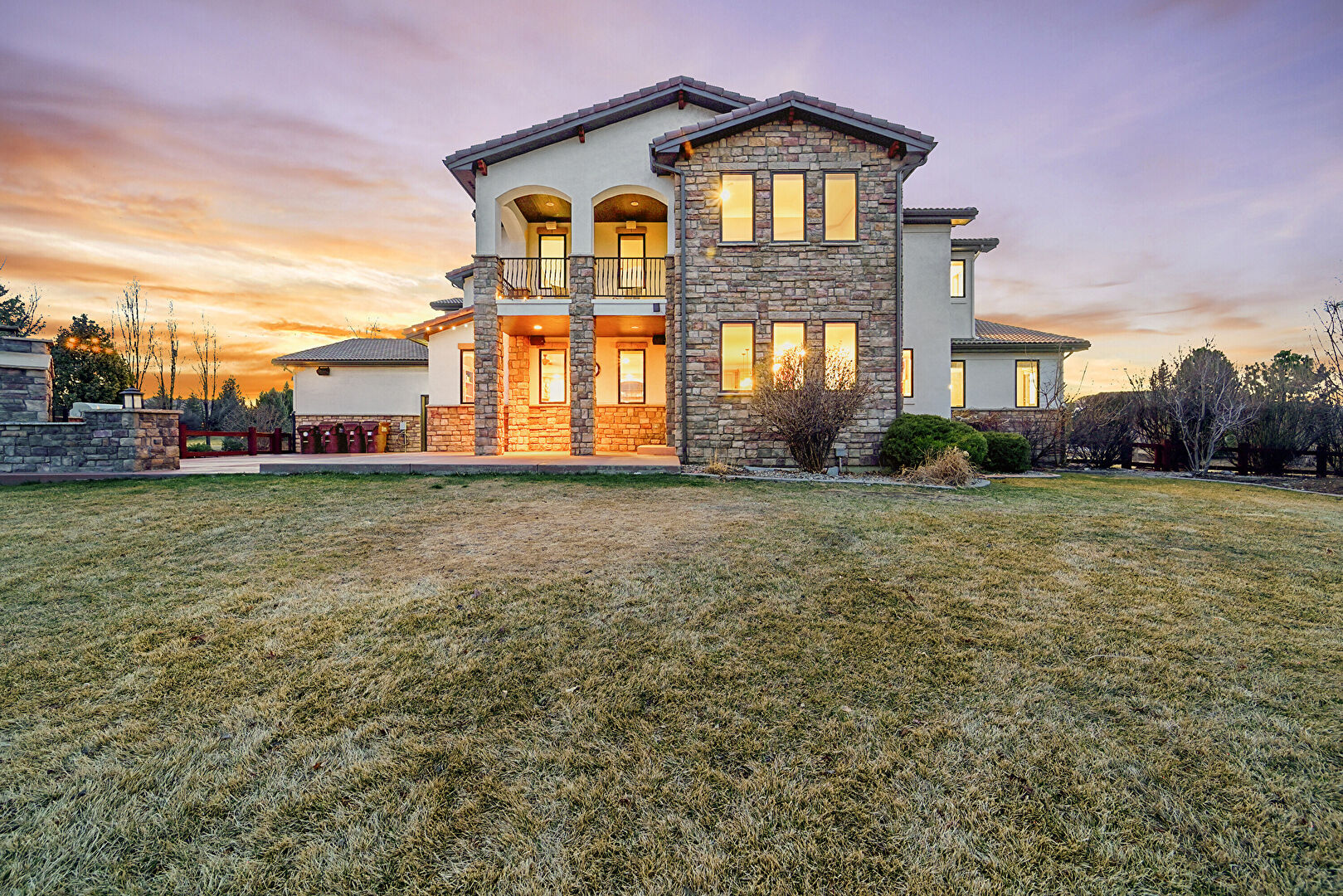 Balcony, Downspout, Fence, Gutters, Lawn, Patio, Porch, Stone Siding, Stucco Siding, Tile Roof, Bocce Ball, Fence, Gutters, Lawn, Outdoor Kitchen, Stone Siding, Stucco Siding