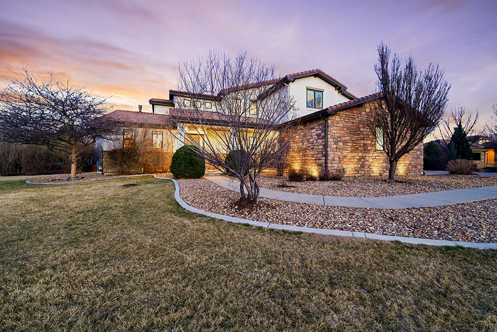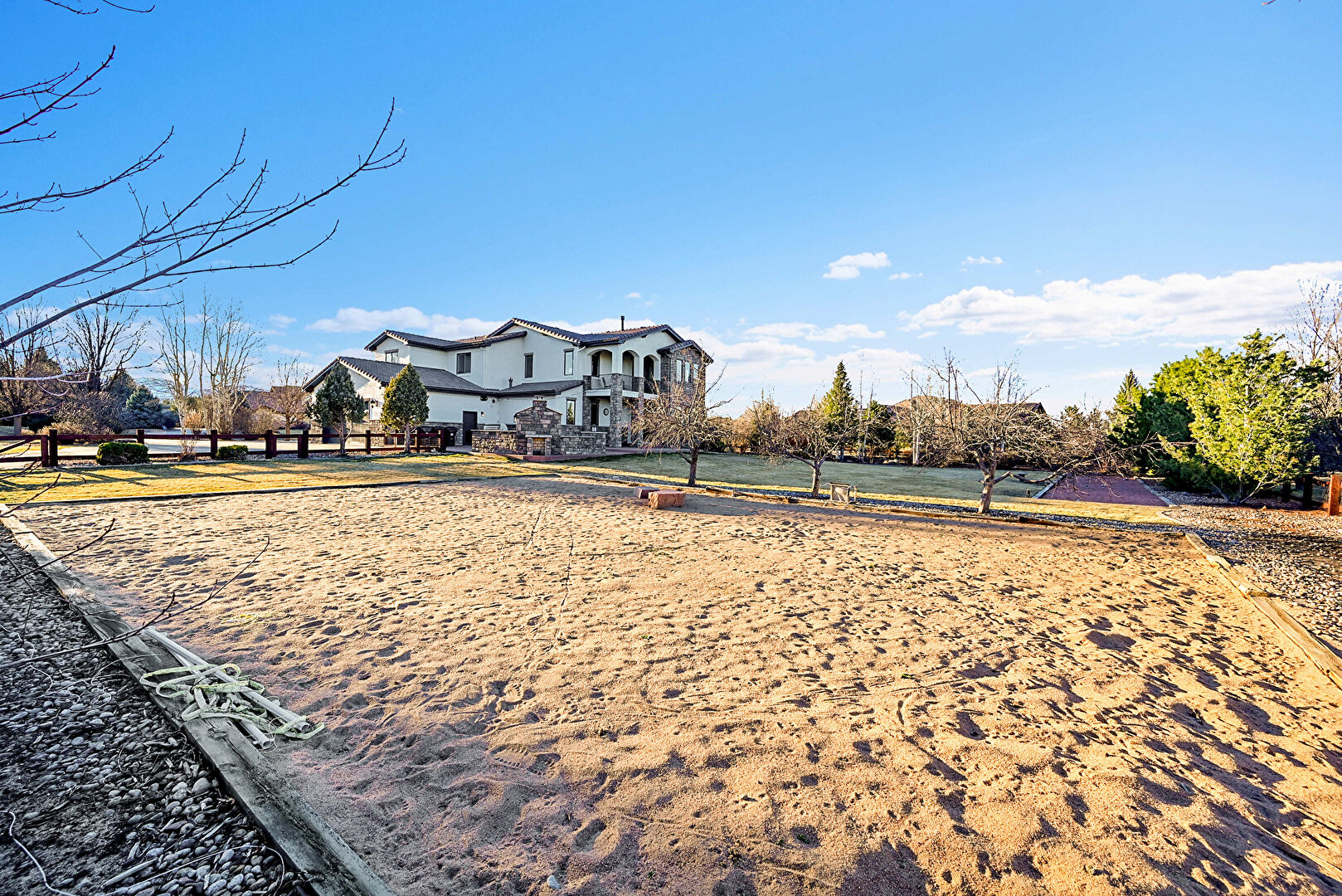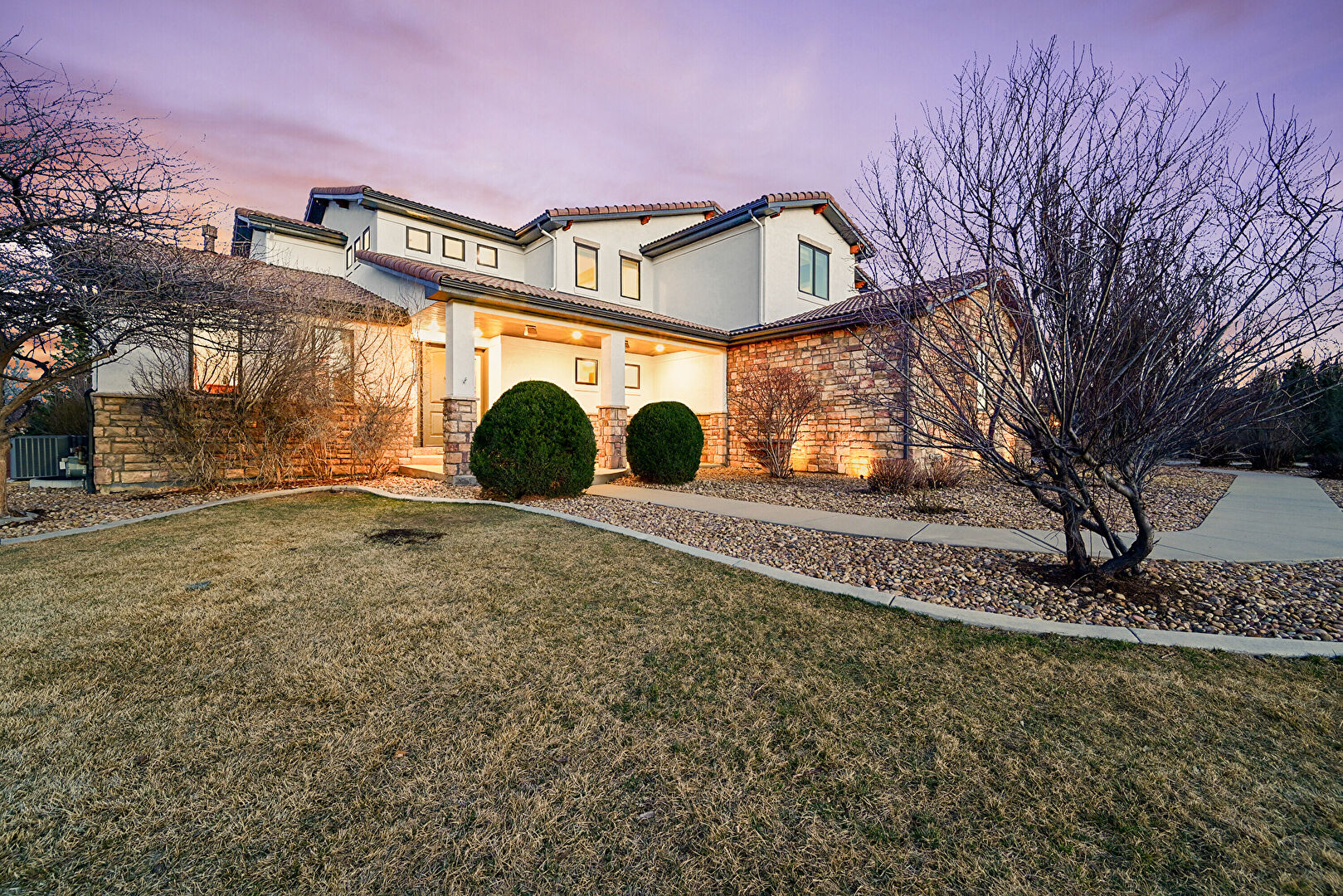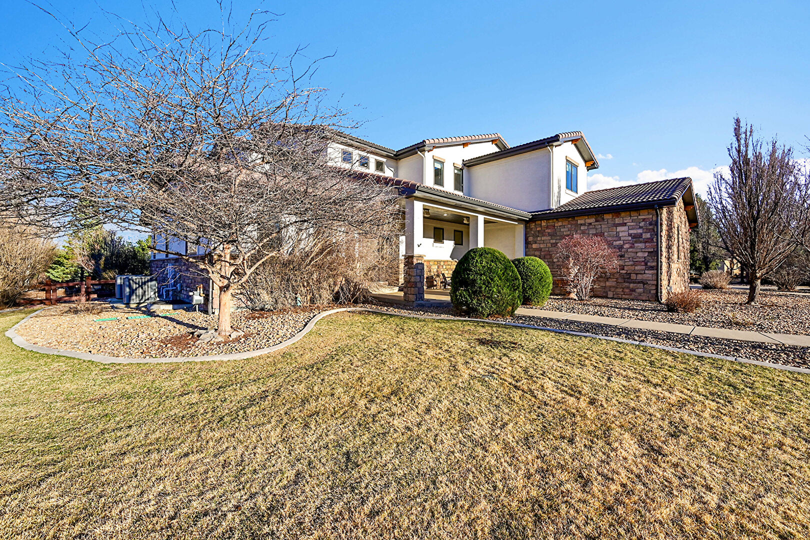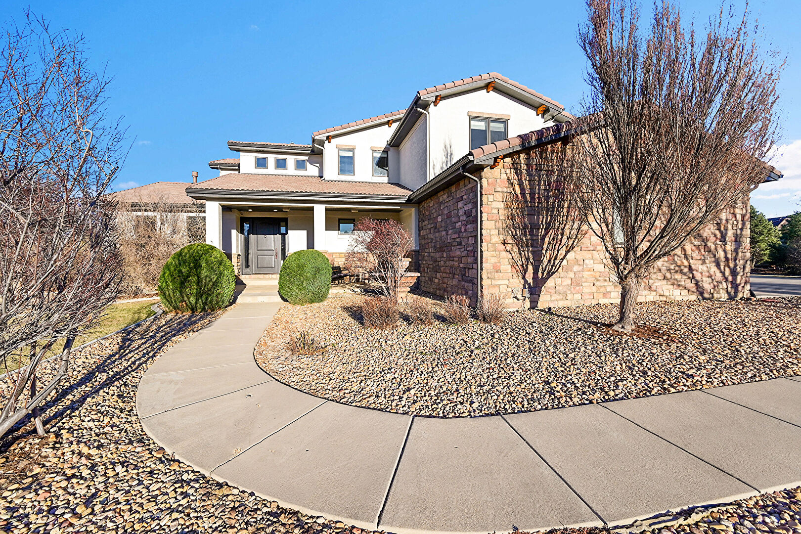 Balcony, Downspout, Fence, Gutters, Lawn, Patio, Porch, Stone Siding, Stucco Siding, Tile Roof, Bocce Ball, Fence, Gutters, Lawn, Outdoor Kitchen, Stone Siding, Stucco Siding