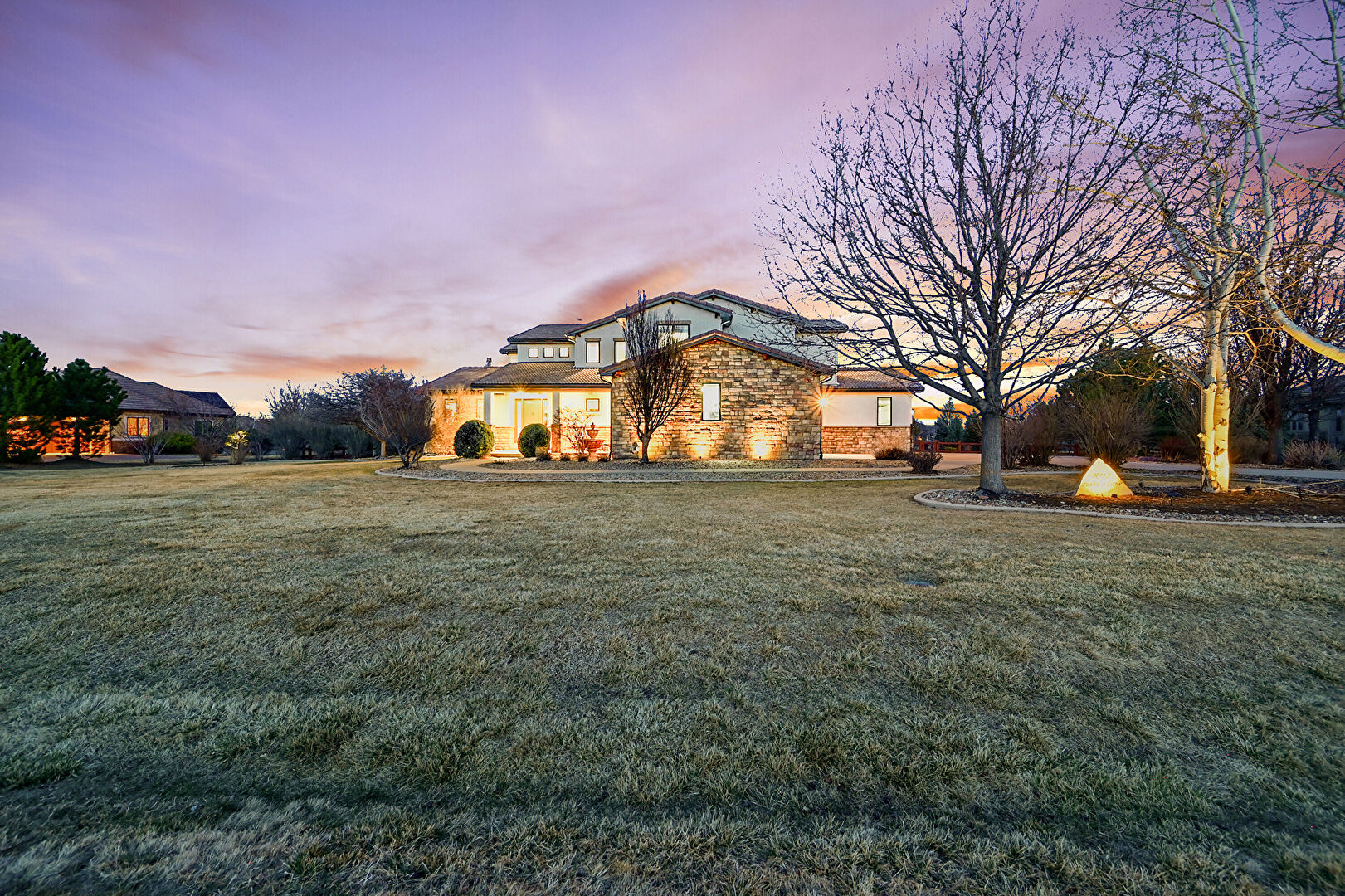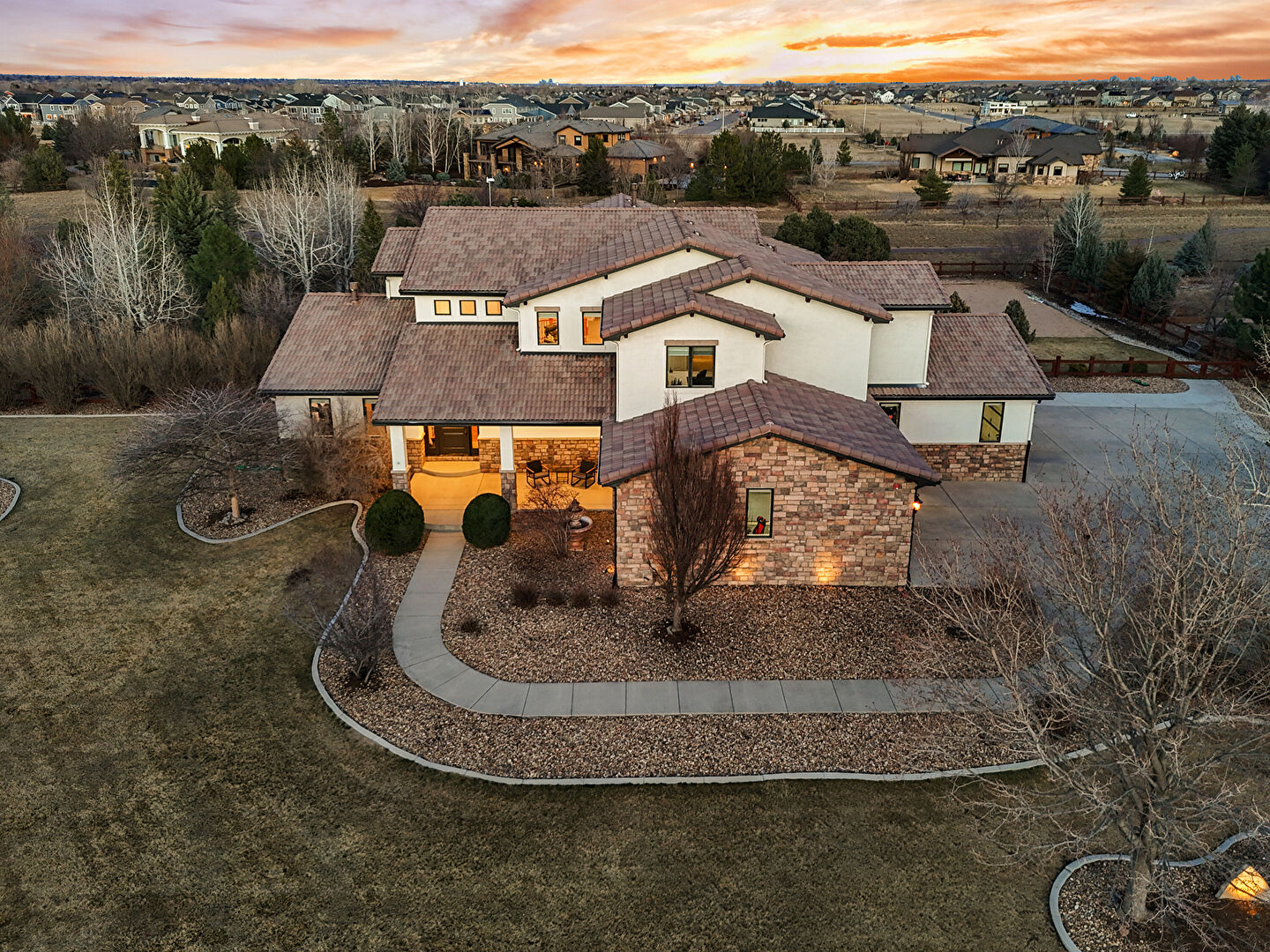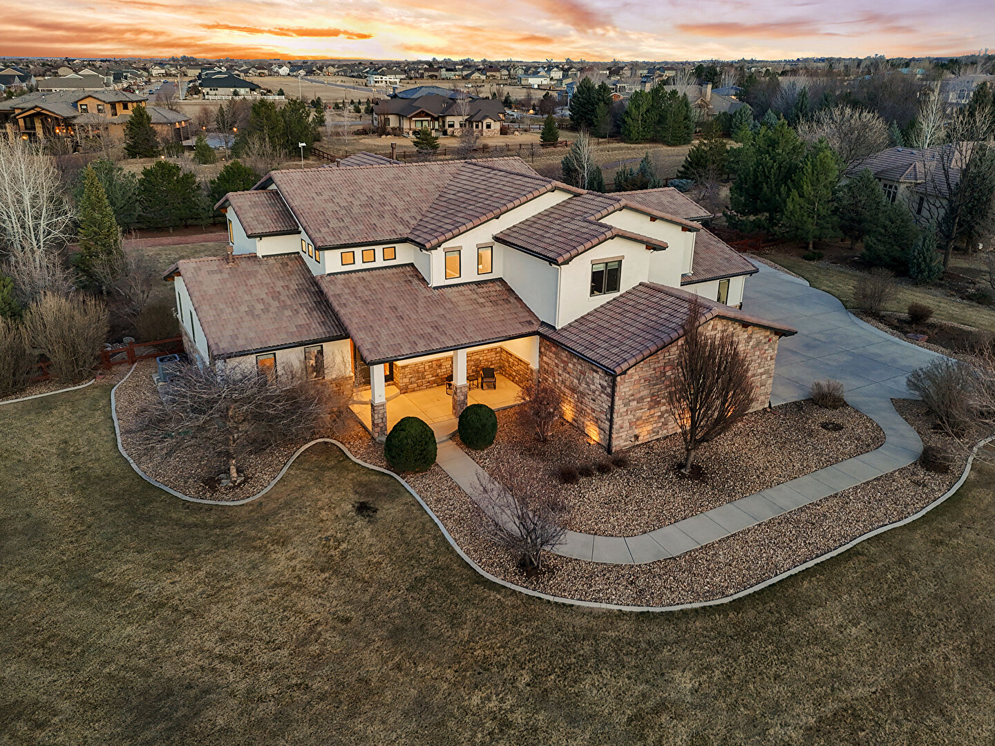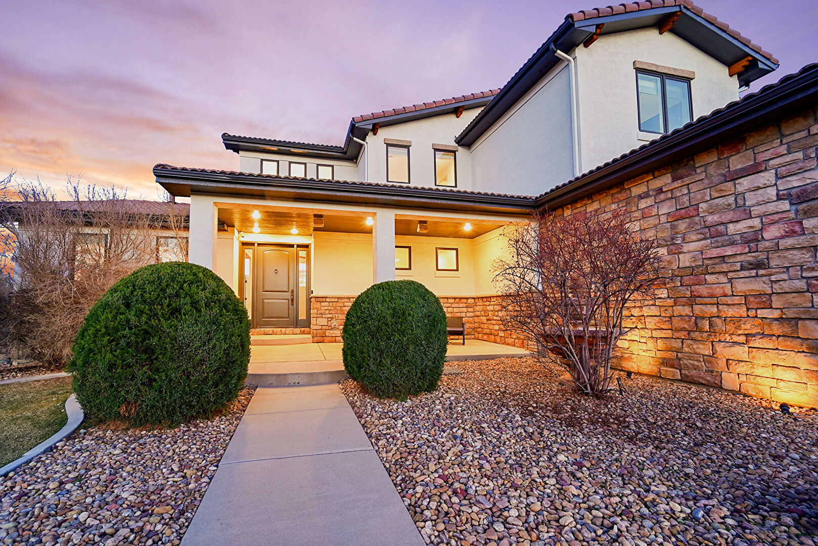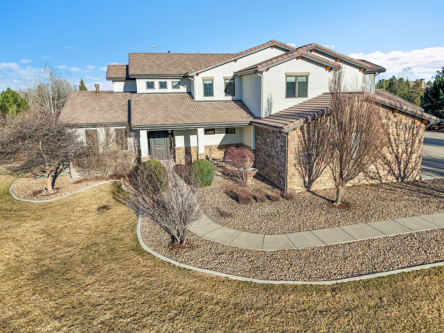 Balcony, Downspout, Fence, Gutters, Lawn, Patio, Porch, Stone Siding, Stucco Siding, Tile Roof, Bocce Ball, Fence, Gutters, Lawn, Outdoor Kitchen, Stone Siding, Stucco Siding