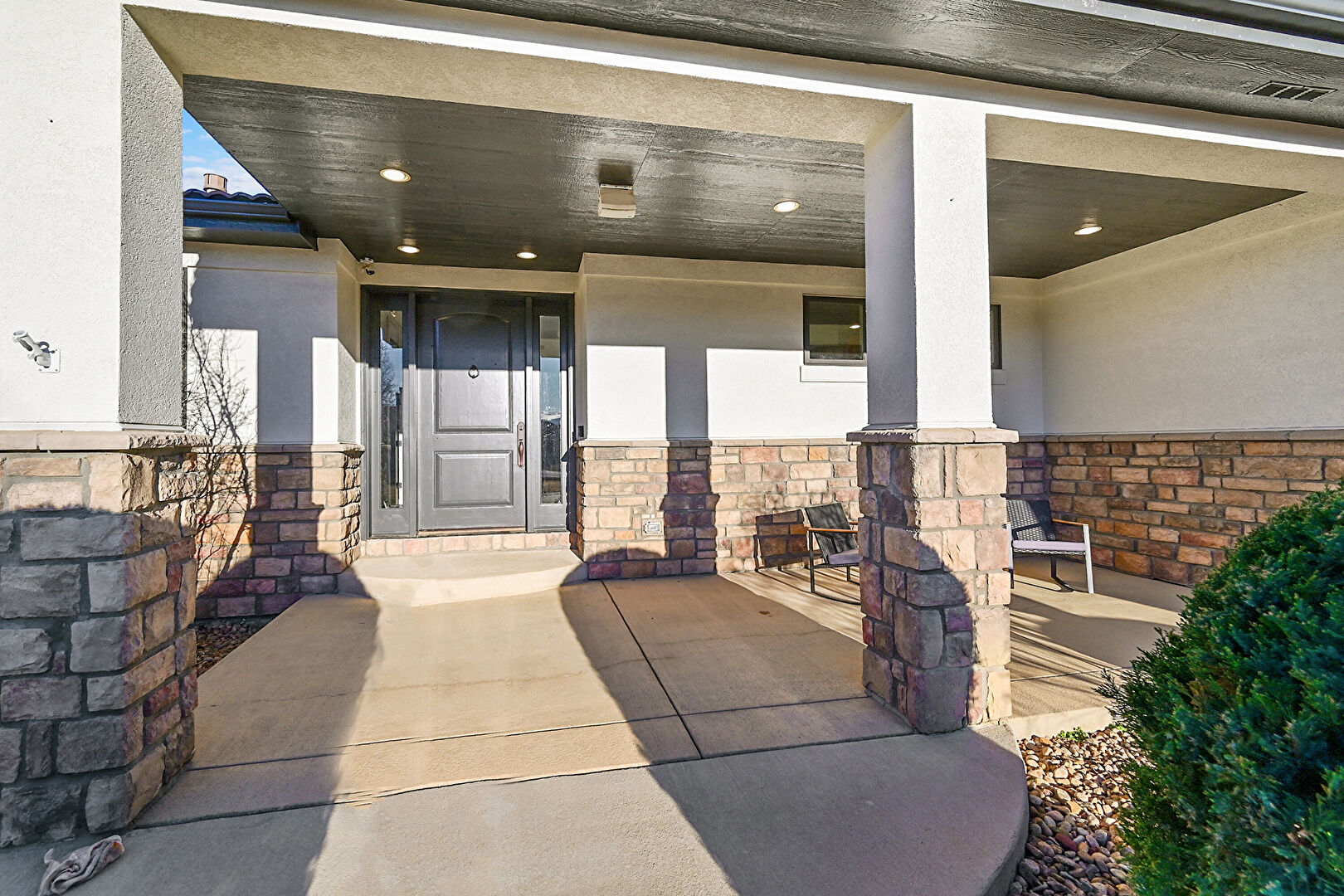 Downspout, Gutters, Porch, Stone Siding, Stucco Siding, Tile Roof, Stucco Siding, Vent
