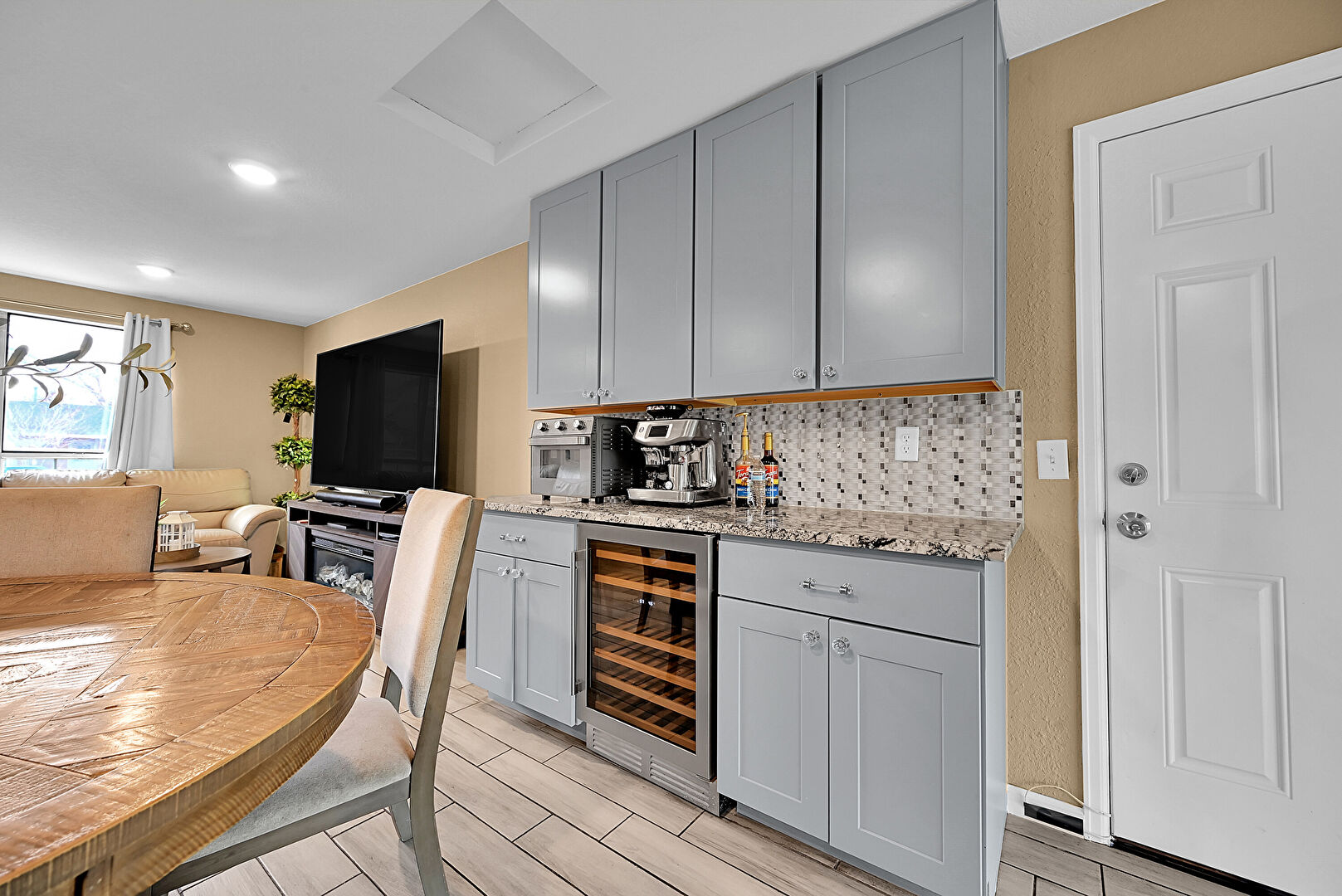 Gray Cabinets, Indoor Bar, Natural Light, Recessed Lighting, Shaker Cabinets, Stone Countertops, Wine Cooler, Wood Finish Floor, Drywall