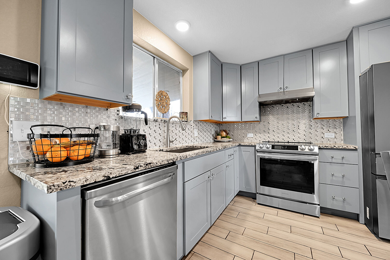 Baseboards Wall, Drywall, Gray Cabinets, L Shaped Kitchen, Natural Light, Opens To Living Area, Recessed Lighting, Shaker Cabinets, Stone Countertops, Wood Finish Floor, Natural Light, Vent