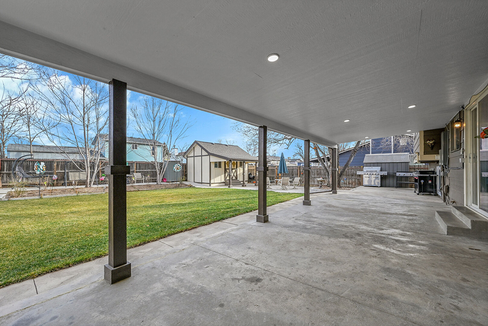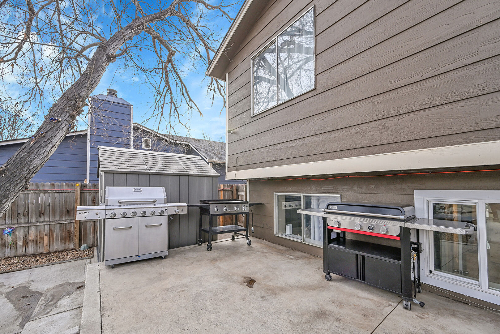 Fence, Grill, Lawn, Outdoor Structure, Patio, Residential View, Shed, Fence, Outdoor Structure