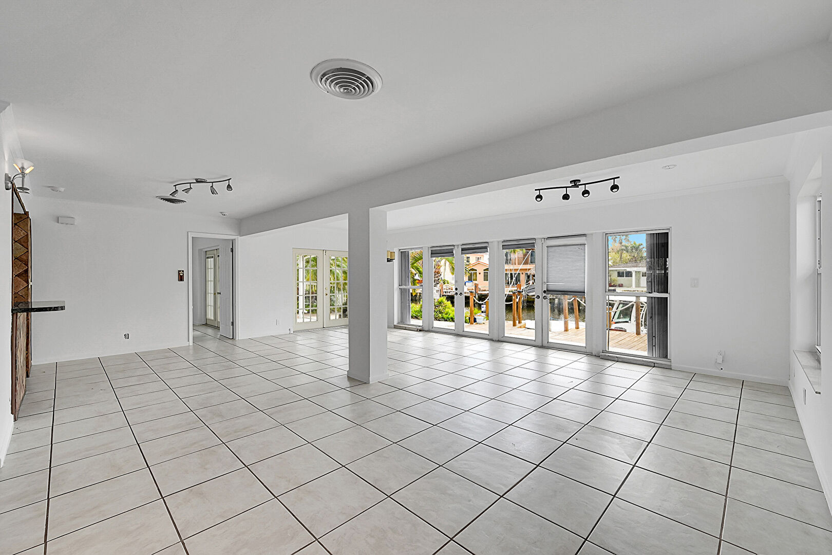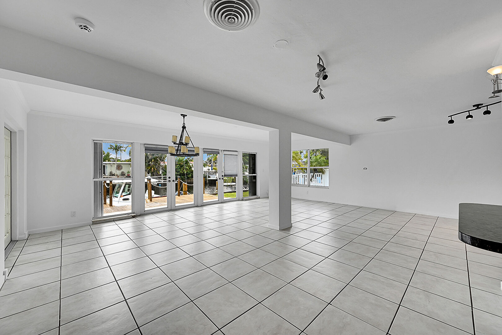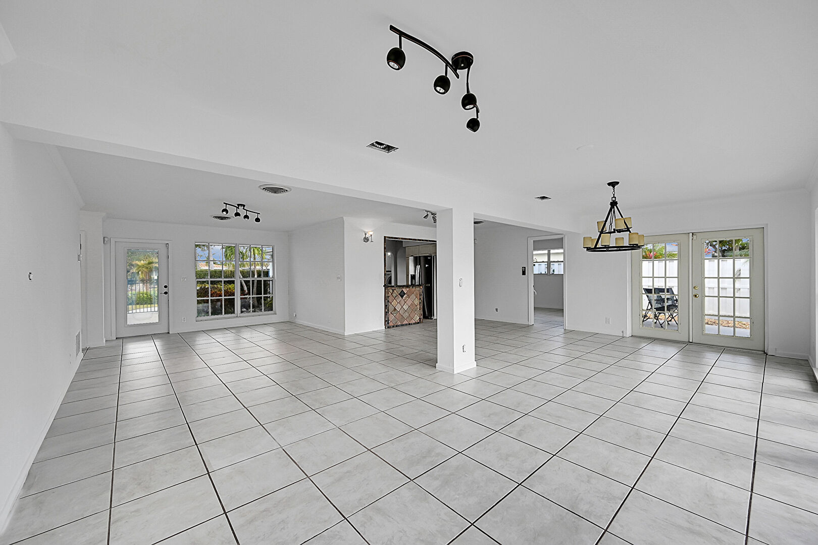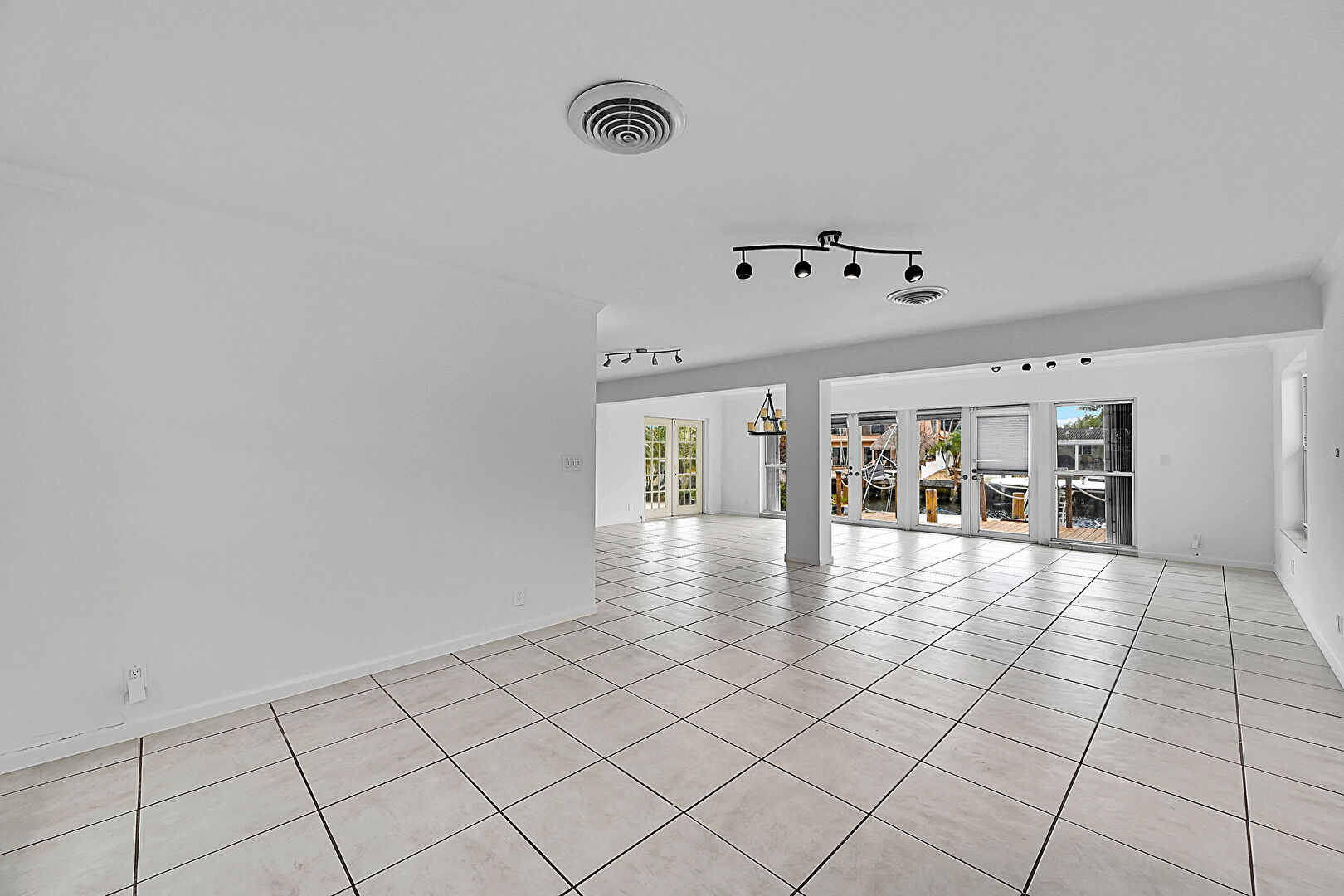 Baseboards Wall, Drywall, French Doors, Natural Light, Notable Chandelier, Tile Floor, Track Lighting, Vent, Drywall, Tile Floor