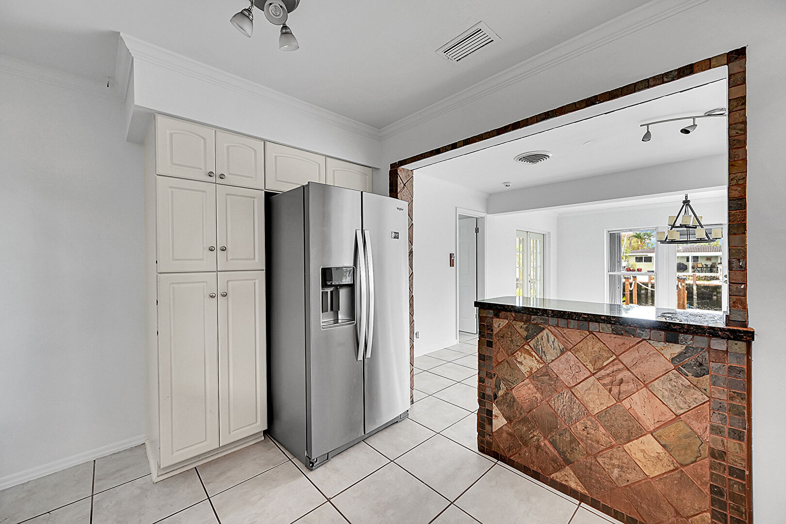 Arched Cabinets, Baseboards Wall, Crown Molding, Drywall, Glass Insert Cabinets, Laundry, Natural Light, Open Shelves, Raised Cabinets, Recessed Lighting, Stone Countertops, Tile Floor, Vent, Washer Dryer, Crown Molding, Pass Through Window, Tile Floor