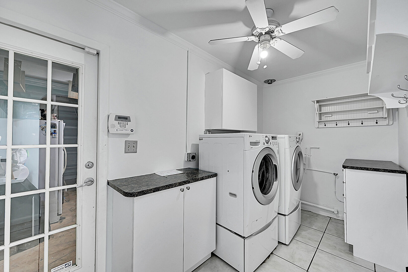 Baseboards Wall, Ceiling Fan, Crown Molding, Drywall, Laundry, Tile Floor, Washer Dryer, Natural Light, Tile Floor