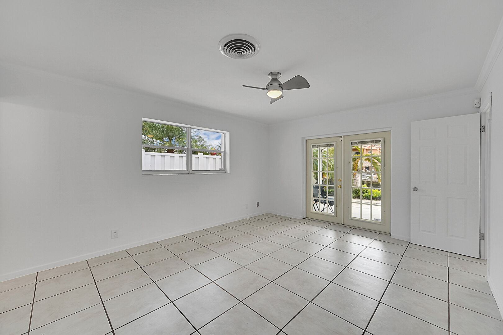 Baseboards Wall, Crown Molding, Drywall, French Doors, Natural Light, Tile Floor, Track Lighting, Vent, Drywall, Natural Light