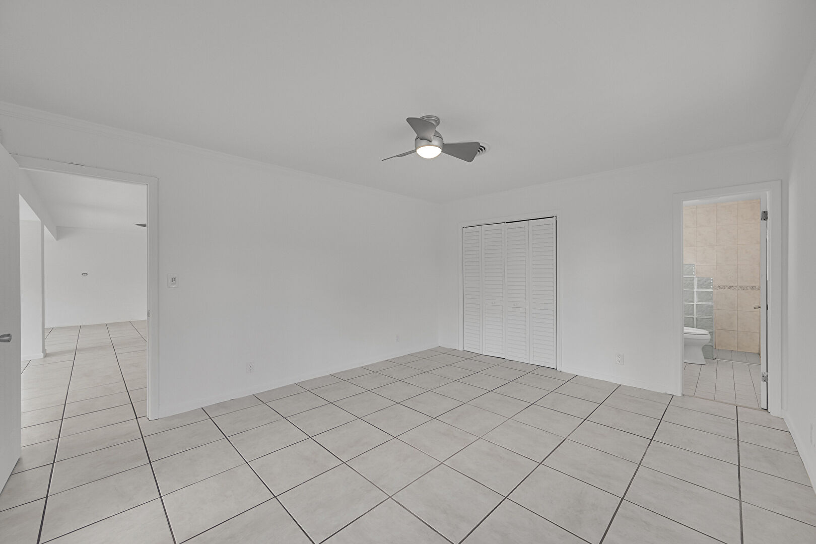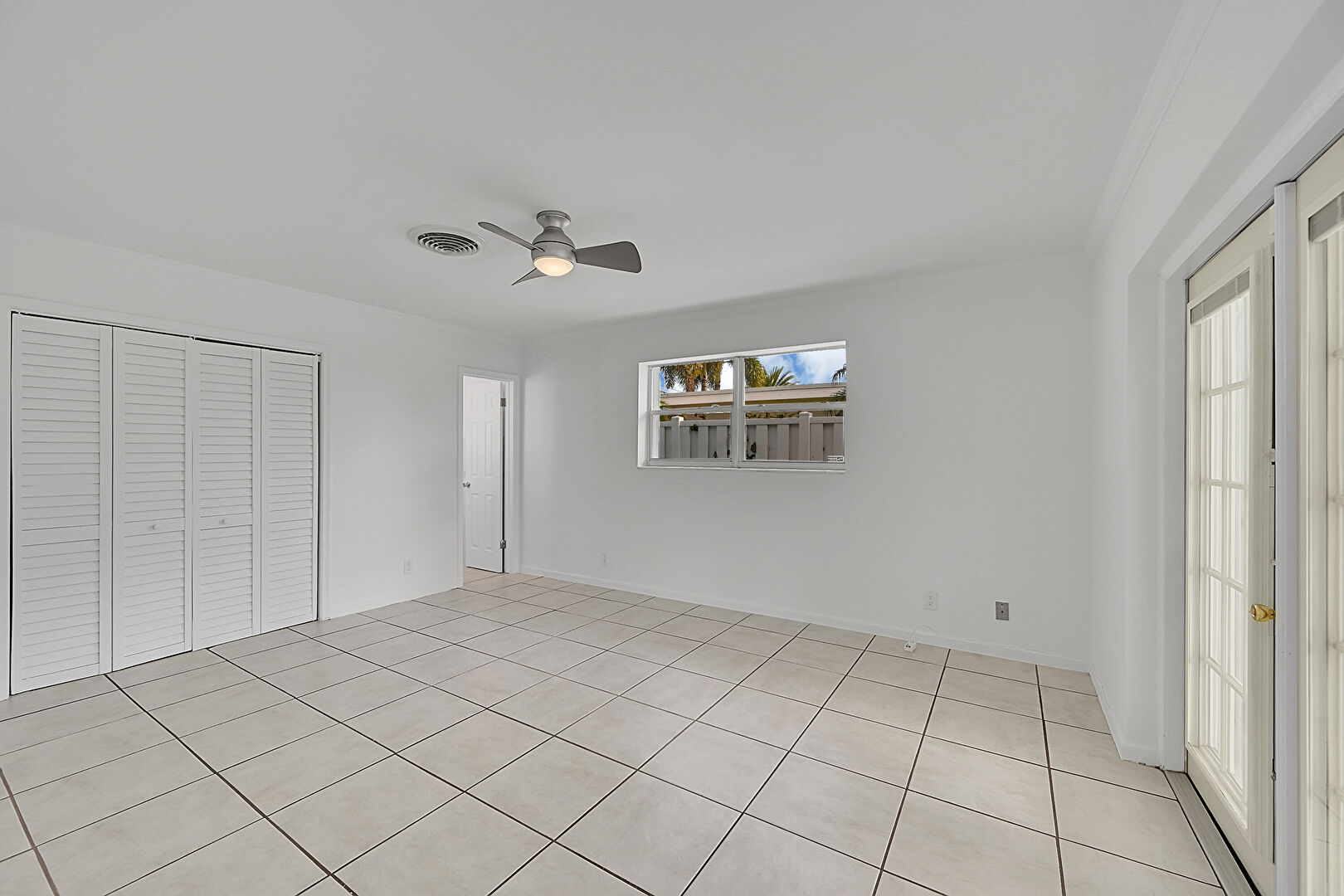 Baseboards Wall, Ceiling Fan, Closet, Drywall, Ensuite Bathroom, French Doors, Natural Light, Tile Floor, Vent, Ceiling Fan, Tile Floor, Vent