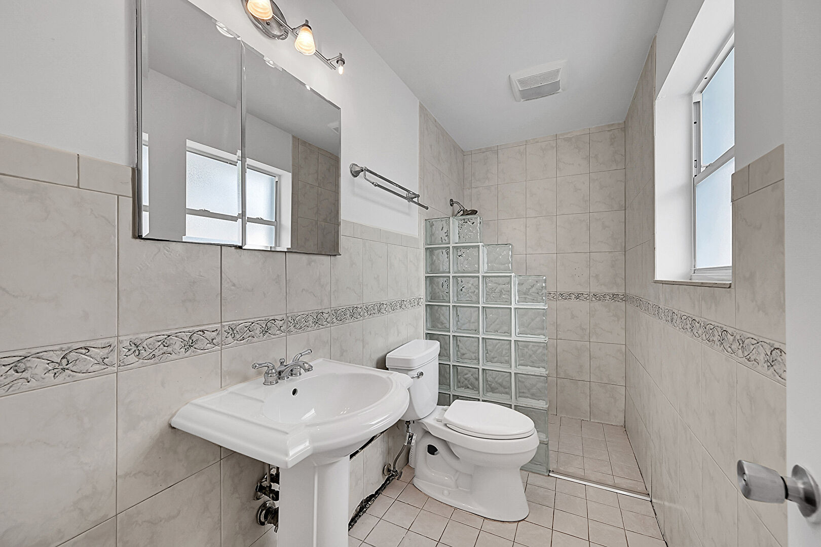 Full Bathroom, Tile Floor, Tile Wall, Vent, Natural Light