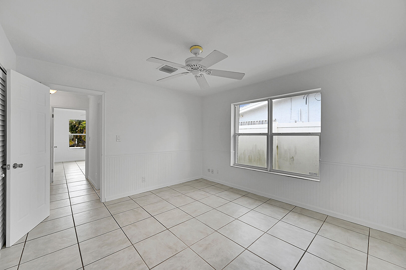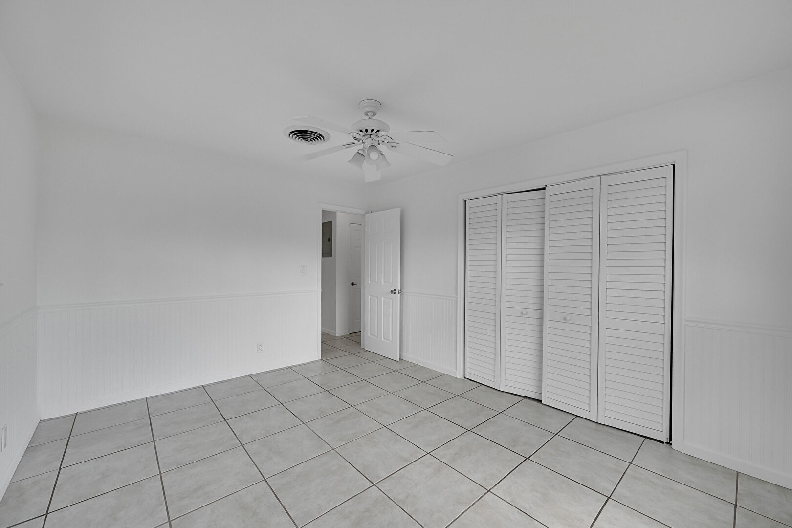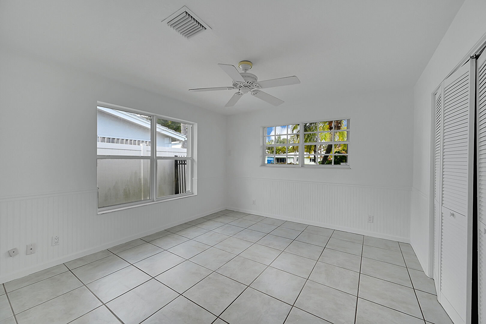 Ceiling Fan, Closet, Drywall, Natural Light, Tile Floor, Vent, Wainscot Wall, Closet, Tile Floor, Vent, Wood Wall