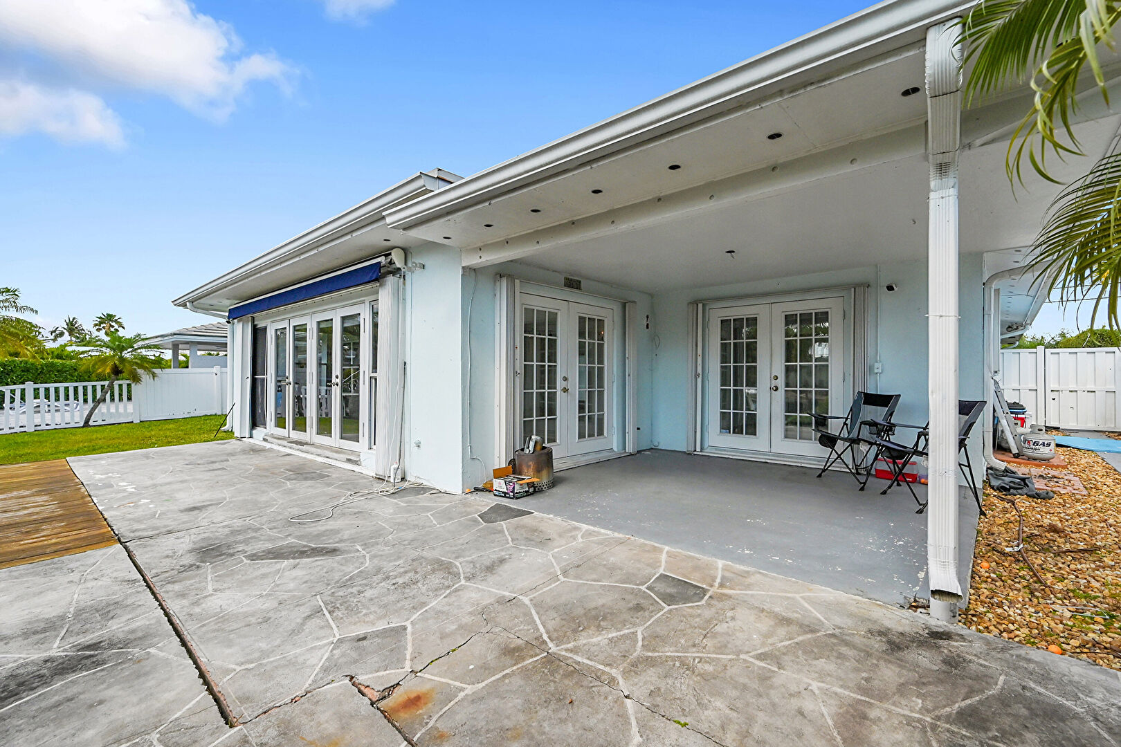 Downspout, French Doors, Gutters, Lawn, Patio, Stucco Siding, Fence