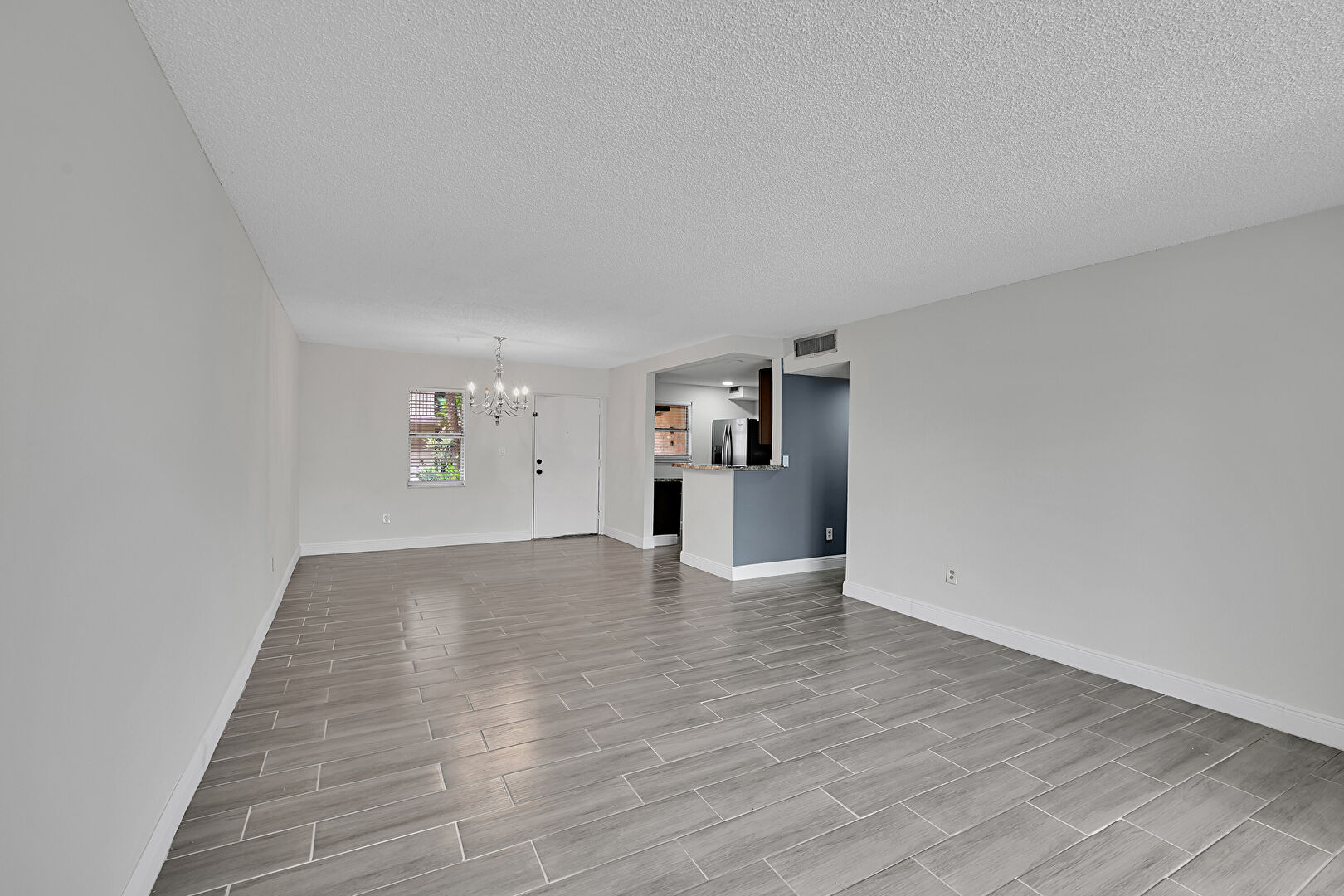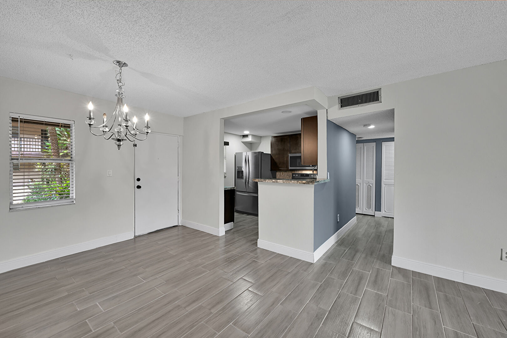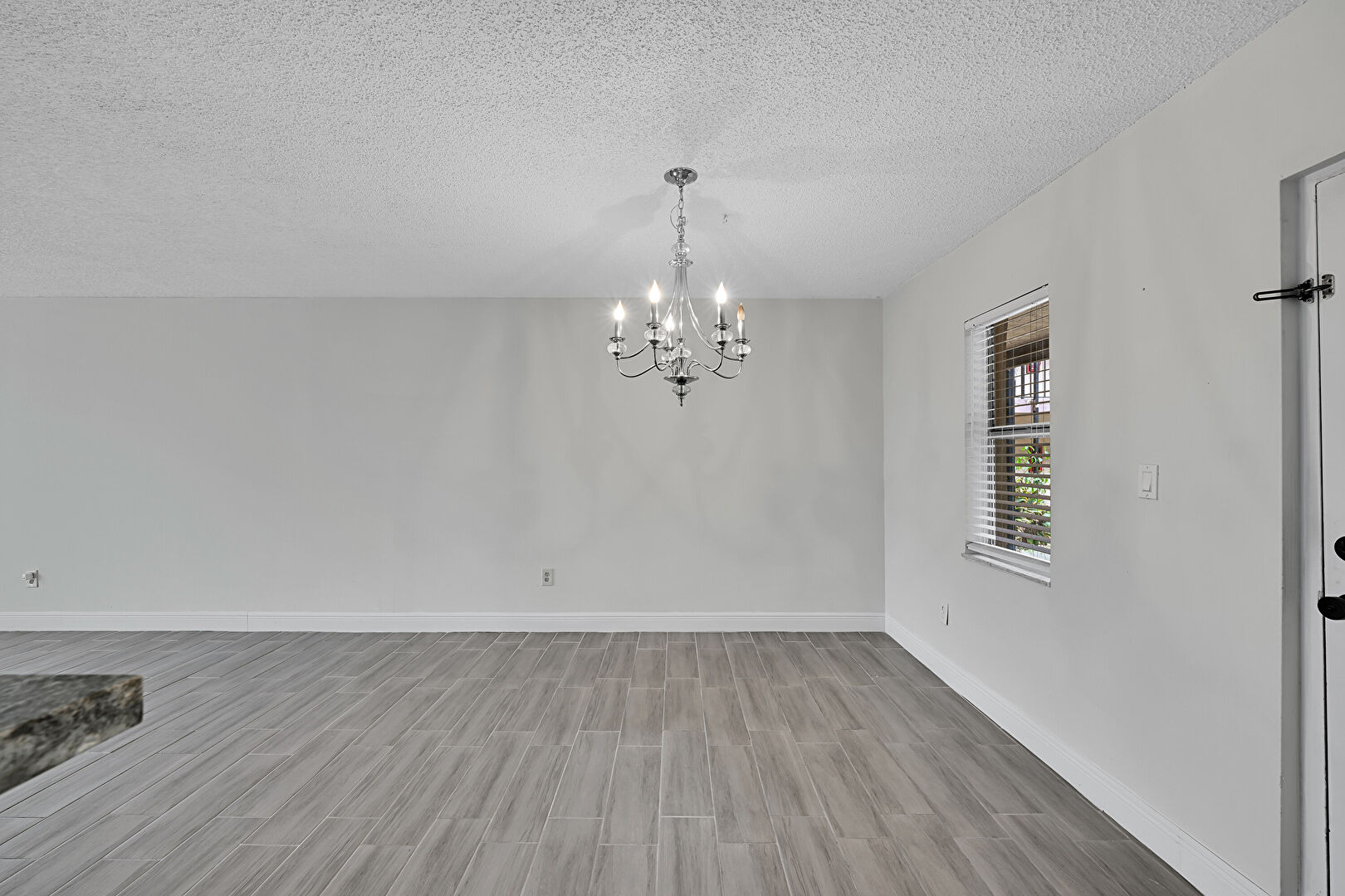 Baseboards Wall, Drywall, Natural Light, Textured Ceiling, Wood Finish Floor, Notable Chandelier