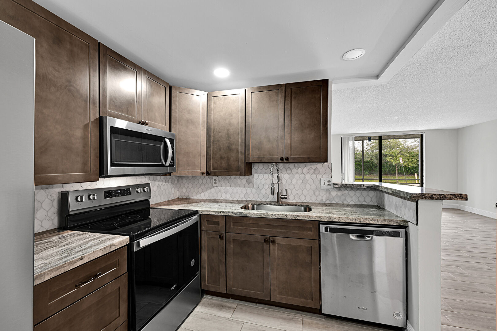 Baseboards Wall, Dark Brown Cabinets, Drywall, Kitchen Peninsula, Natural Light, Notable Chandelier, Opens To Living Area, Pendant Lighting, Recessed Lighting, Shaker Cabinets, Stone Countertops, Textured Ceiling, U Shaped Kitchen, Vent, Wood Finish Floor, Dark Brown Cabinets, Drywall, Recessed Lighting, Wood Finish Floor