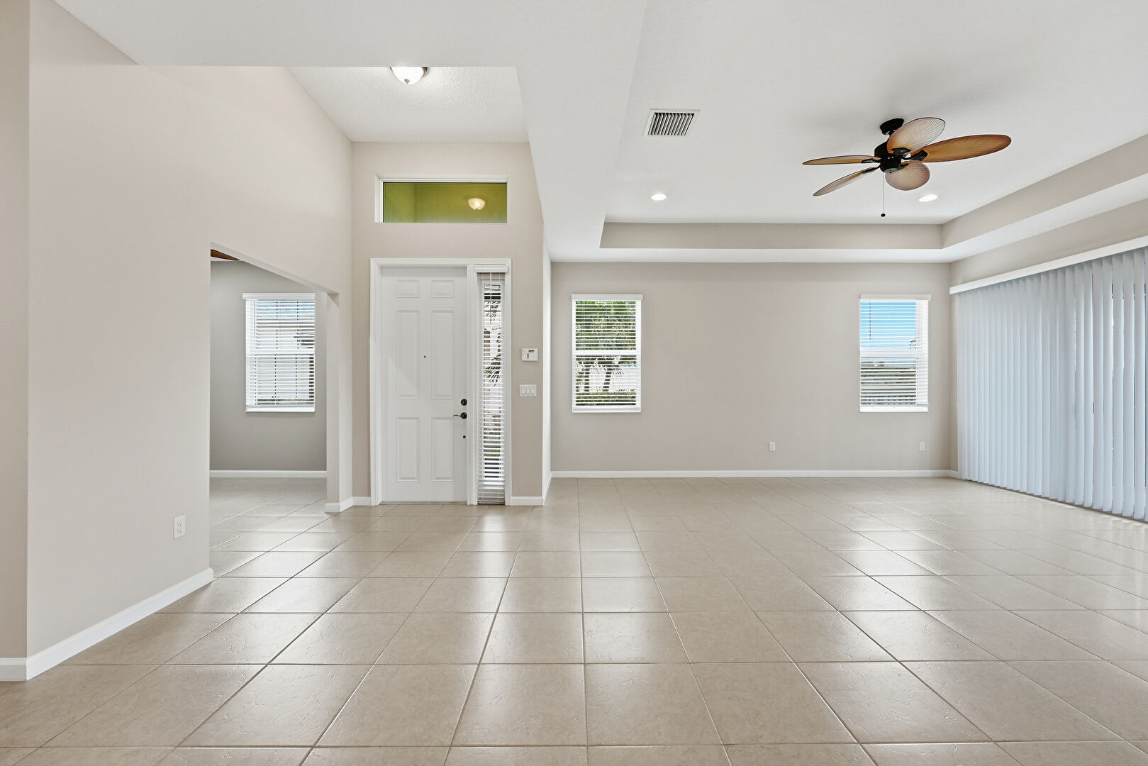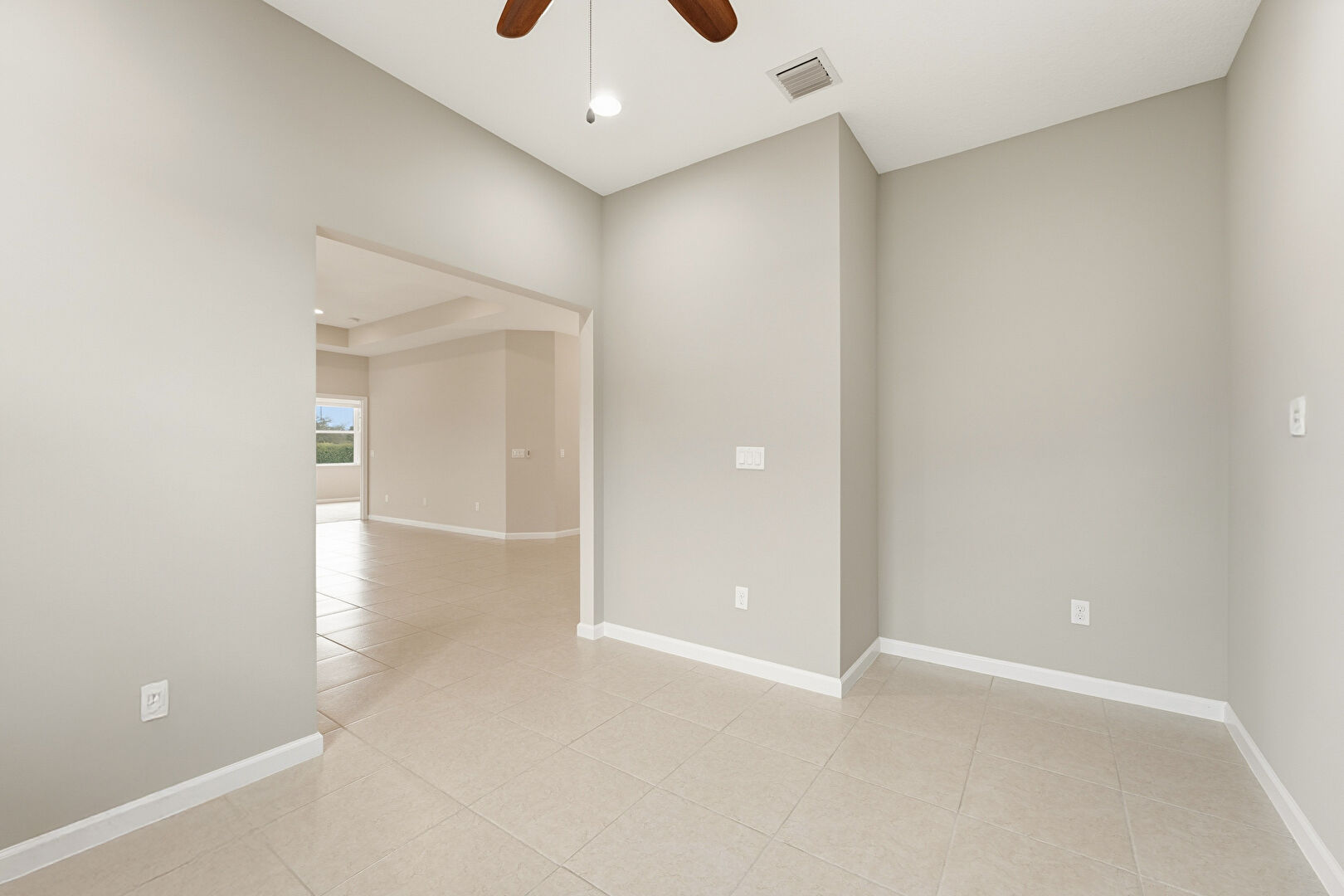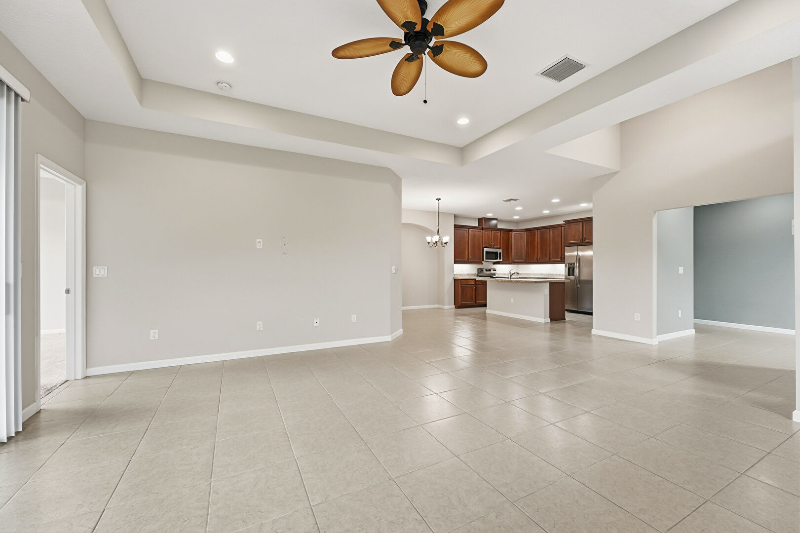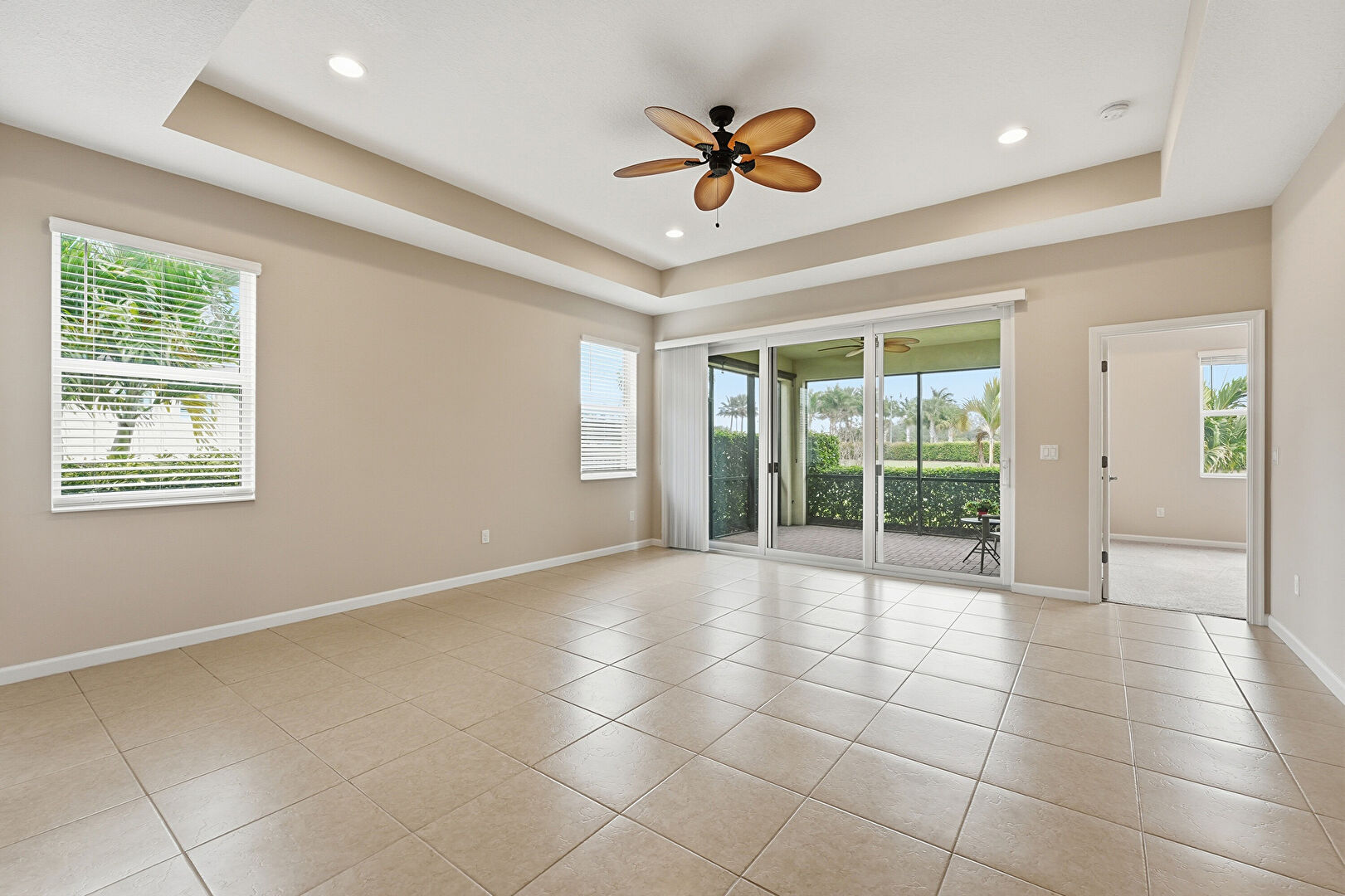 Baseboards Wall, Ceiling Fan, Drywall, Natural Light, Recessed Lighting, Tile Floor, Vent, Tray Ceiling