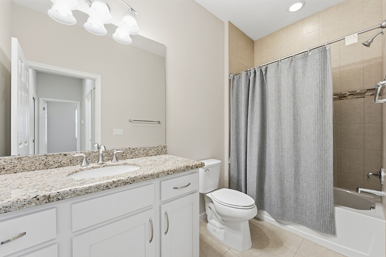 Combined Bath Shower, Drywall, Recessed Lighting, Tile Floor, Vanity, Full Bathroom