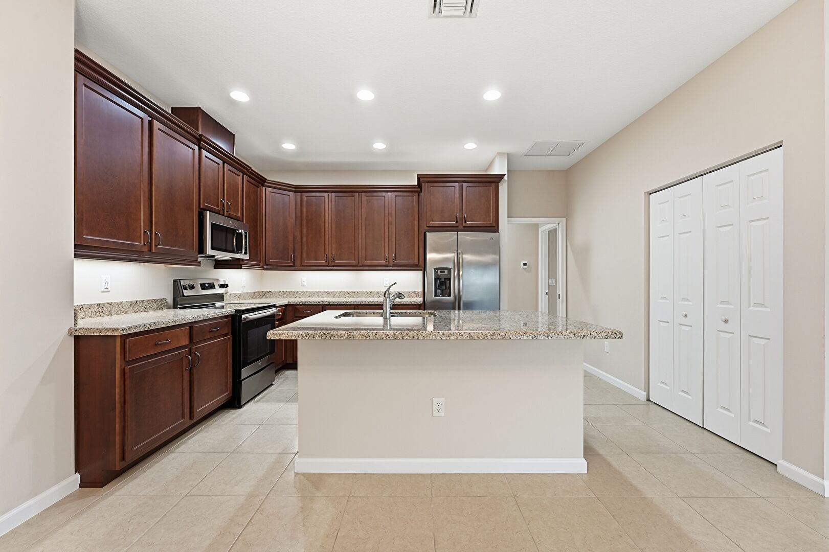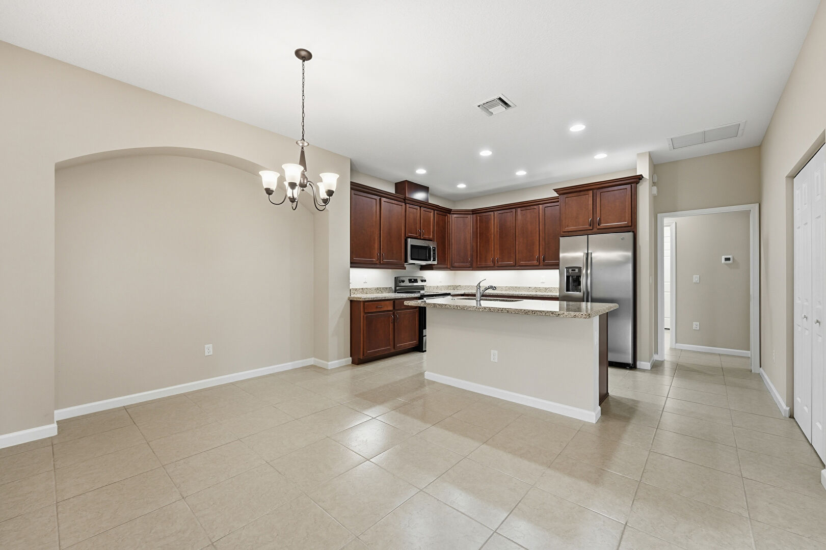 Baseboards Wall, Crown Molding Cabinets, Dark Brown Cabinets, Drywall, Kitchen Island, L Shaped Kitchen, Notable Chandelier, Opens To Living Area, Recessed Lighting, Shaker Cabinets, Stone Countertops, Tile Floor, Vent, Dark Brown Cabinets, Pendant Lighting, Stone Countertops
