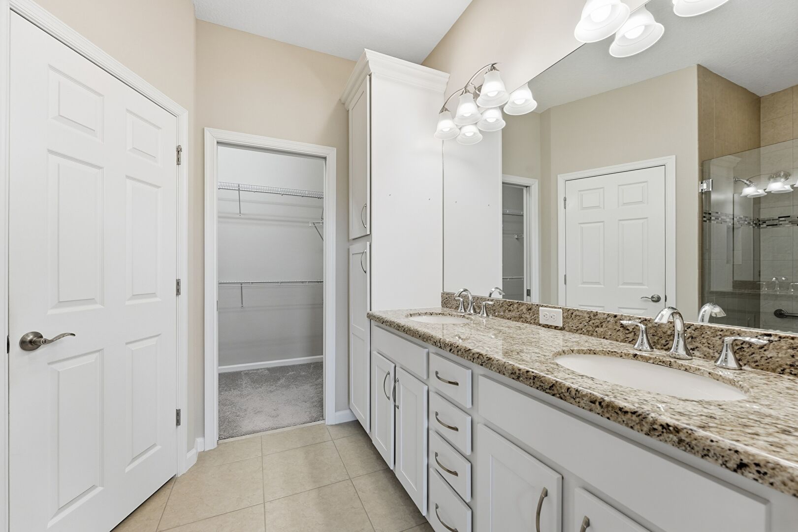 Baseboards Wall, Double Vanity, Drywall, Full Bathroom, Notable Chandelier, Recessed Lighting, Tile Floor, Walk In Closet, Carpet, Water Closet
